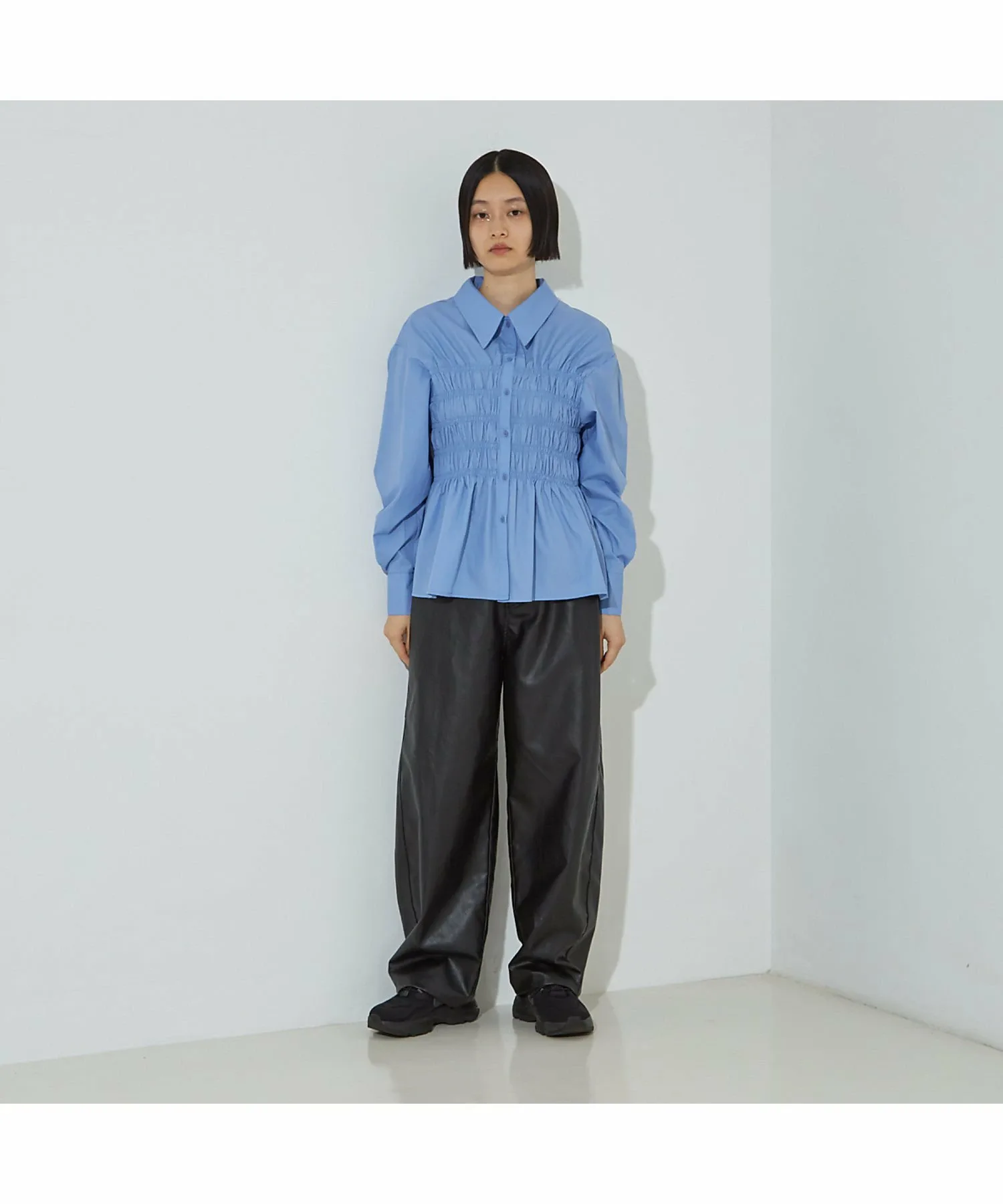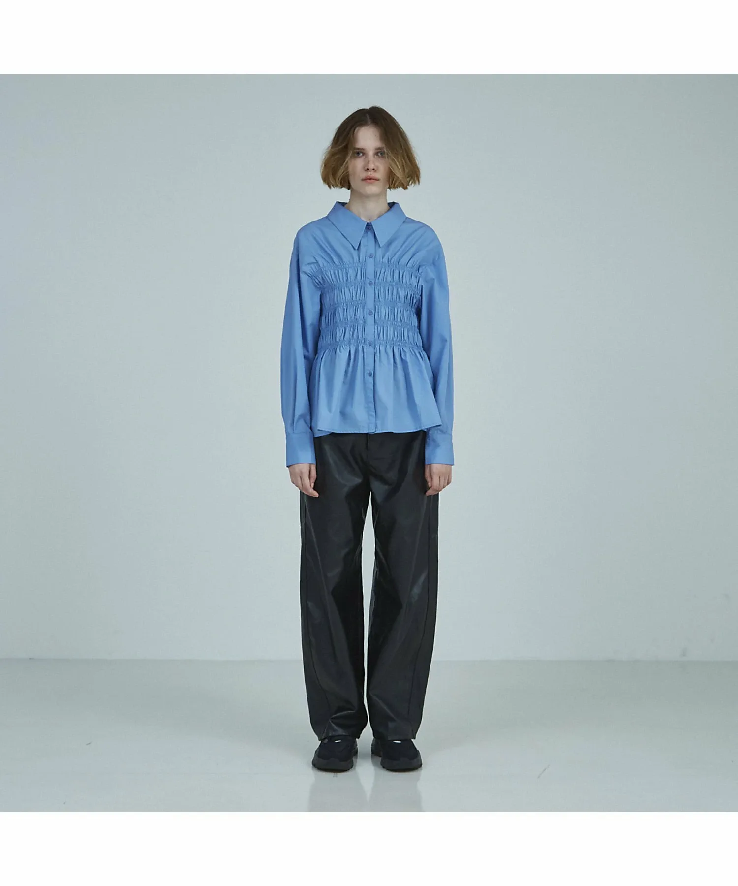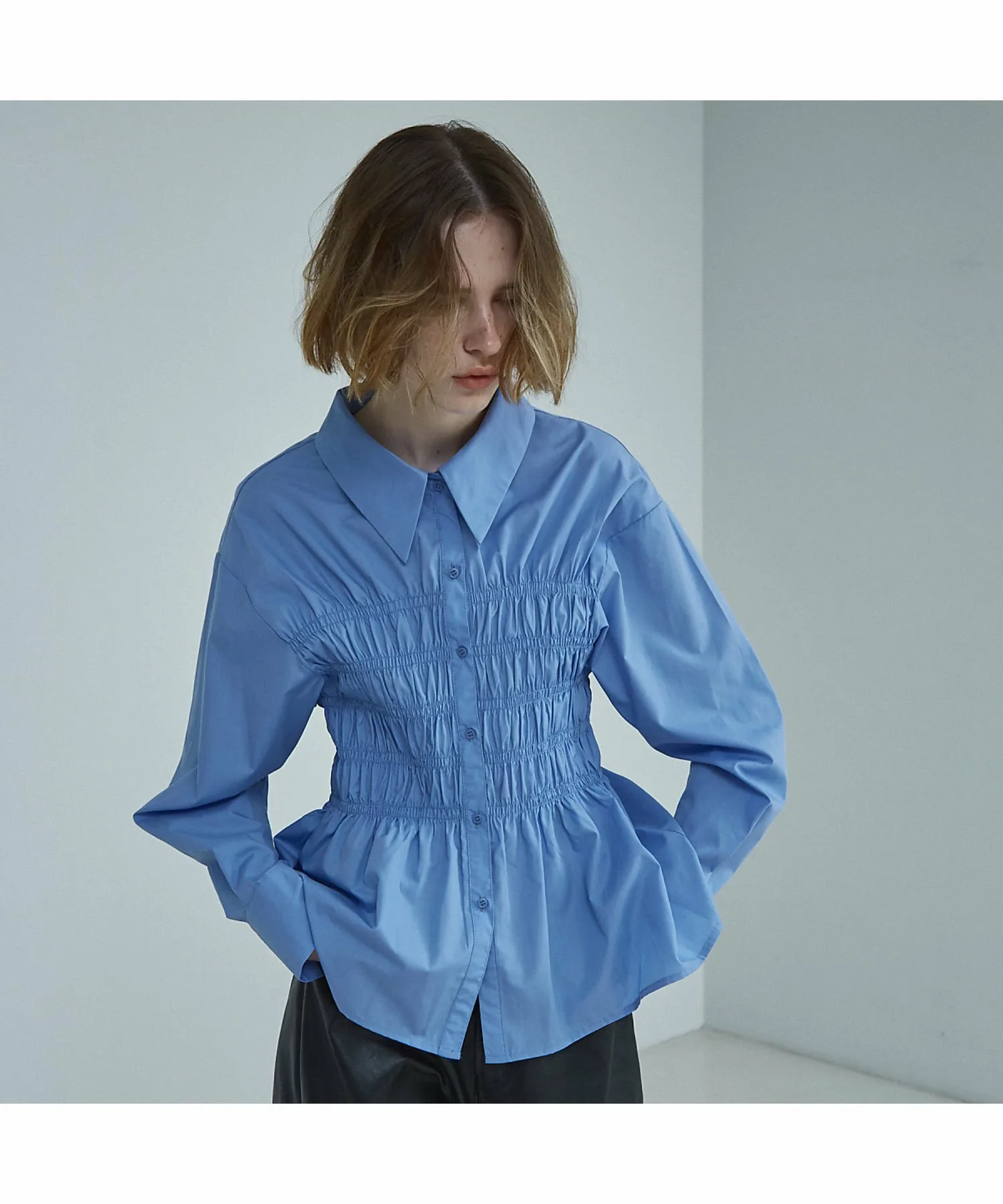 Рубашка со сборками по всей длине, создающими эффект надетого поверх неё бюстье. Эта изысканная вещь идеально подходит для этого сезона и дополнит ваш образ всего одним элементом. Сборки расположены посередине, что создает потрясающий эффект стройности.