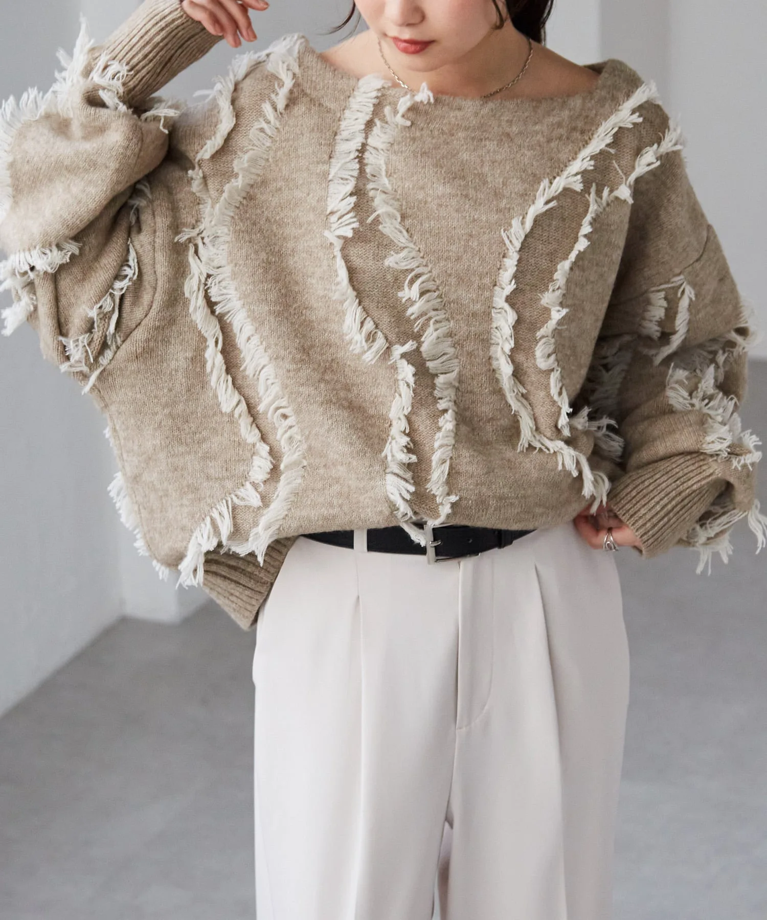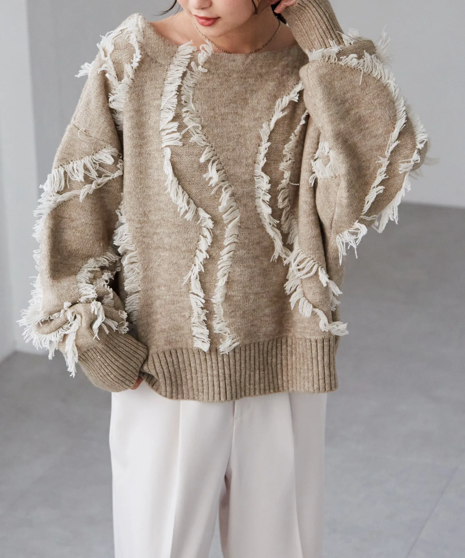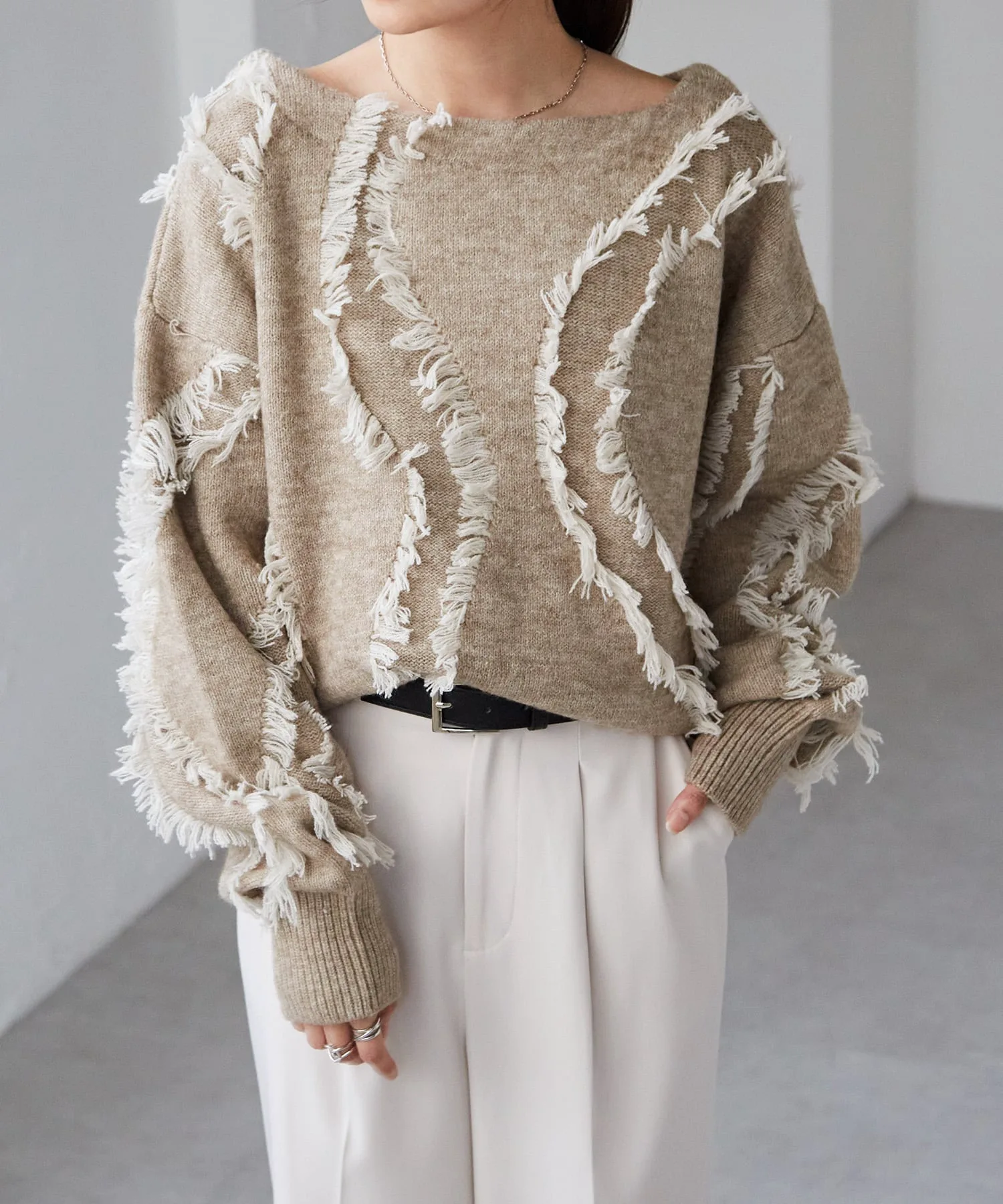 Красивый, элегантный трикотаж с бахромой и вырезом-лодочкой, создающий ощущение комфорта.