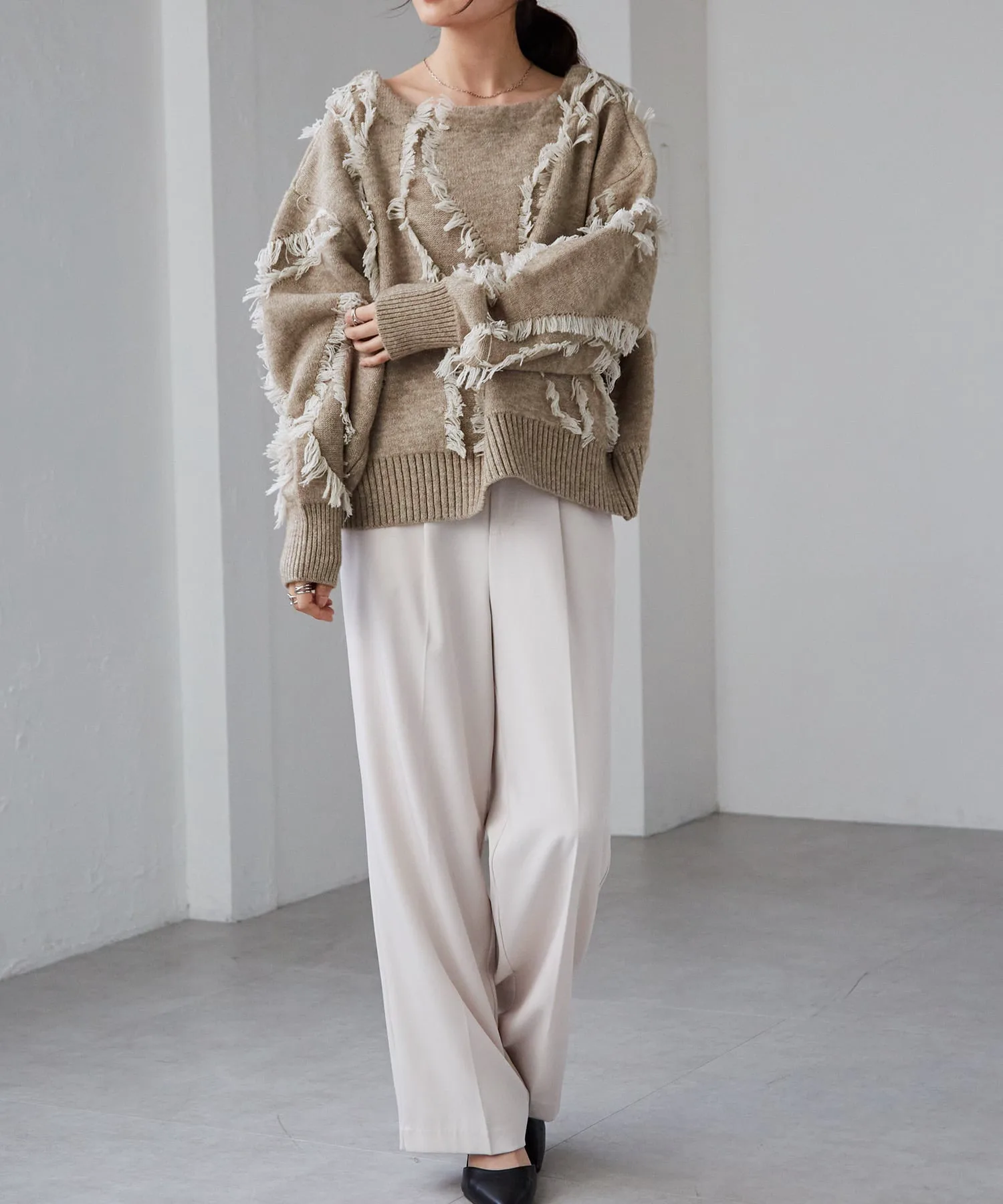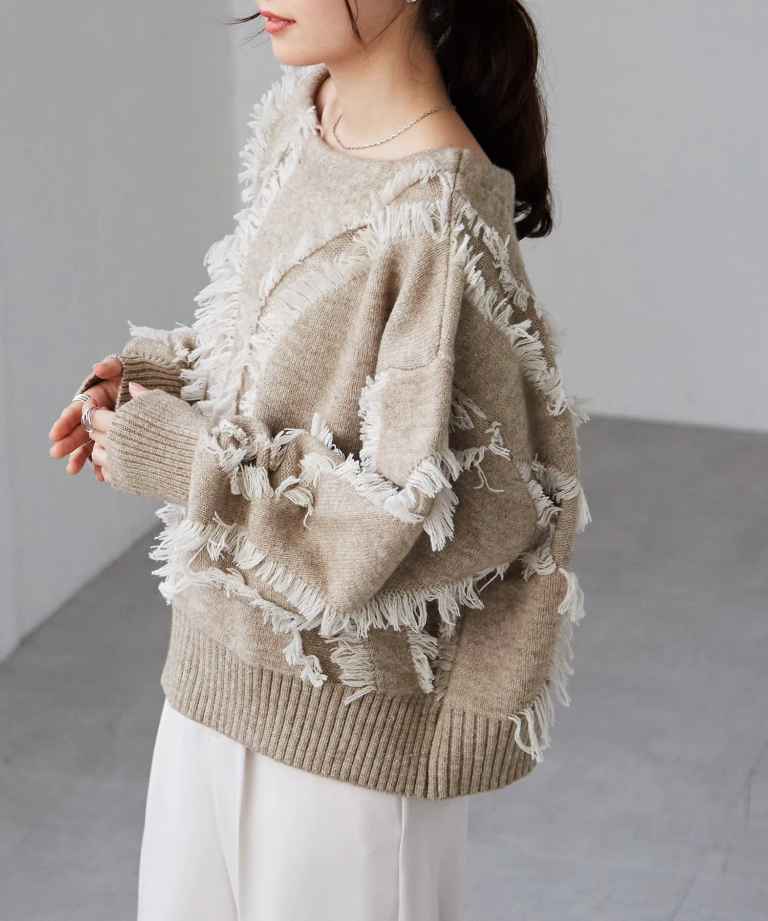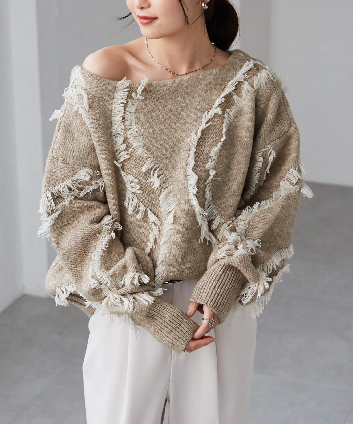 Красивый, элегантный трикотаж с бахромой и вырезом-лодочкой, создающий ощущение комфорта.