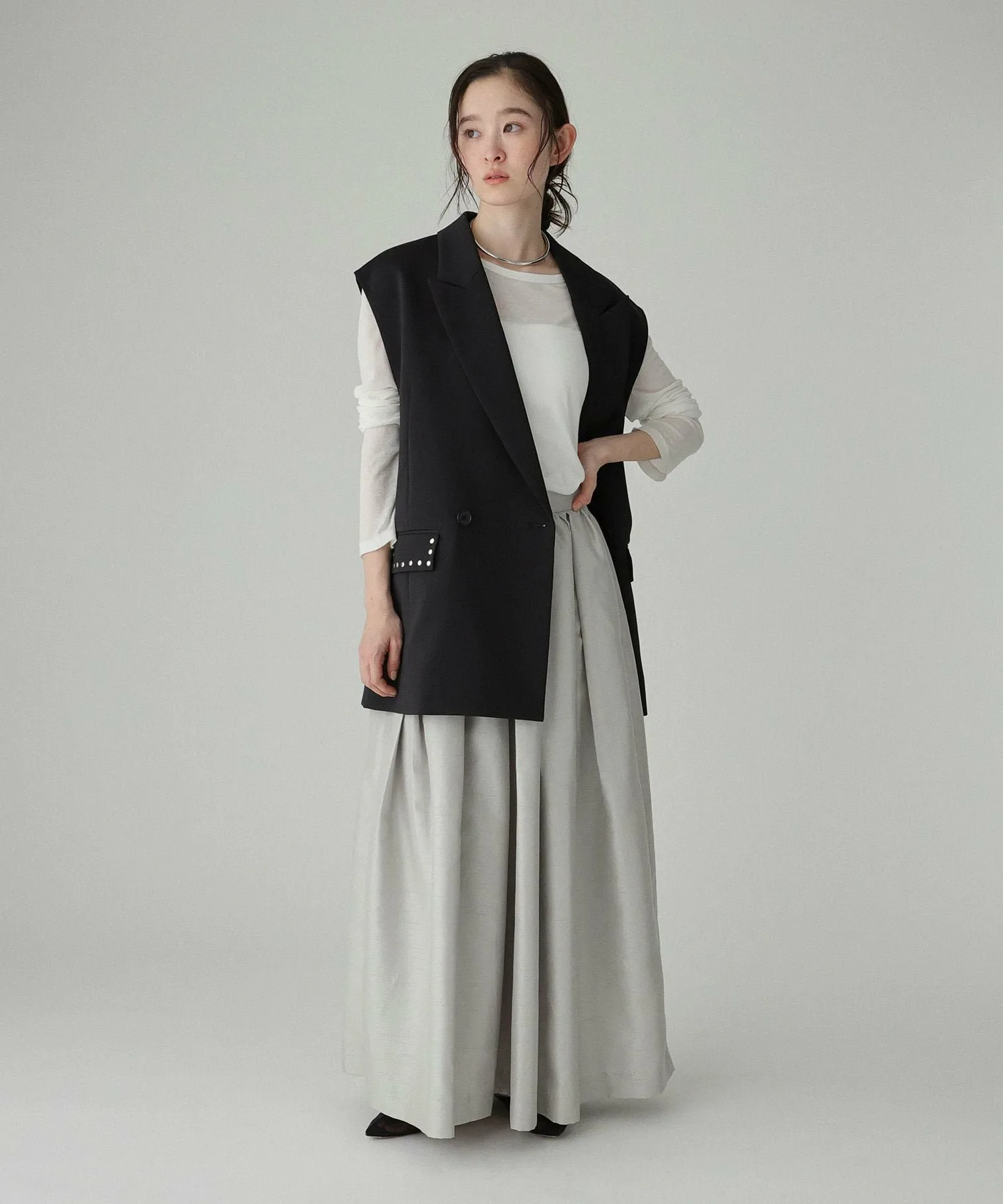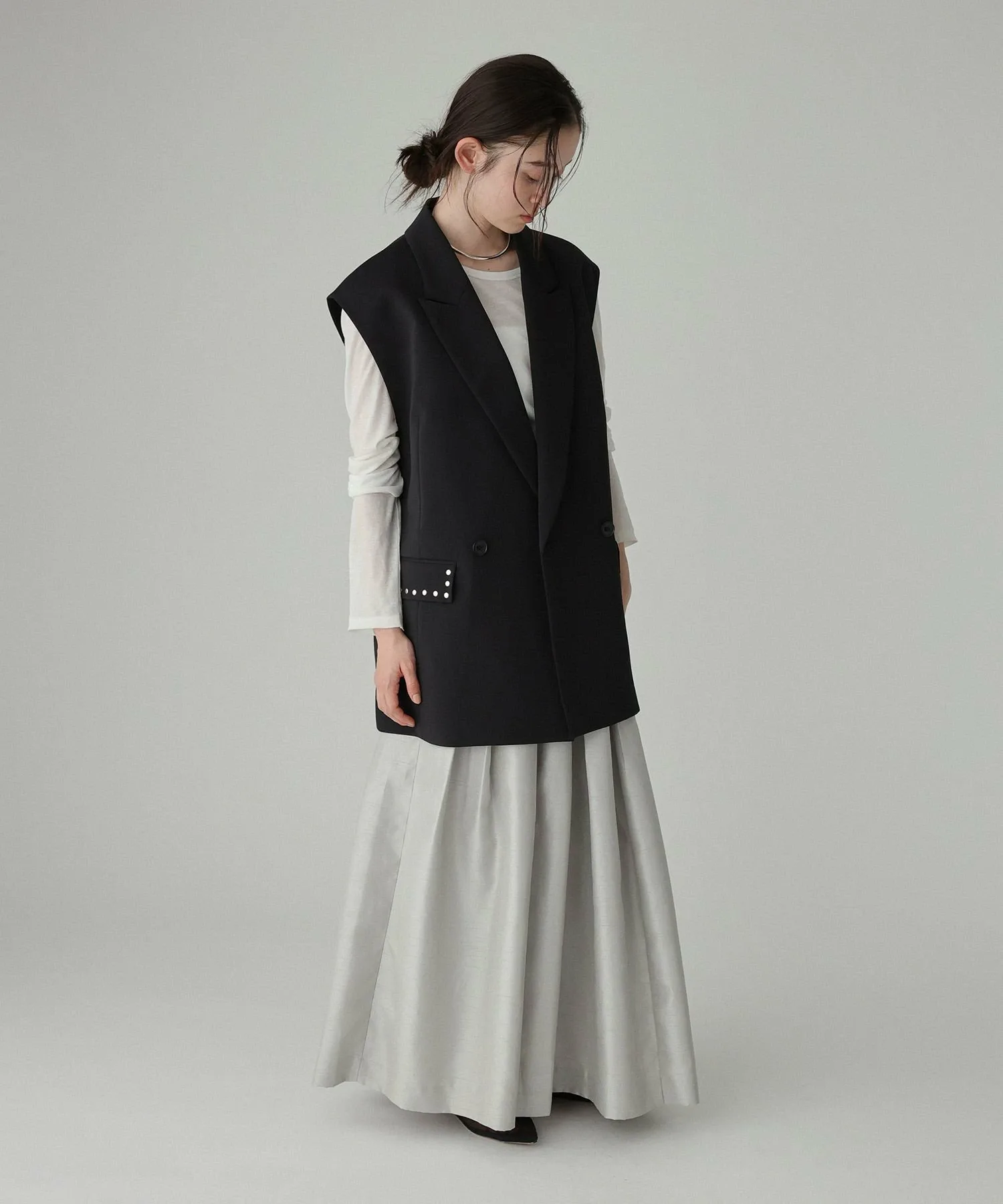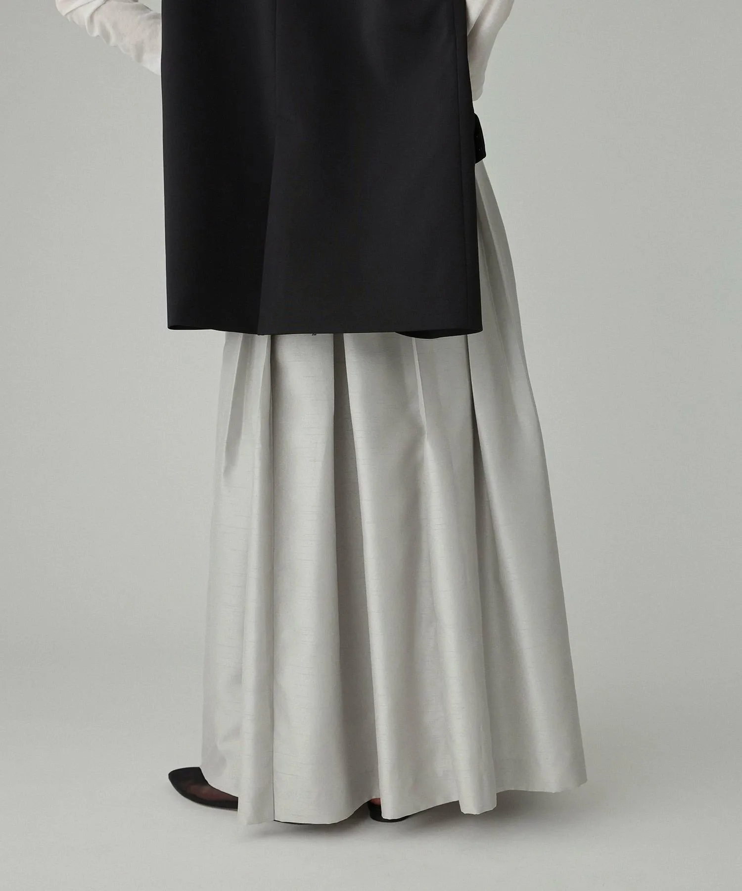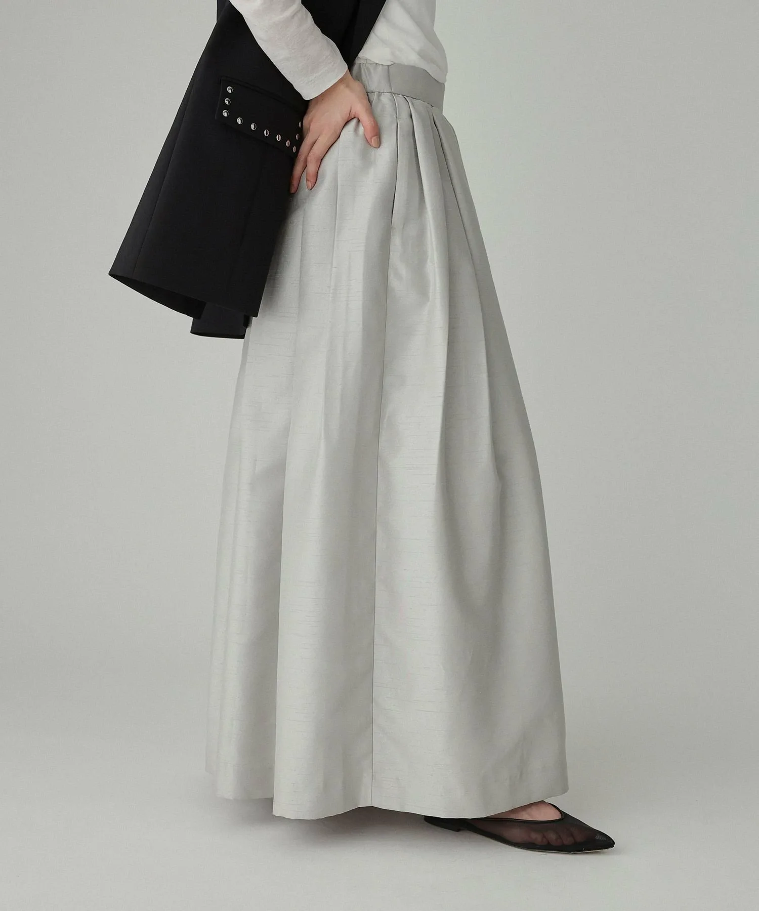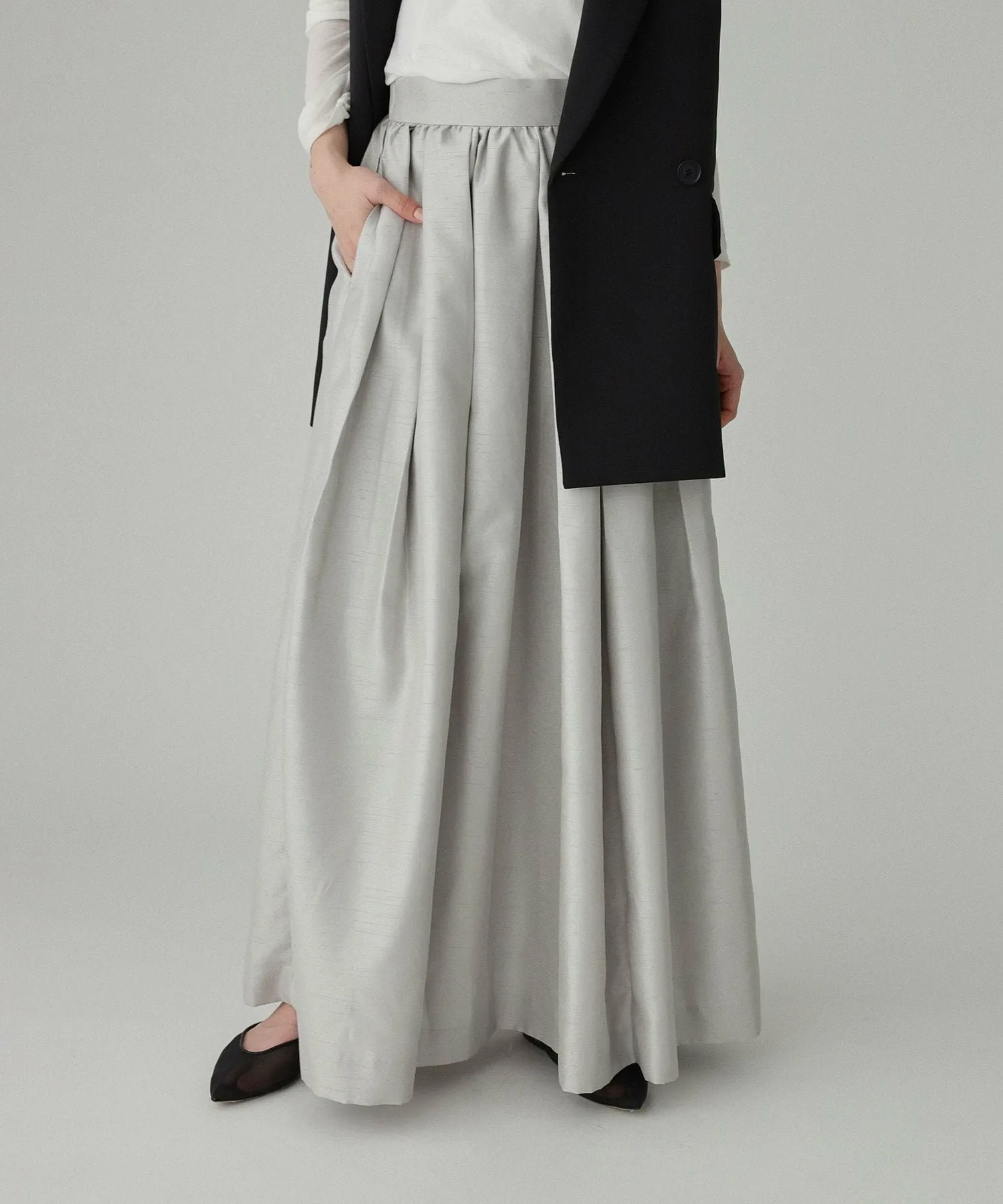 - Макси-юбка с элегантным блеском и не слишком выраженным силуэтом, характерным для ткани шантунг.