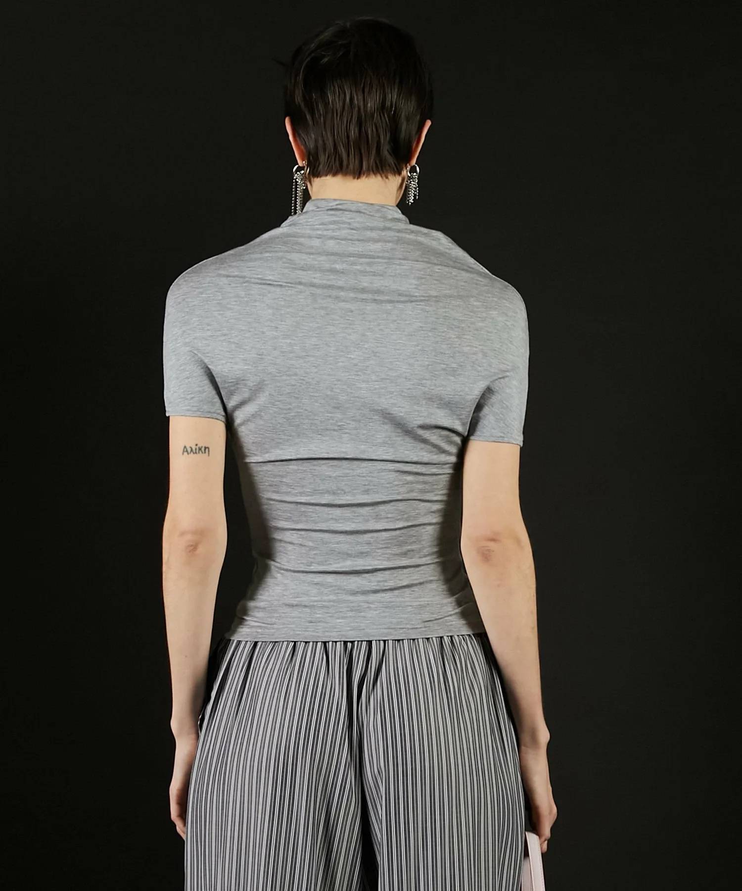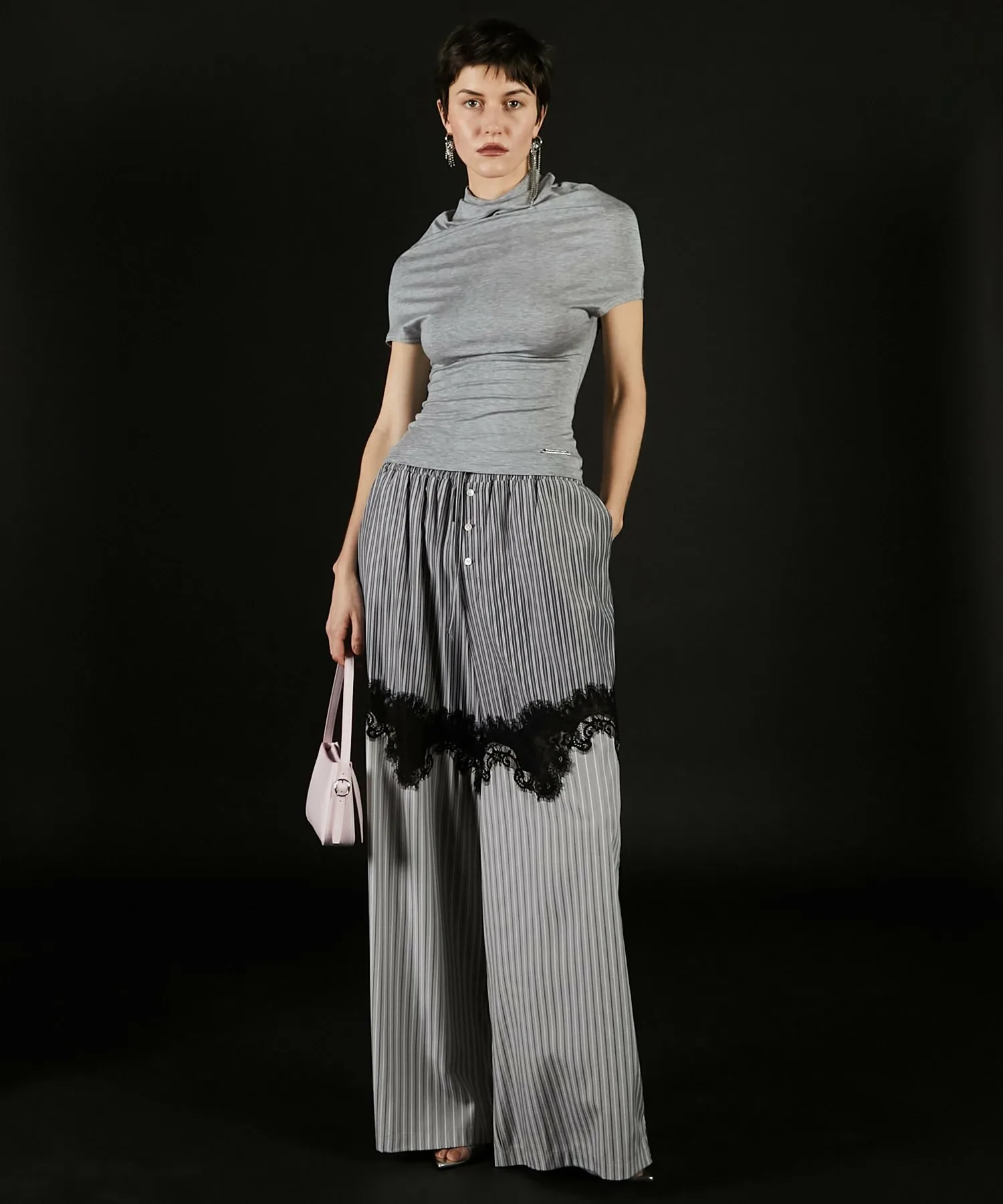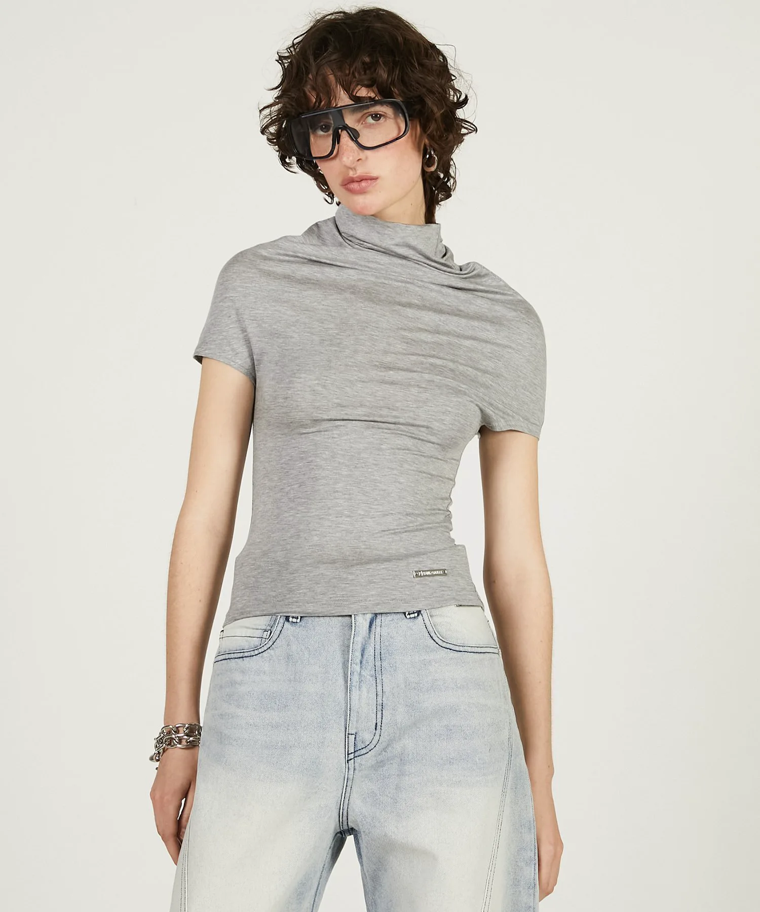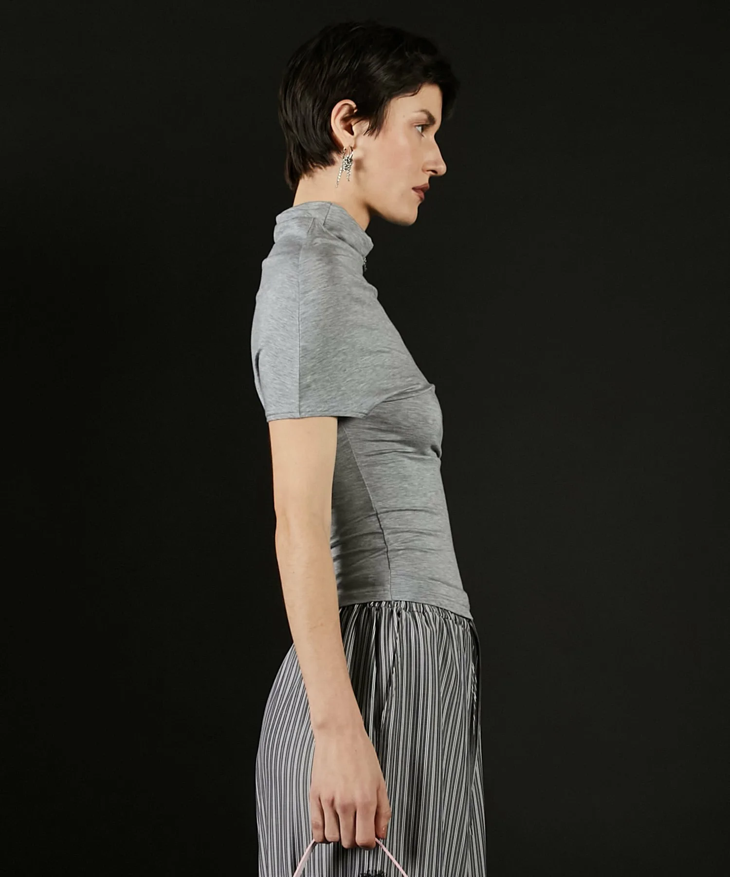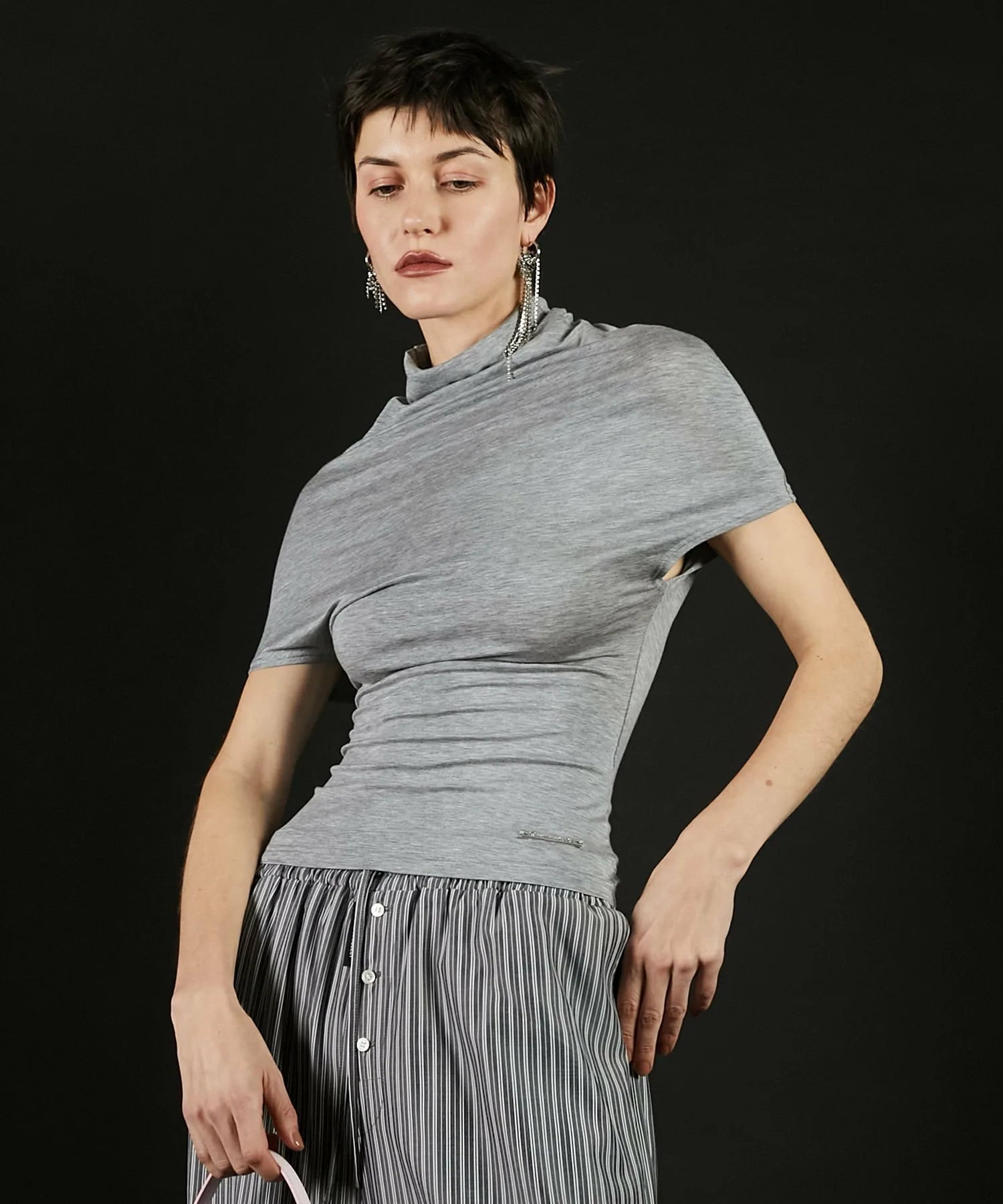 Минималистичный крой и пошив с воротником-хомутом в качестве центрального элемента.