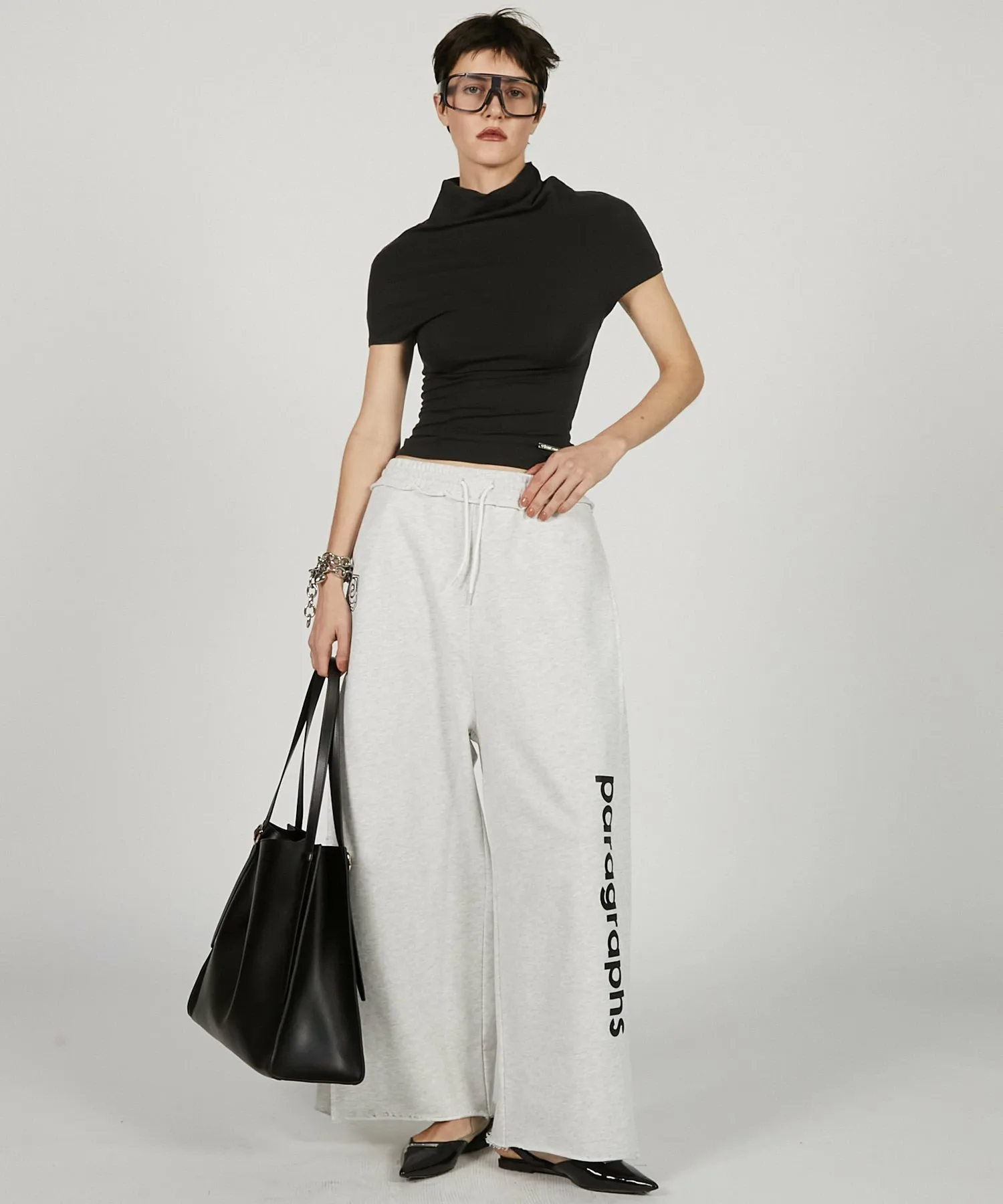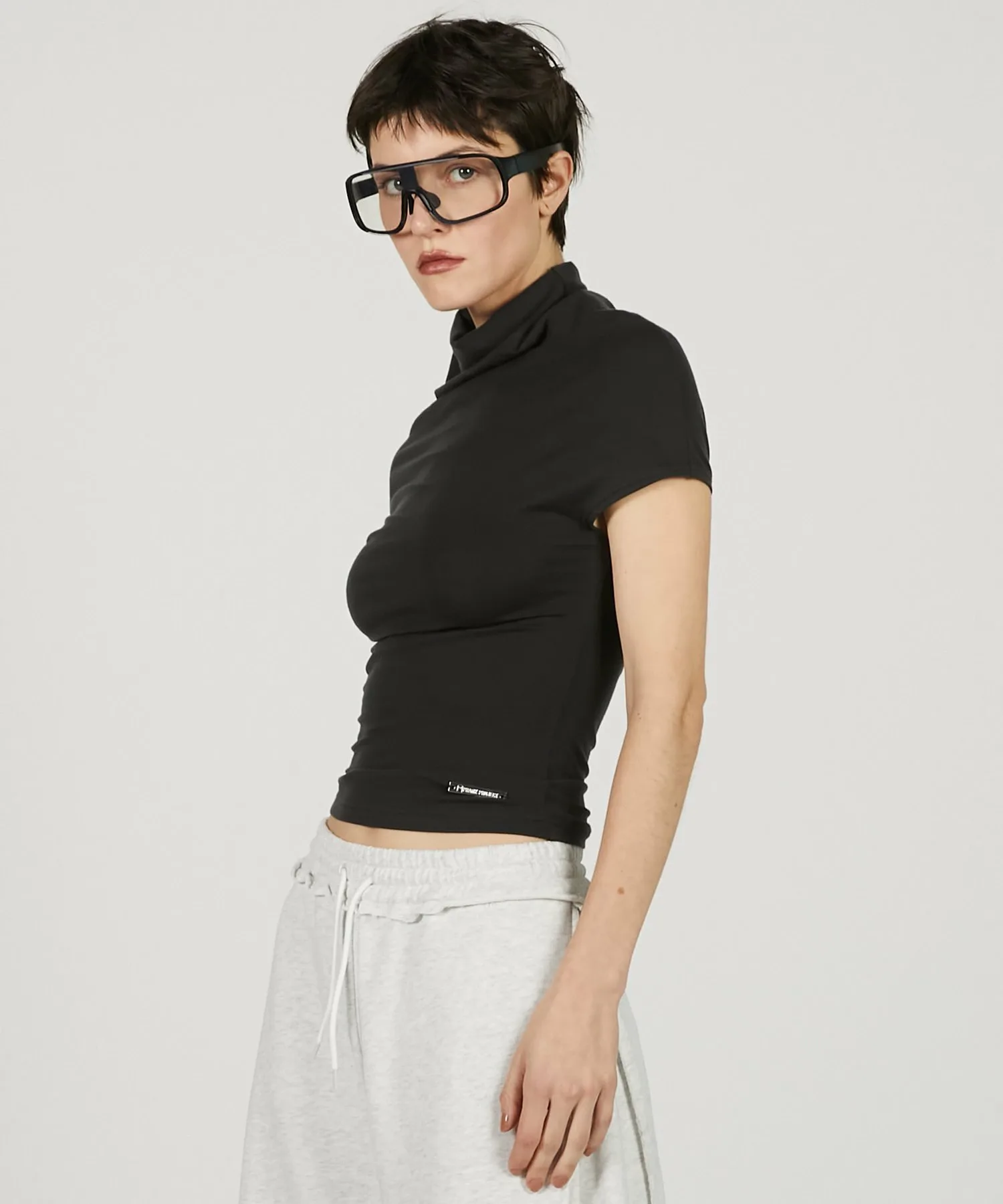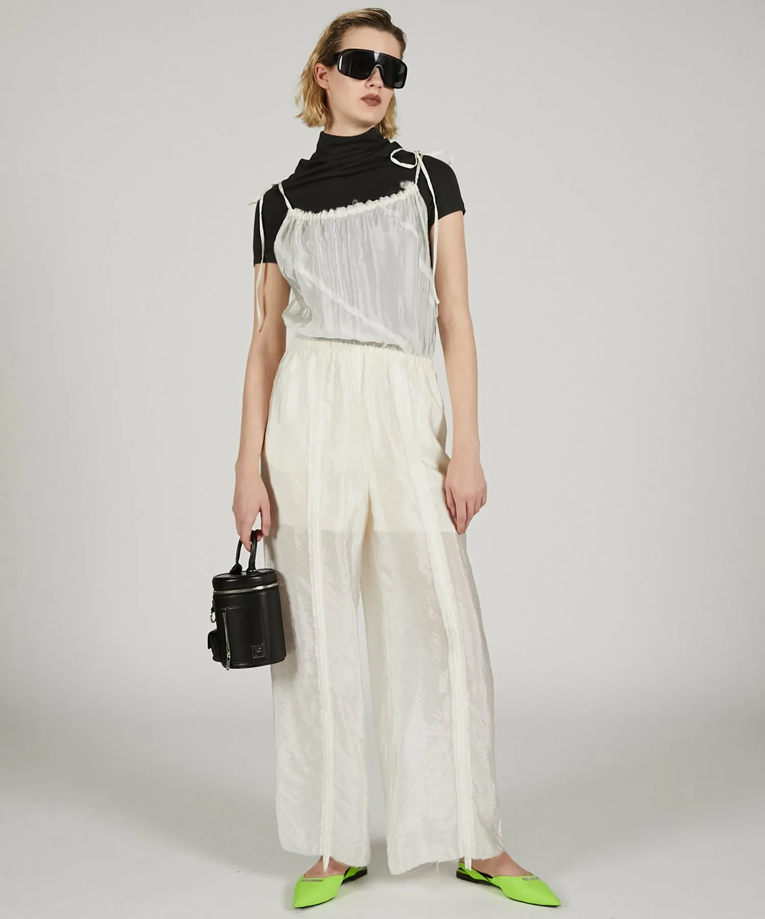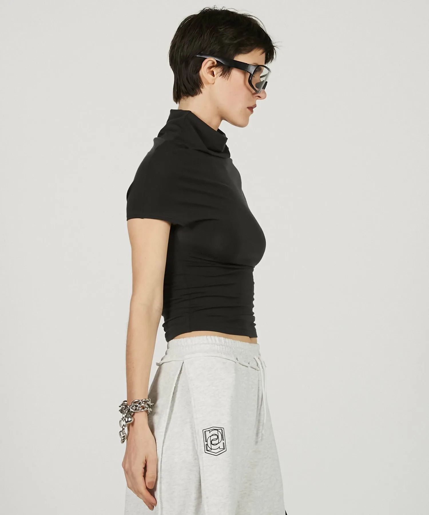Минималистичный крой и пошив с воротником-хомутом в качестве центрального элемента.