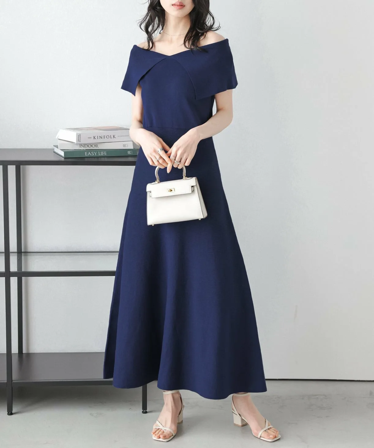 Двусторонний дизайн с вырезом-лодочкой и открытыми плечами, с большим воротником, который прекрасно подчеркивает декольте и визуально уменьшает лицо.