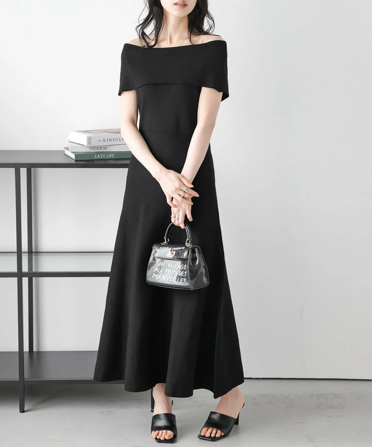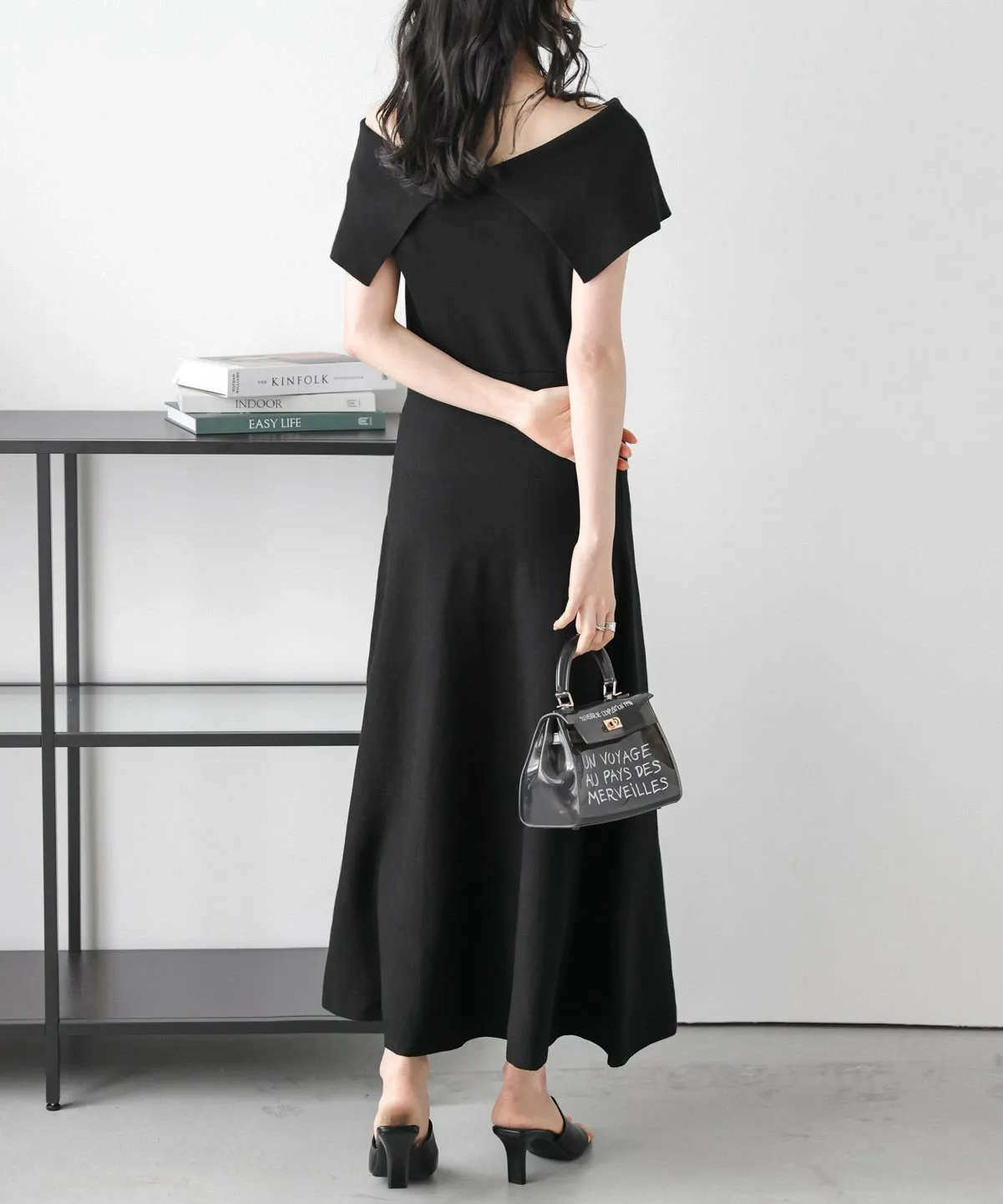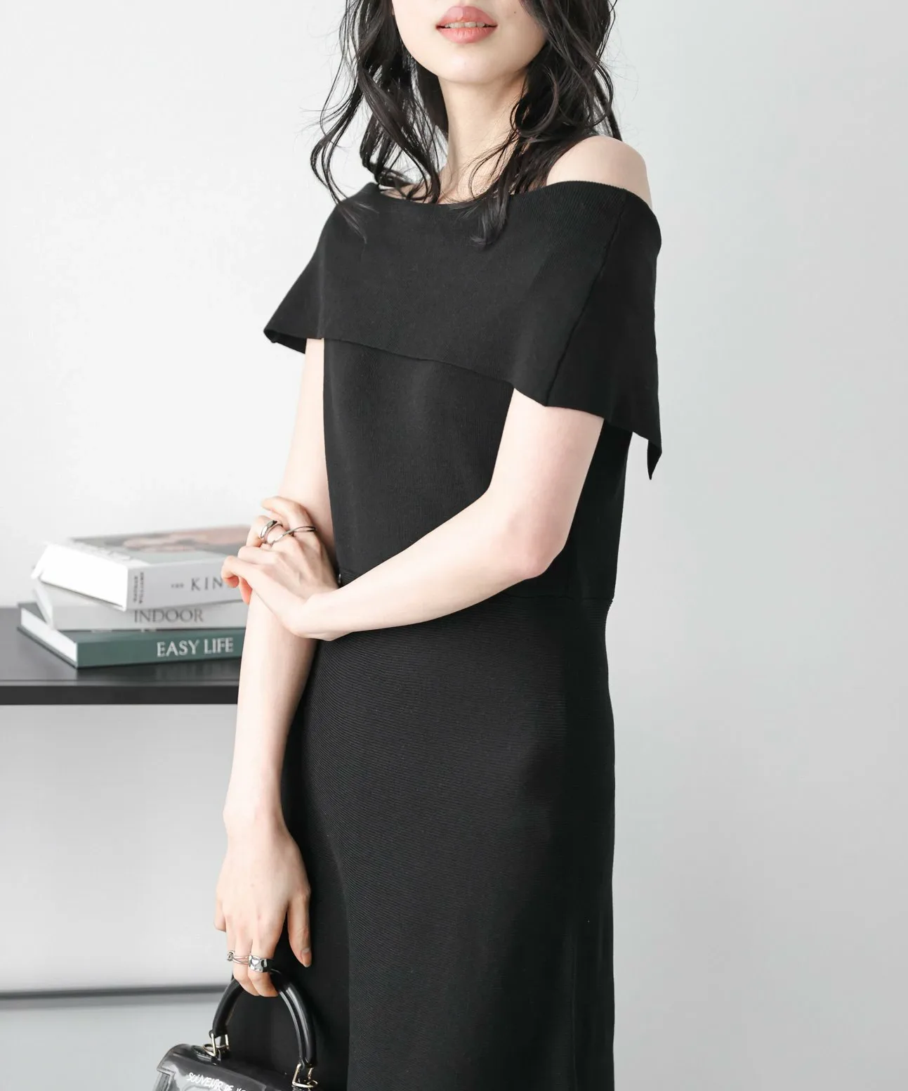 Двусторонний дизайн с вырезом-лодочкой и открытыми плечами, с большим воротником, который прекрасно подчеркивает декольте и визуально уменьшает лицо.