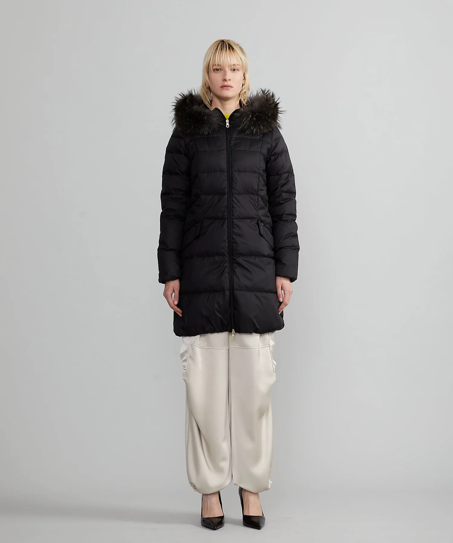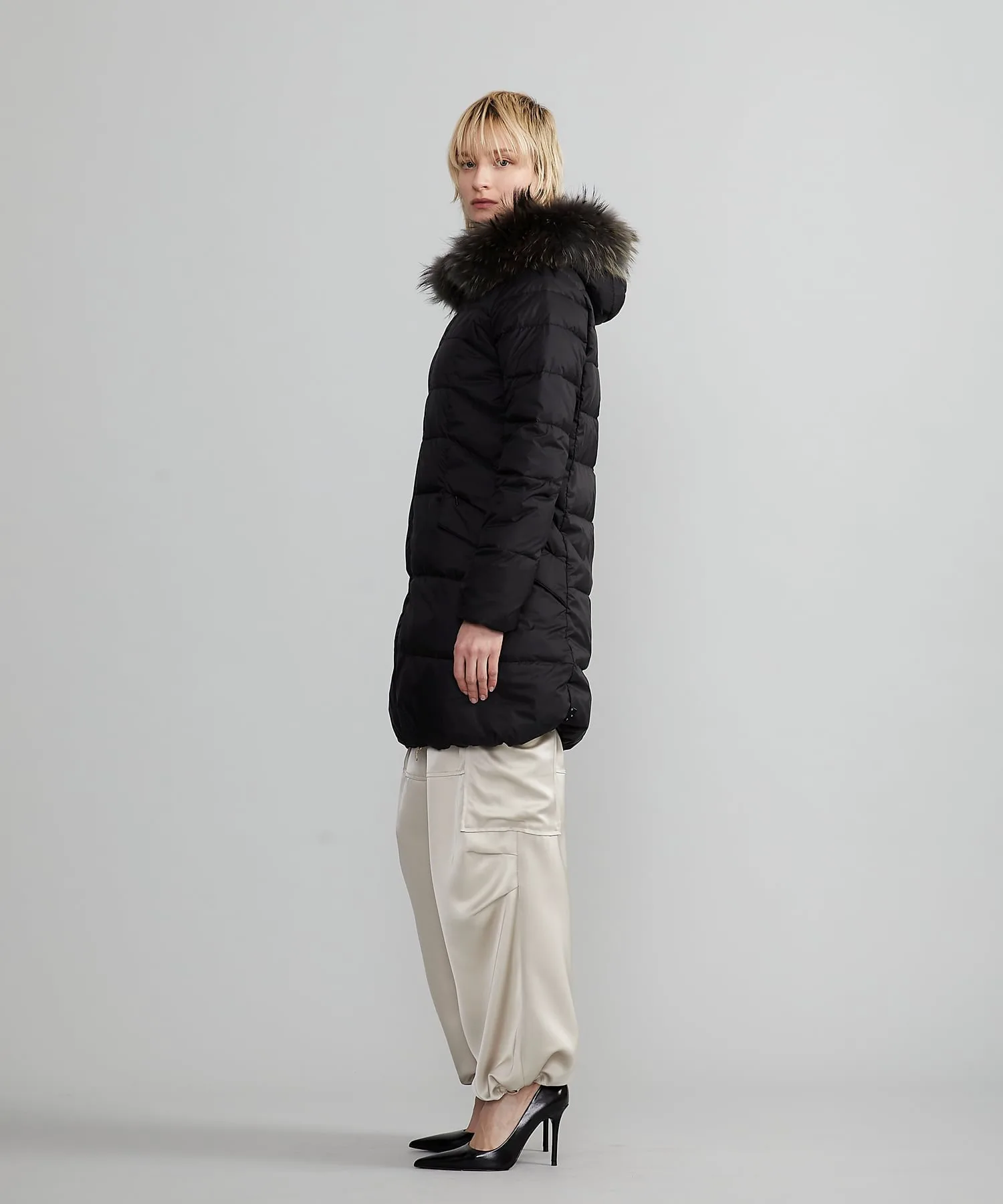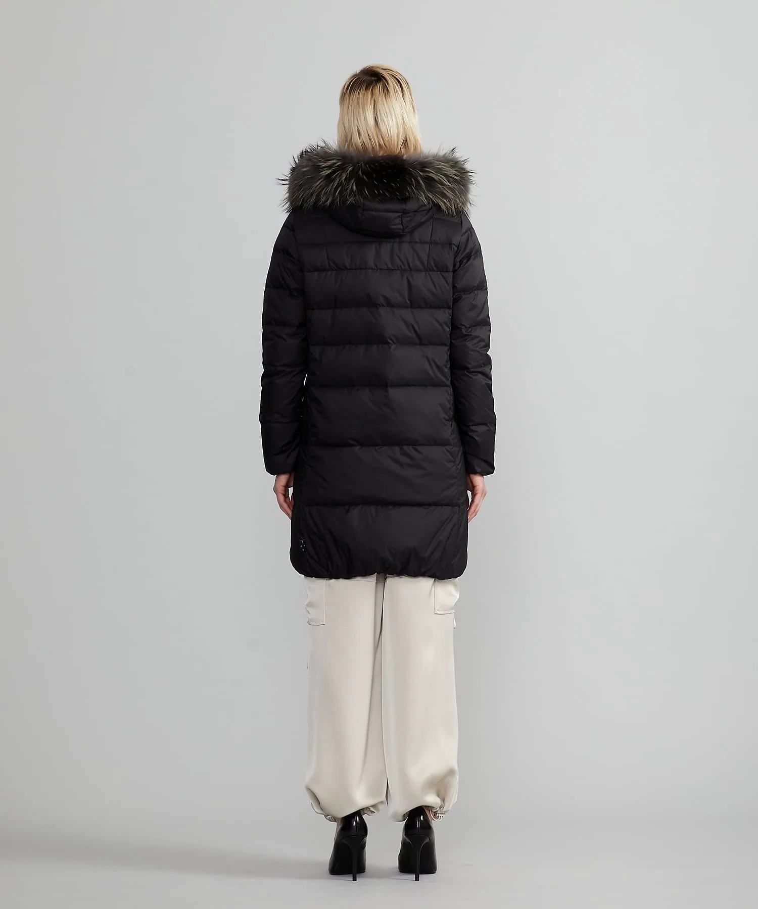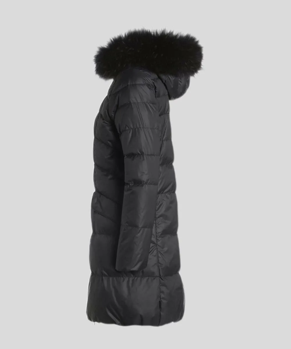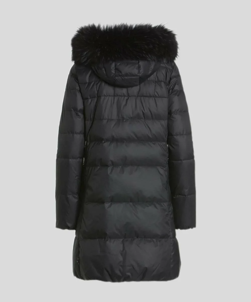 Это длинное пуховое пальто украшено великолепным мехом финского енота по капюону, что придает ему изысканный стиль.
