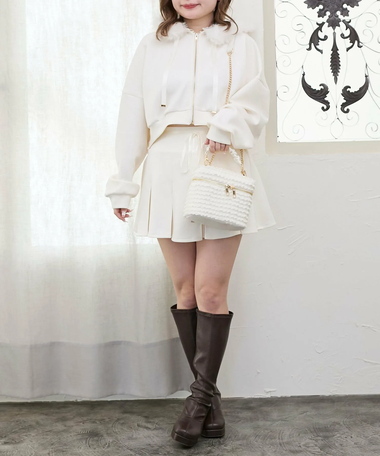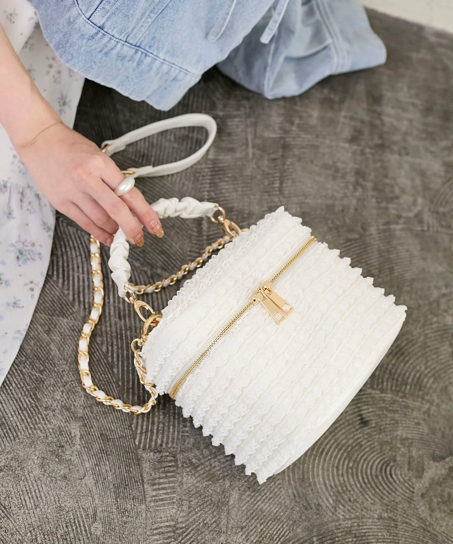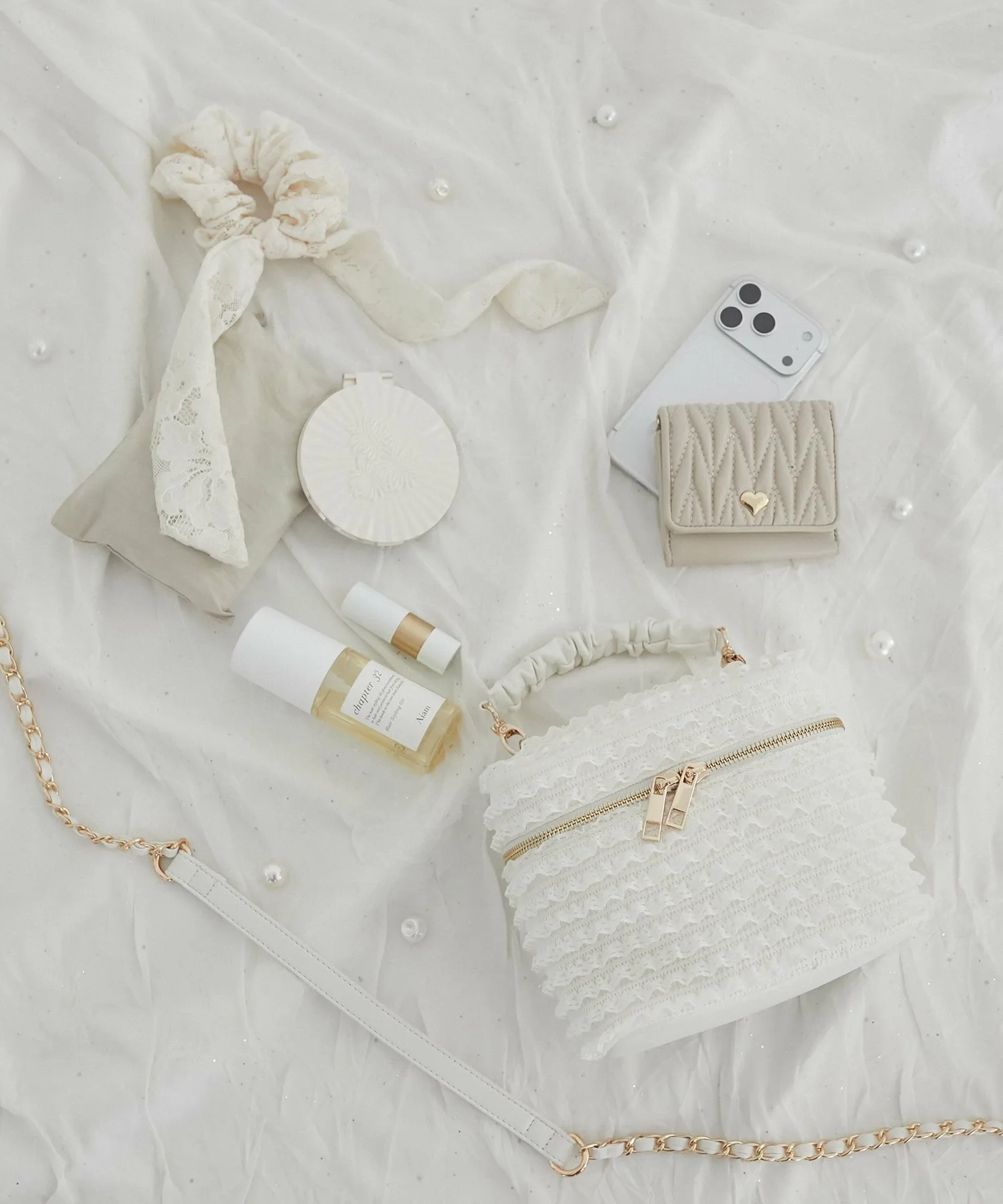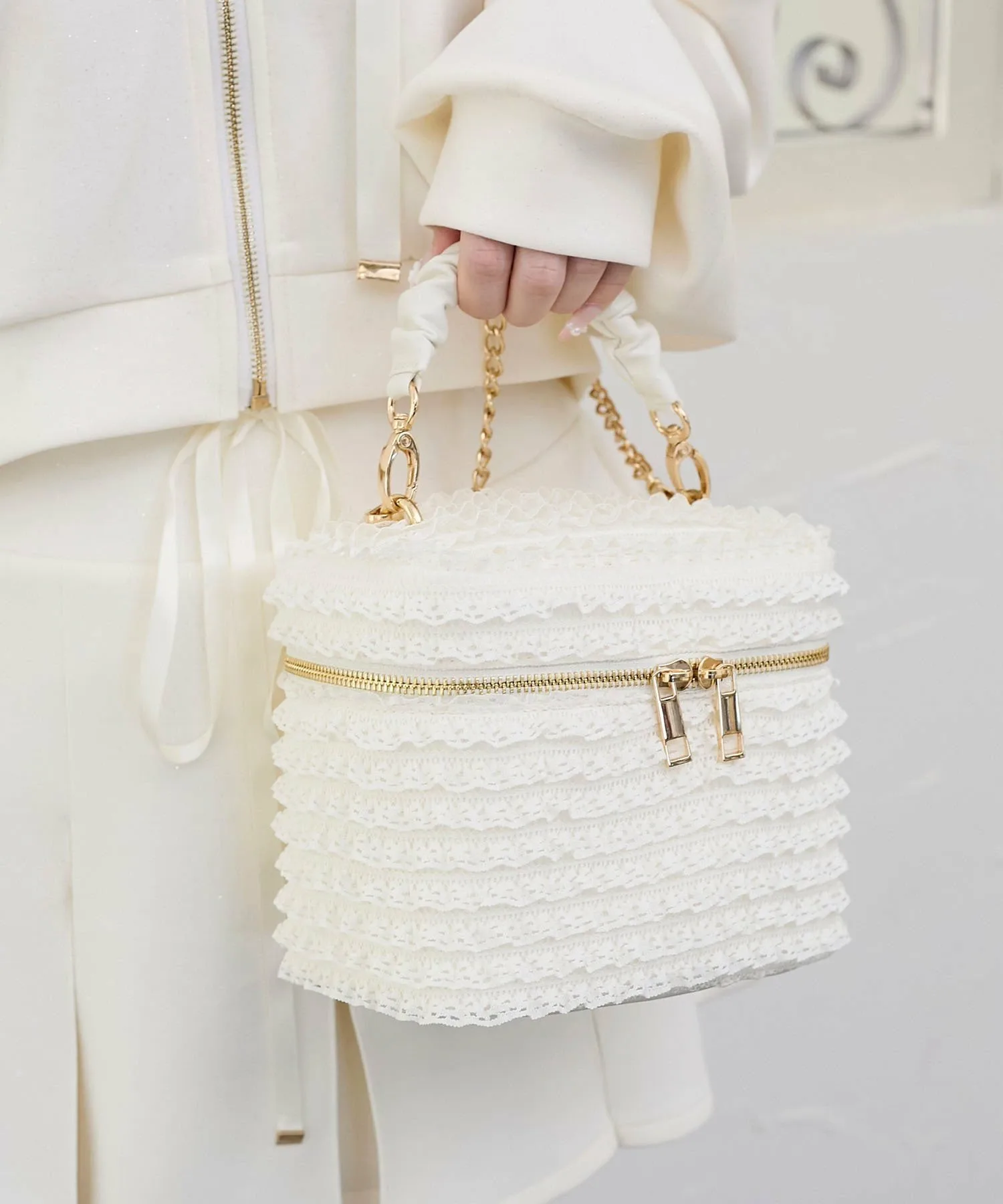 Она не только милая, но и удобная в использовании. «Mimi» — это линия обуви и сумок от MAJESTIC LEGON, созданная для комфорта и разнообразия. Гарантированно будет отлично смотреться в социальных сетях! Милая кружевная косметичка, поражающая воображение со всех сторон. Дизайн Эта косметичка щедро украшена нежным кружевом, что делает её очаровательной с любого ракурса. Трехмерный дизайн с оборками и элегантная золотая фурнитура добавляют нотку очарования. Двойная молния облегчает открывание и закрывание, а внутри есть удобный карман для хранения мелких предметов. Съемный плечевой ремень-цепочка позволяет использовать её как сумку-клатч, так и как сумку через плечо. Этот эффектный аксессуар можно включить в любой стиль. Размер Сумка имеет прочную боковую вставку и вмещает ПЭТ-бутылку объемом 350 мл. Она достаточно большая, чтобы вместить необходимые вещи, такие как смартфон, мини-кошелек, бальзам для губ и носовой платок.