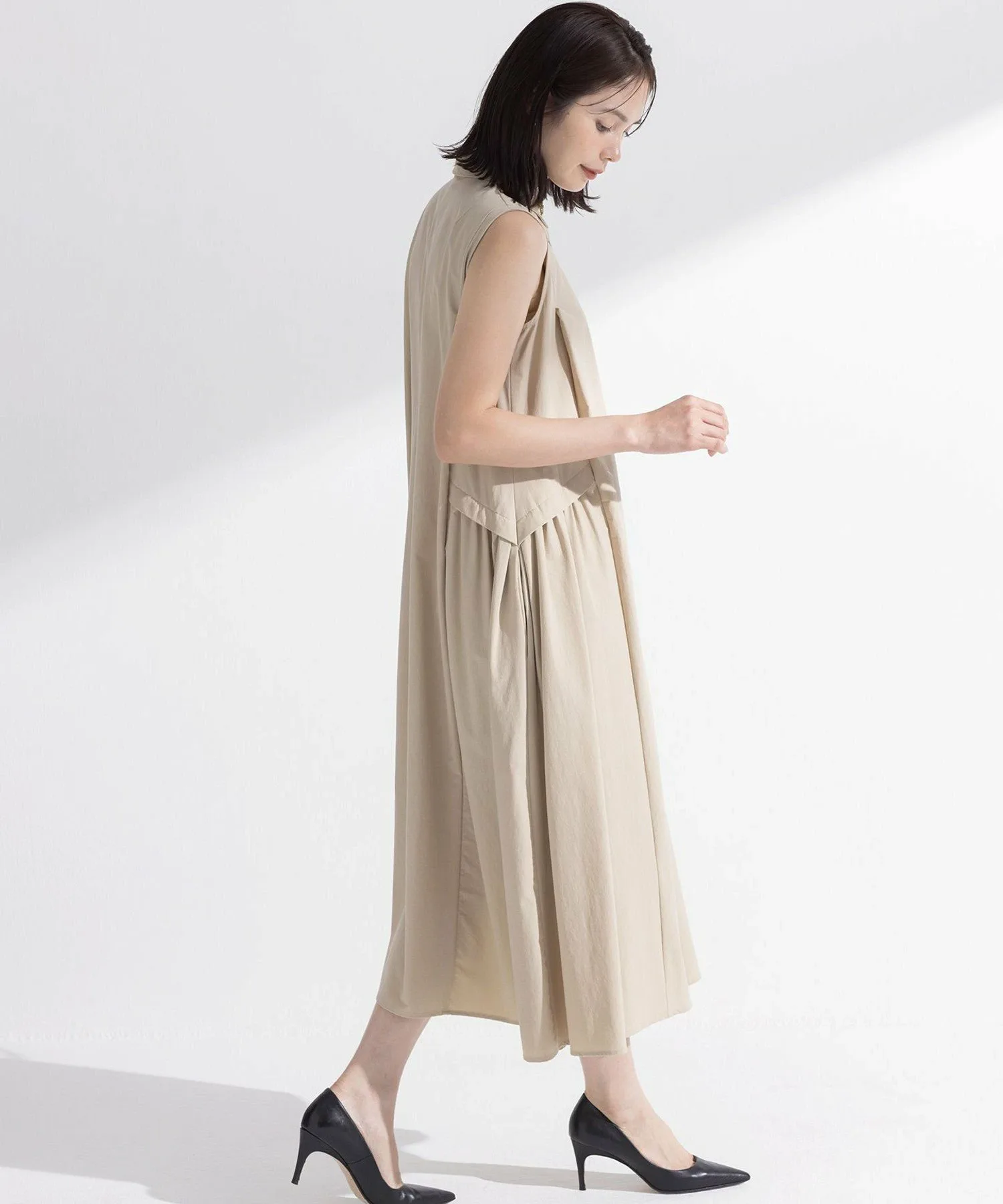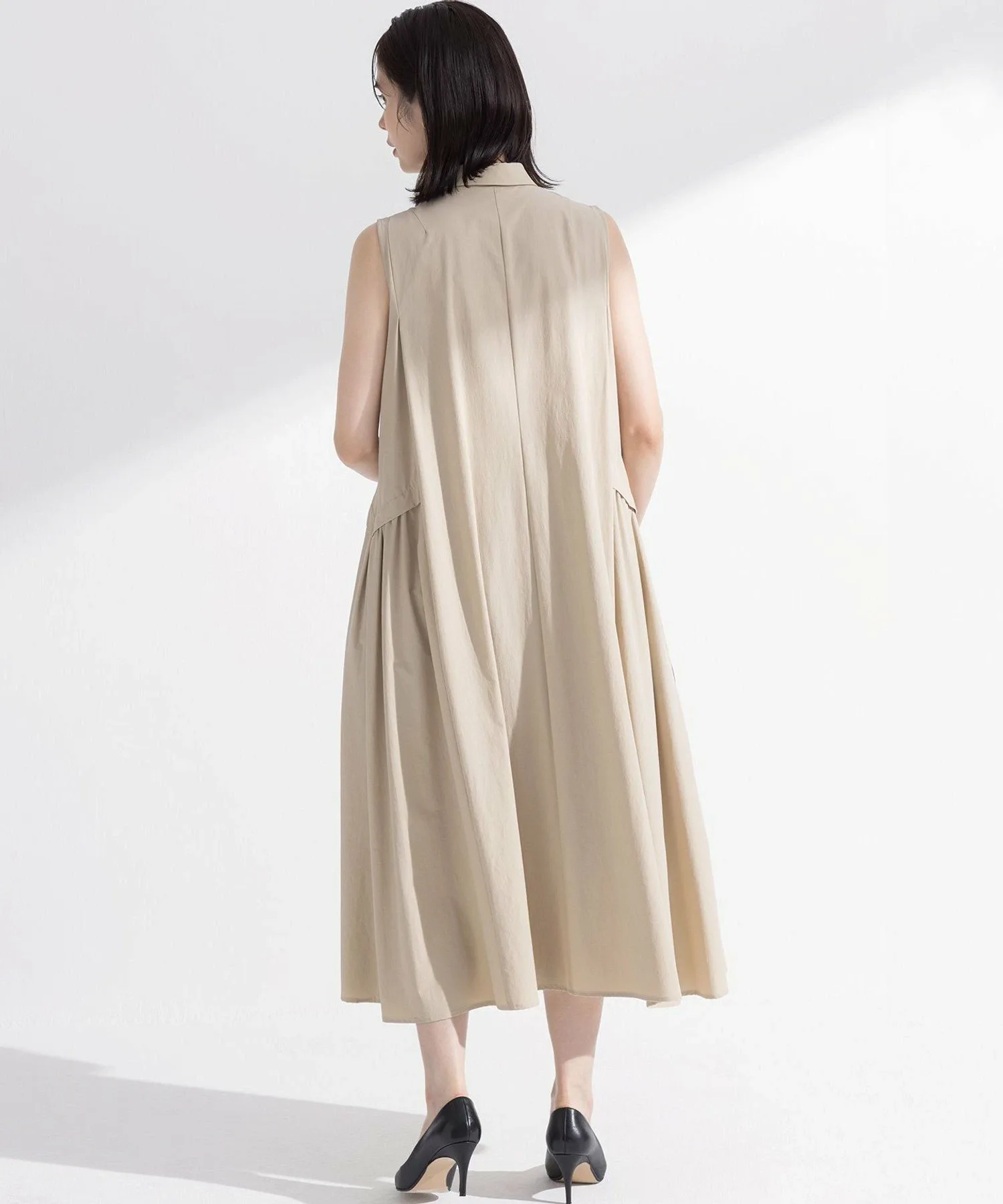 Дизайн: Это платье без рукавов идеально подходит для любого сезона, а сборки по бокам создают зрелый, женственный образ. ・Вертикальные складки от плеч визуально стройнят, а сборки по бокам подчеркивают женственность. ・Хорошо очерченный силуэт с объемом к подолу. ・Отлично смотрится как само по себе, так и в повседневном стиле с футболкой или джинсами. ・Карманы и подъюбник также являются приятными дополнениями.