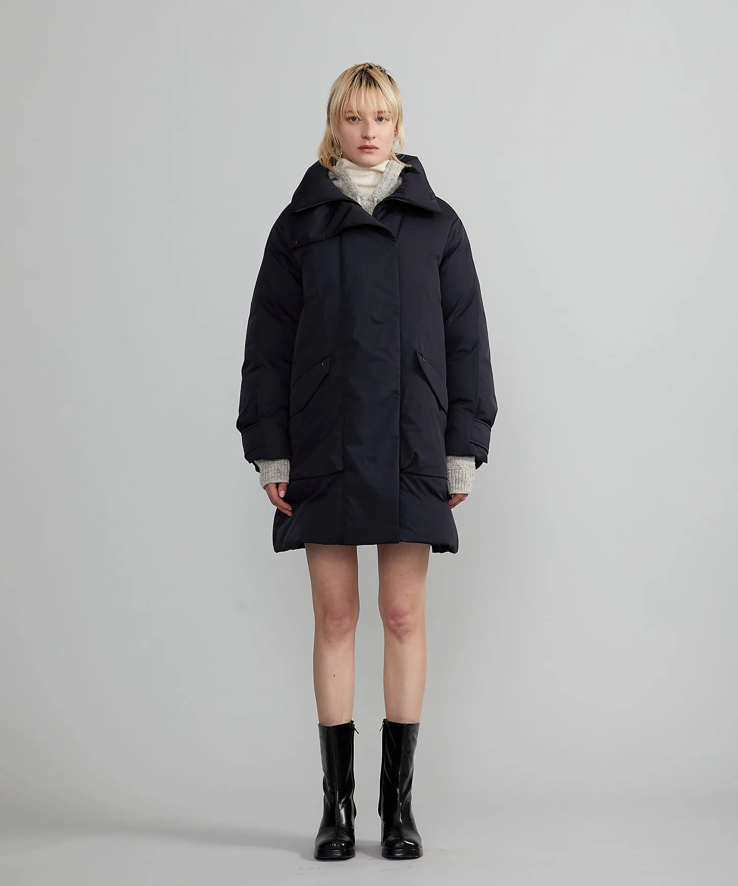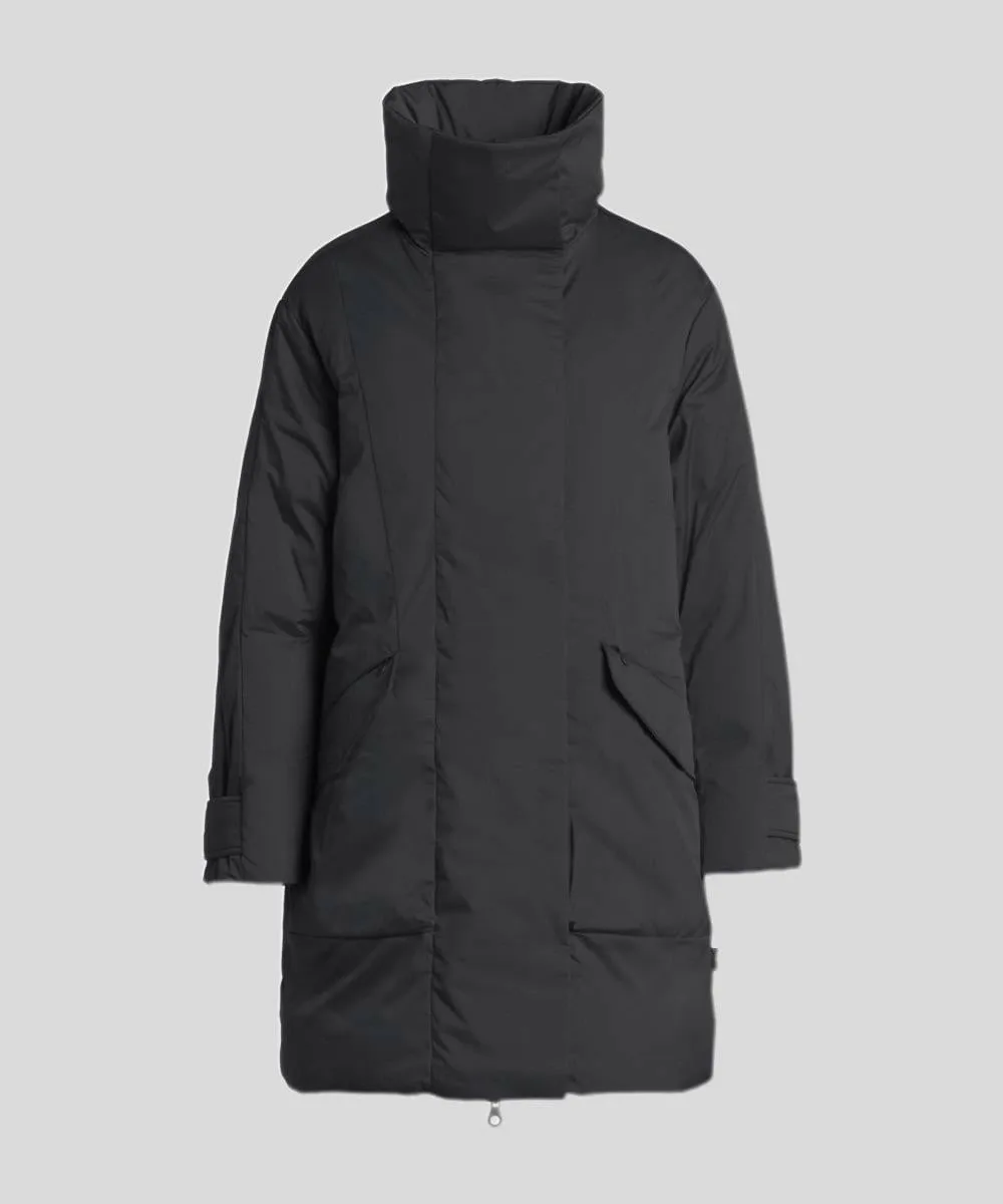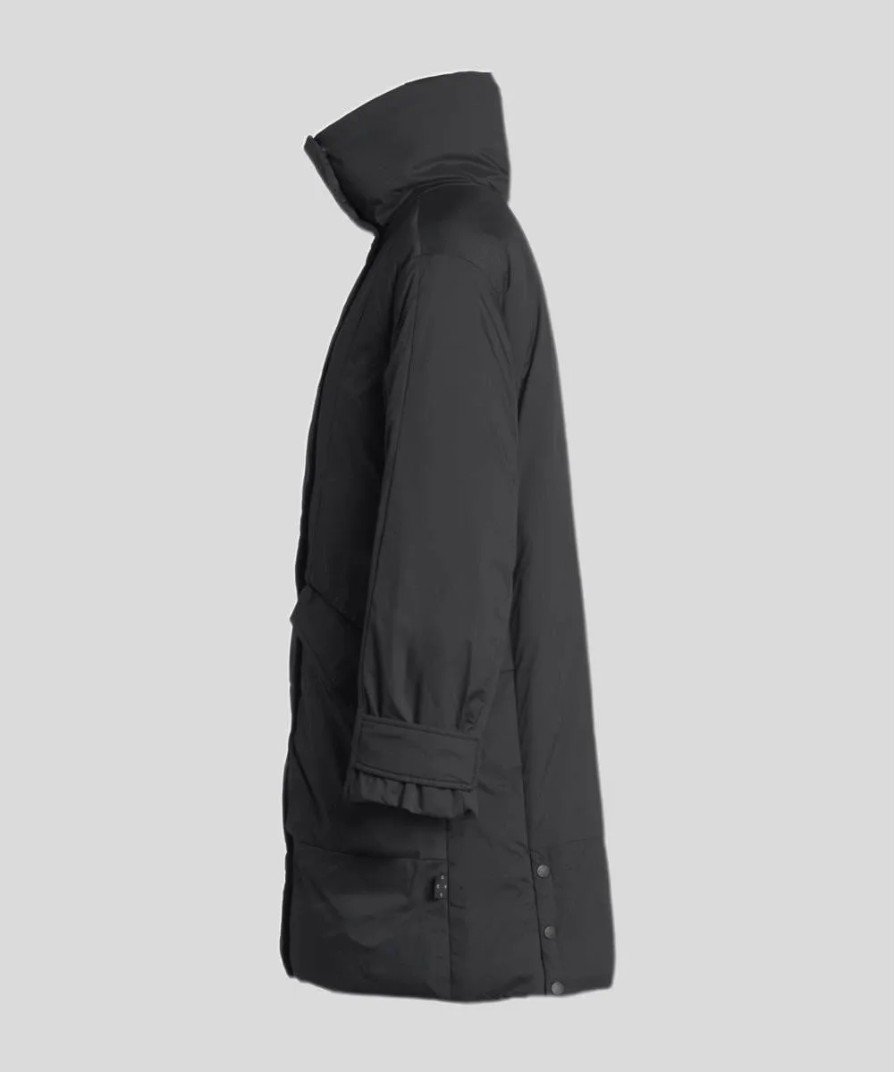 Эта пуховая куртка с длинными рукавами имеет легкую нейлоновую внешнюю оболочку, а наполнитель представляет собой комбинацию теплого и легкого пуха и дышащих и эластичных перьев. Ее также можно трансформировать в топ с высоким воротником, чтобы плотно облегать тело и защищать от ветра. Однотонный цвет позволяет легко сочетать ее с любой одеждой.