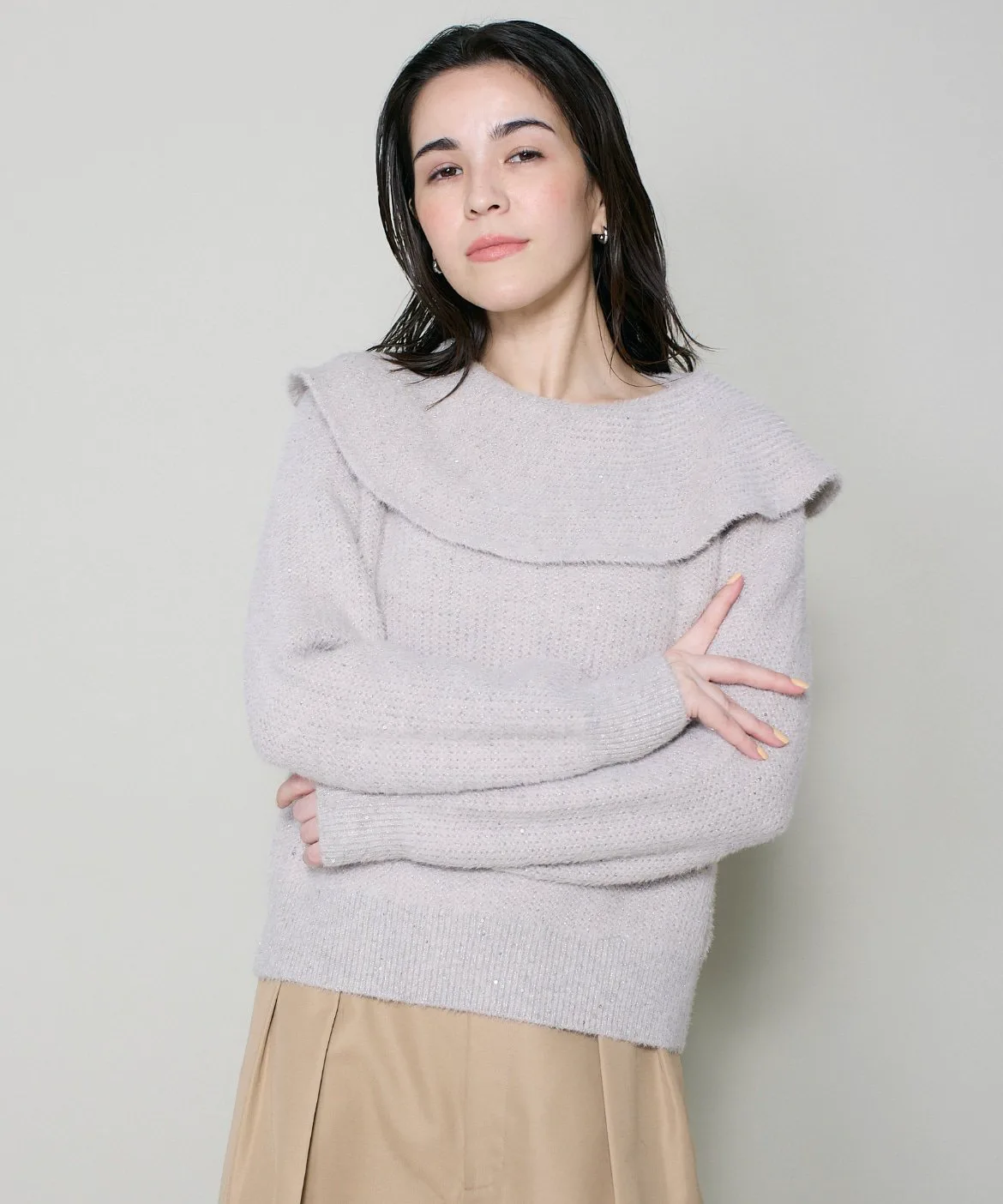 Этот вязаный топ щедро украшен мелкими пайетками и блестками, создавая ослепительное сияние. Добавление длинноворсовой пряжи придает ему легкость и воздушность, делая его элегантным блестящим изделием, которое можно носить как самостоятельное дополнение к любому наряду. Широкий вырез горловины создает элегантный и роскошный образ, выгодно подчеркивая декольте. Большой воротник привлекает внимание, поэтому рукава и основная часть изделия намеренно выполнены в обтекаемой форме.