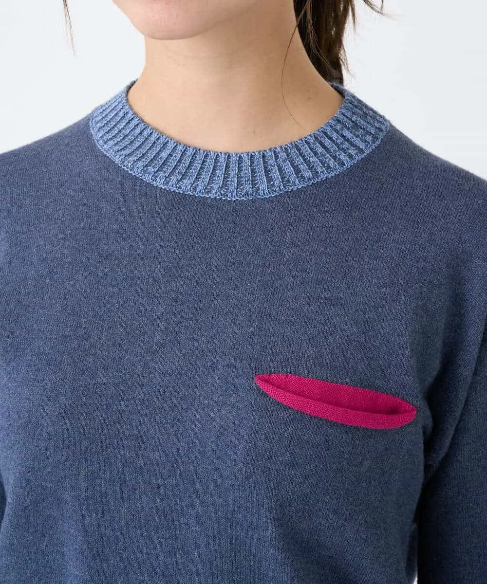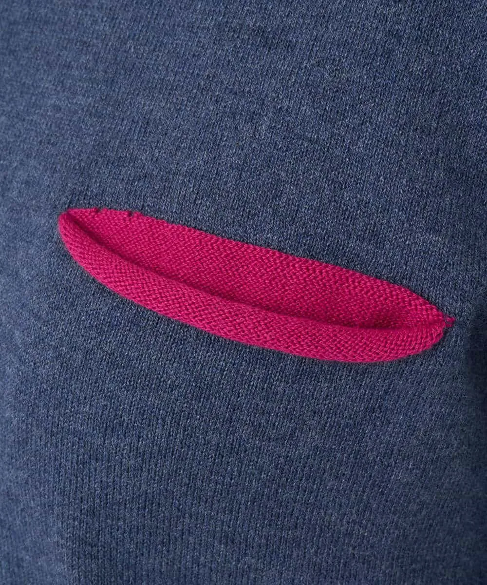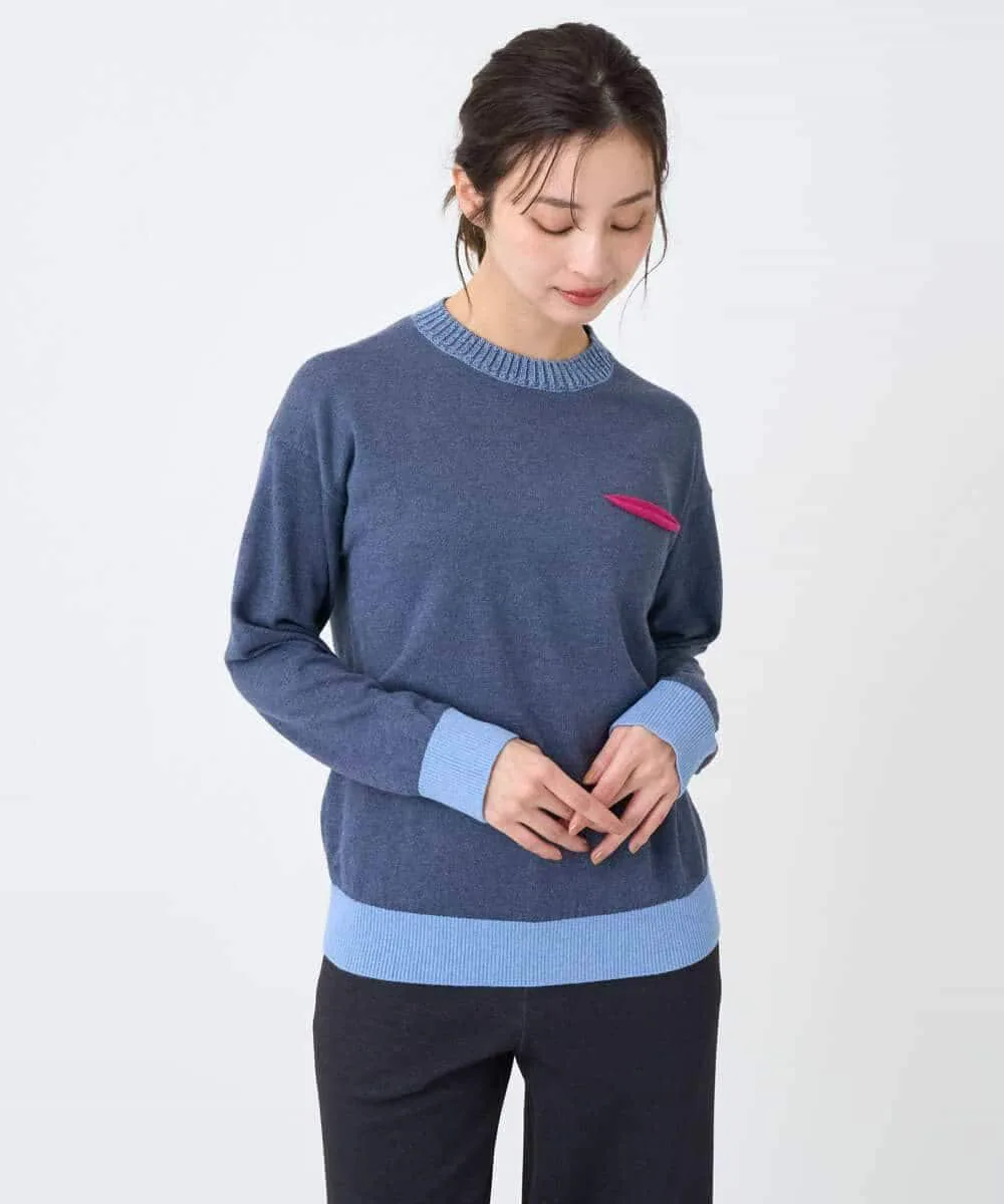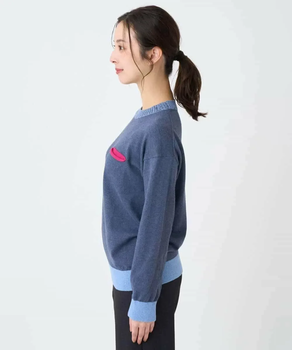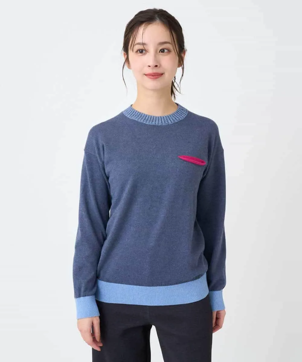 Этот свитер имеет свободный силуэт. Основная часть выполнена из простого трикотажа, а воротник, низ и манжеты — из ребристого материала с контрастным цветовым оформлением. Передняя часть изделия добавляет игривую деталь — вид на карман в тон. Задний воротник отделан тонкой трикотажной тканью пике для стильного акцента.