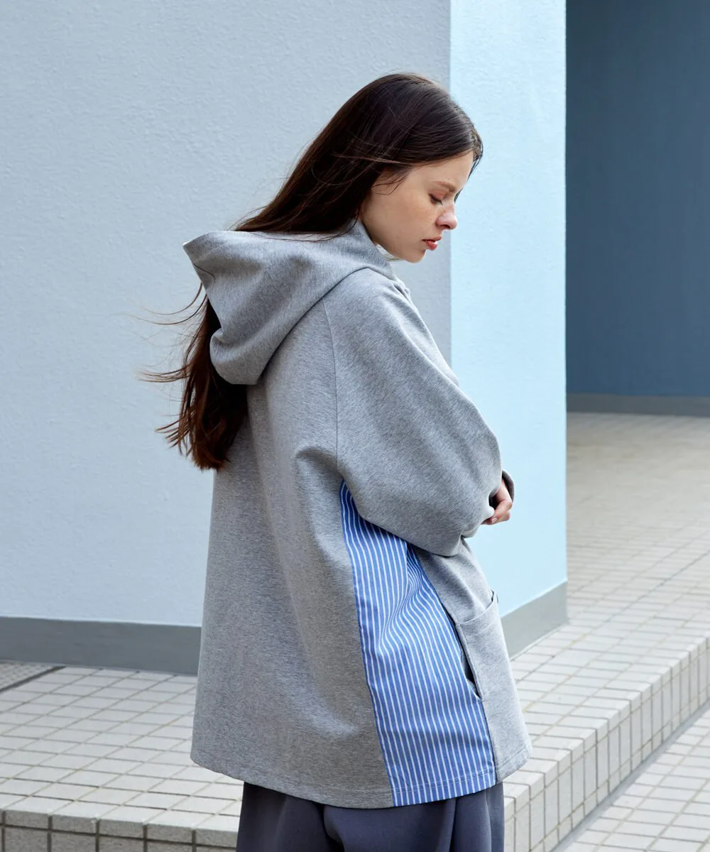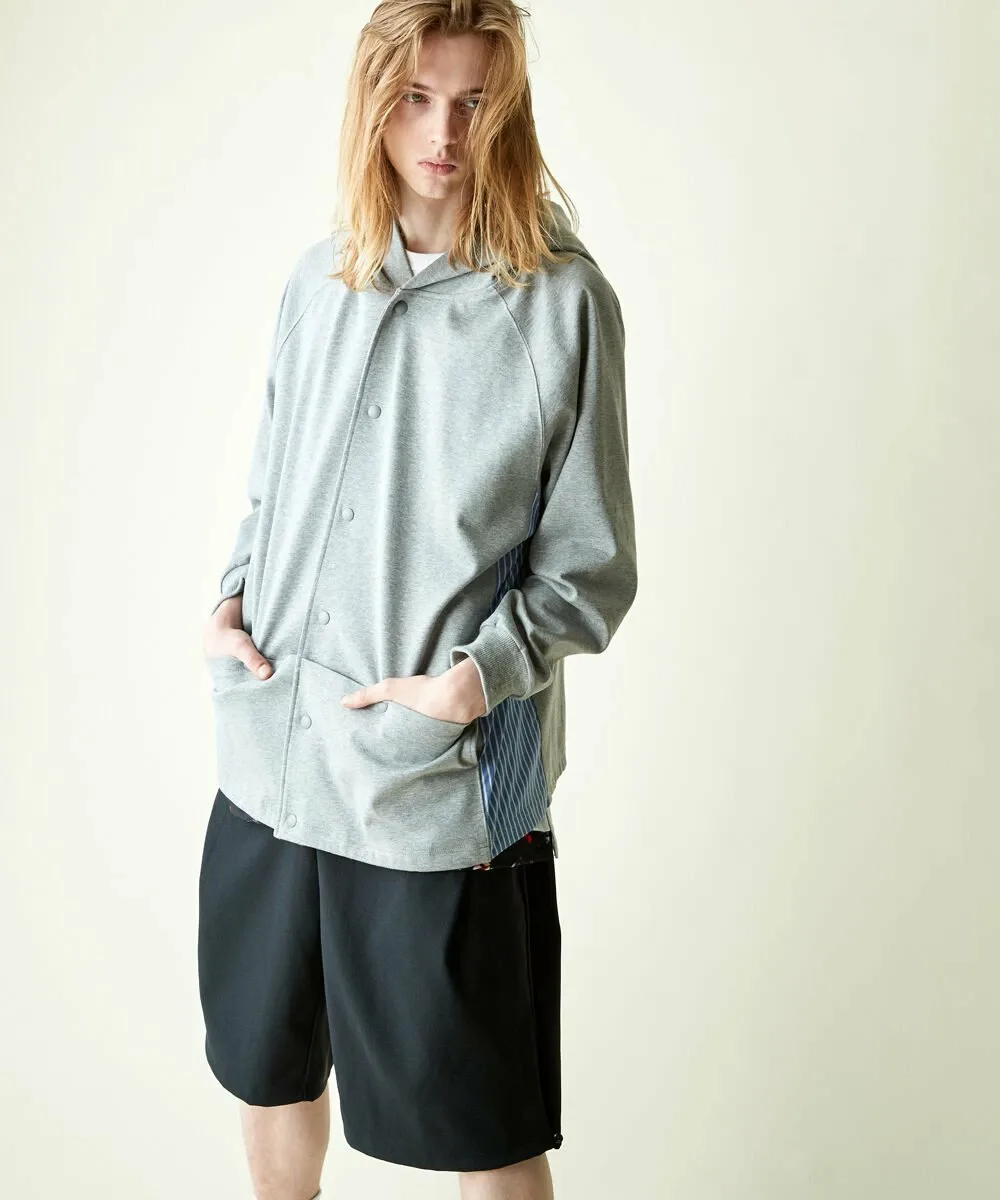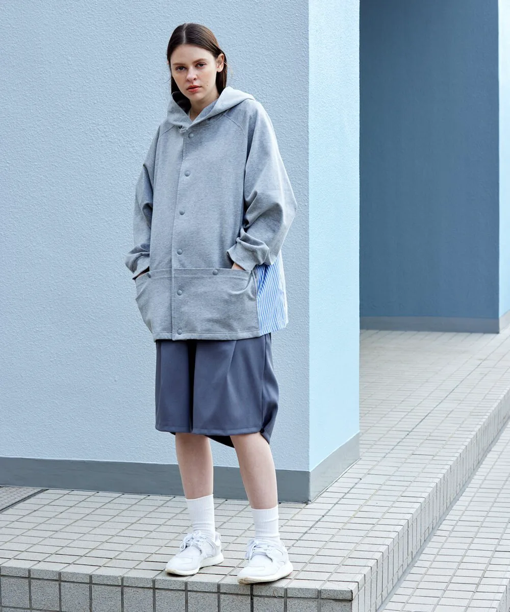 Этот кардиган имеет объемный силуэт с капюшоном и полосатую ткань, используемую для переходных частей по бокам. Прочная ткань делает его более подходящим для ношения в качестве верхней одежды, чем кардигана, и подходит для широкого спектра сезонов. Основной материал — ткань понте, плотная, но приятная на ощупь, с высокой степенью эластичности для свободы движений. Силуэт отличается модным широким силуэтом и рукавами реглан, которые не напрягают плечи, что делает его подходящим как для мужчин, так и для женщин. Рост модели: 184 см. Размер: Черный, Серый/Маленький