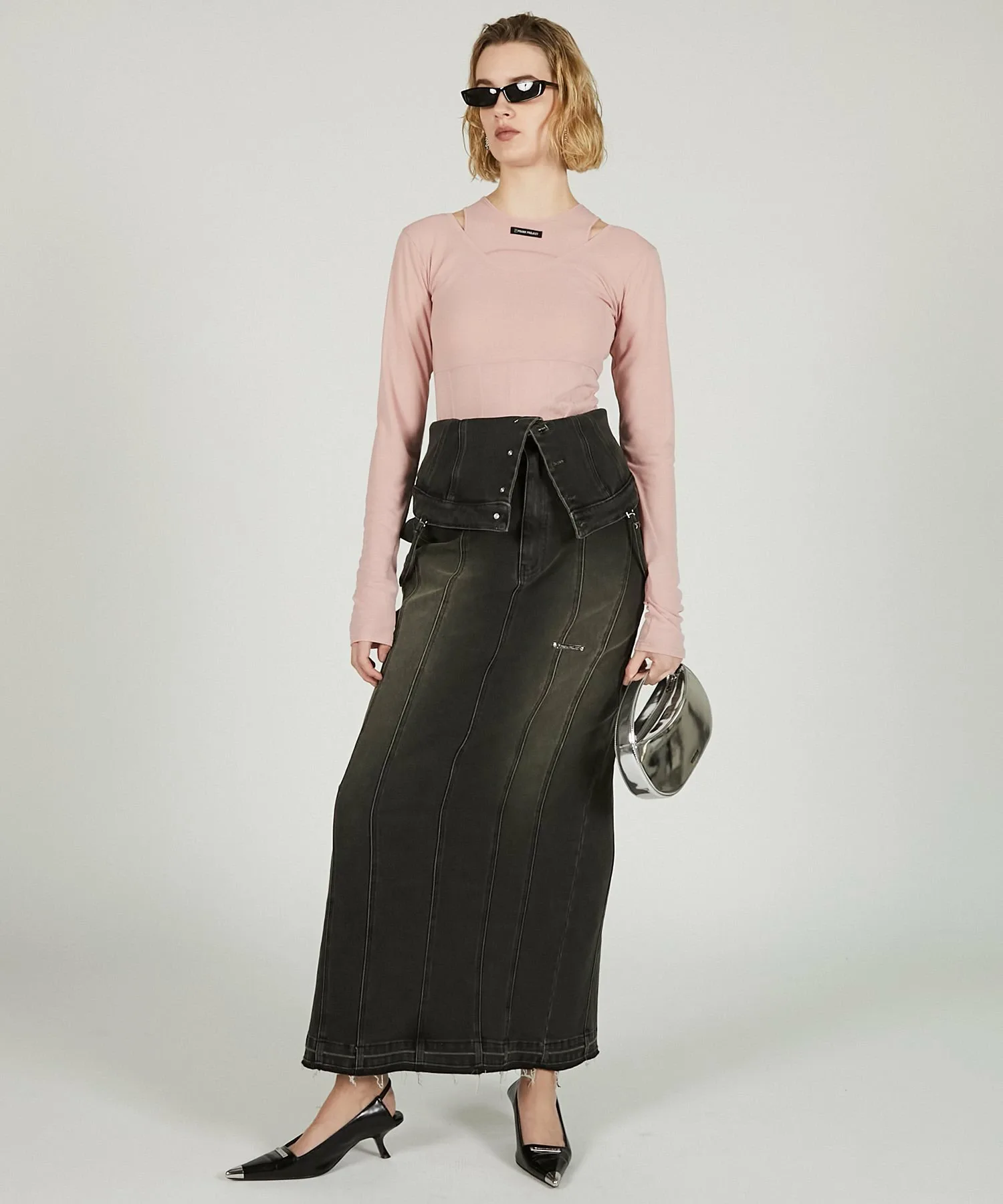 Его также можно носить как юбку I-силуэта, расстегнув пуговицы сверху и откинув назад, что делает его двусторонним изделием.