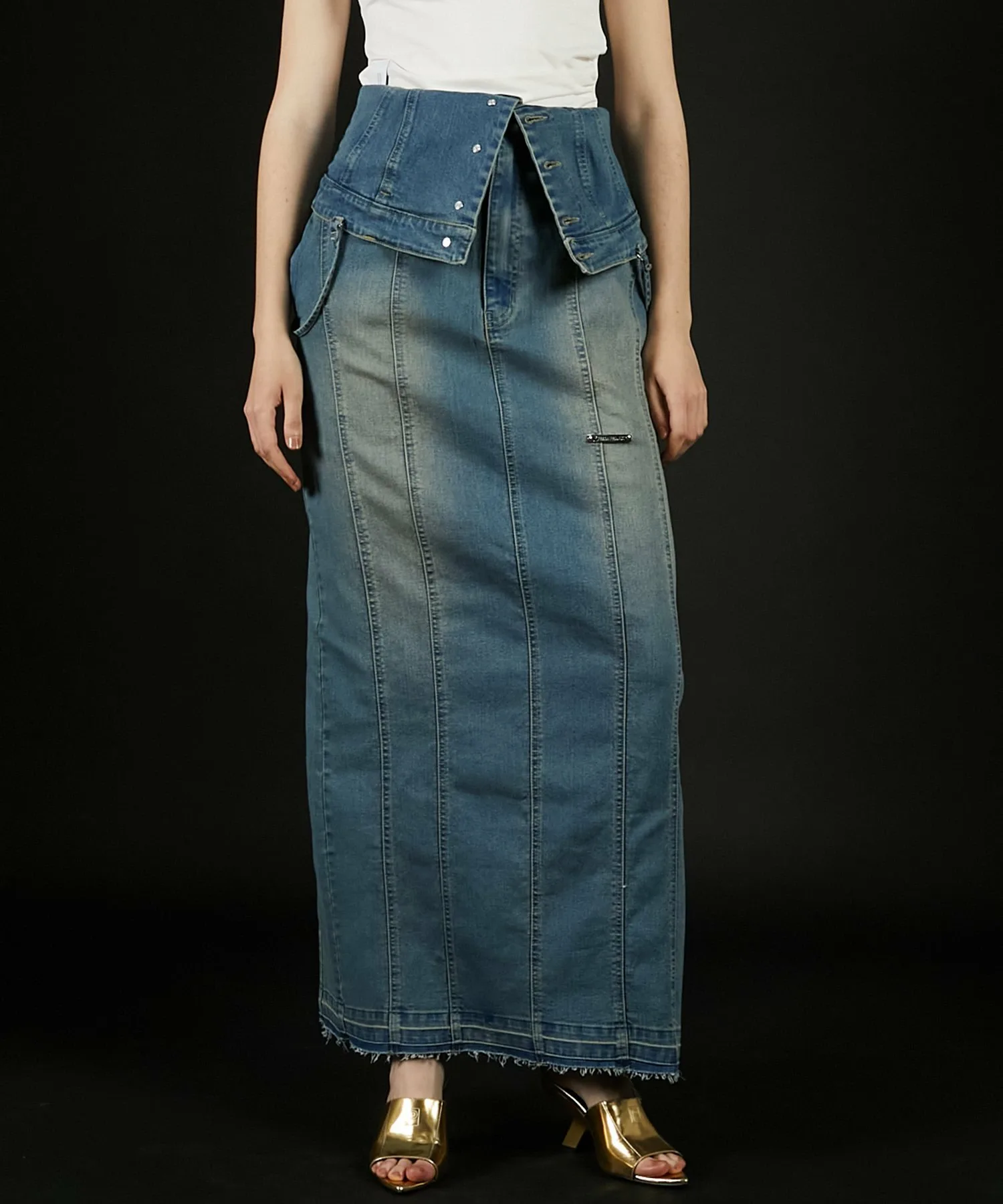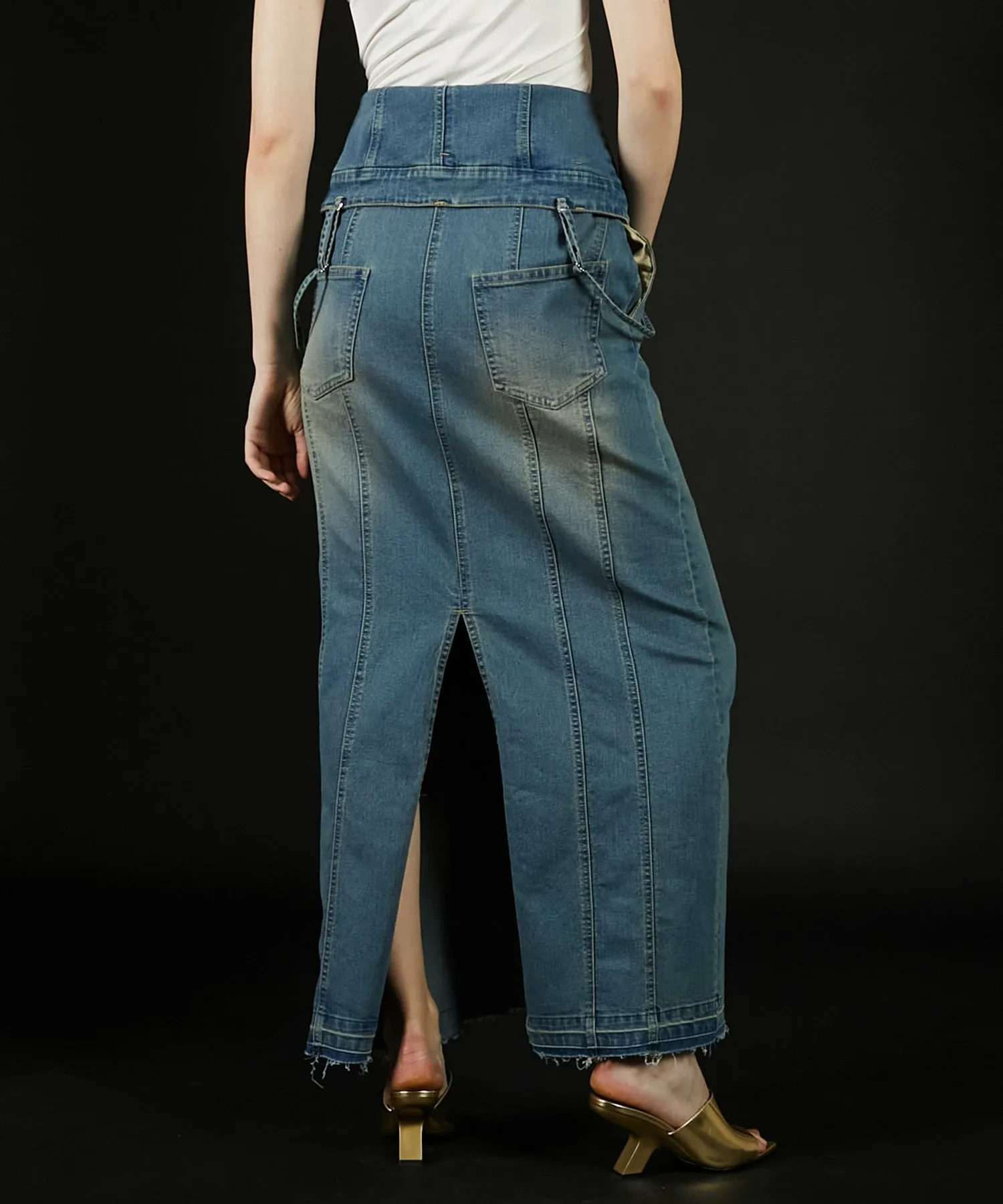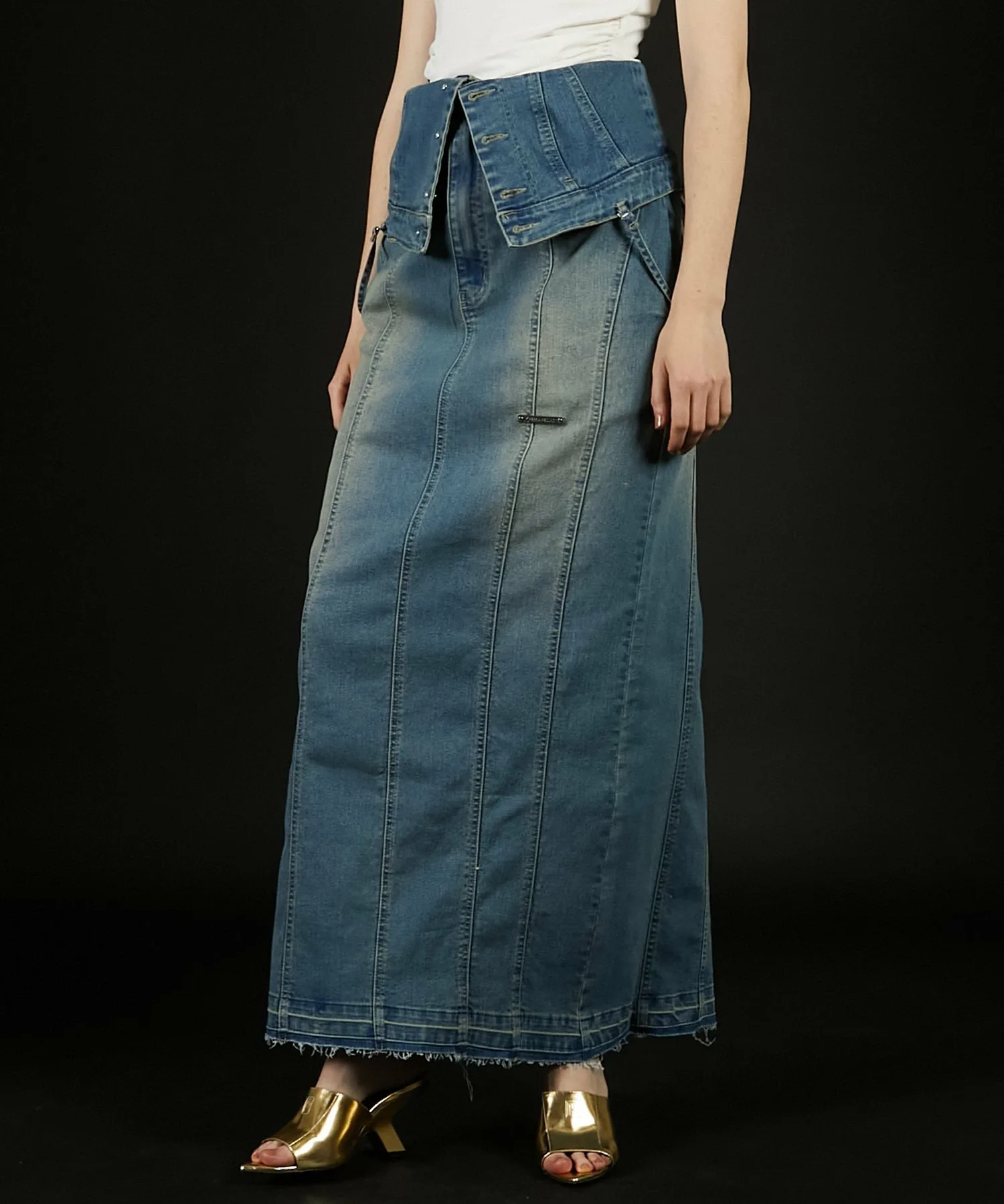 Его также можно носить как юбку I-силуэта, расстегнув пуговицы сверху и откинув назад, что делает его двусторонним изделием.