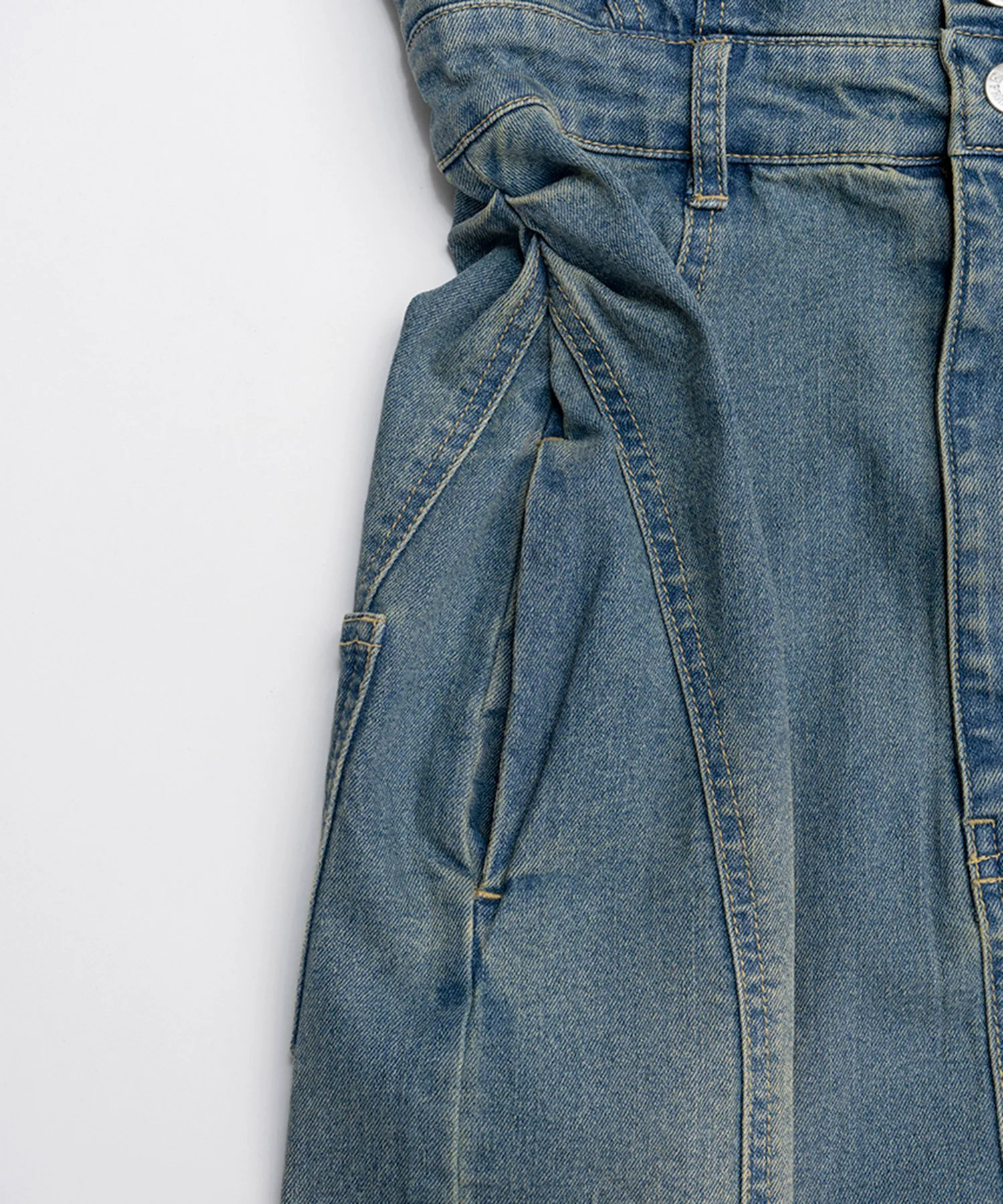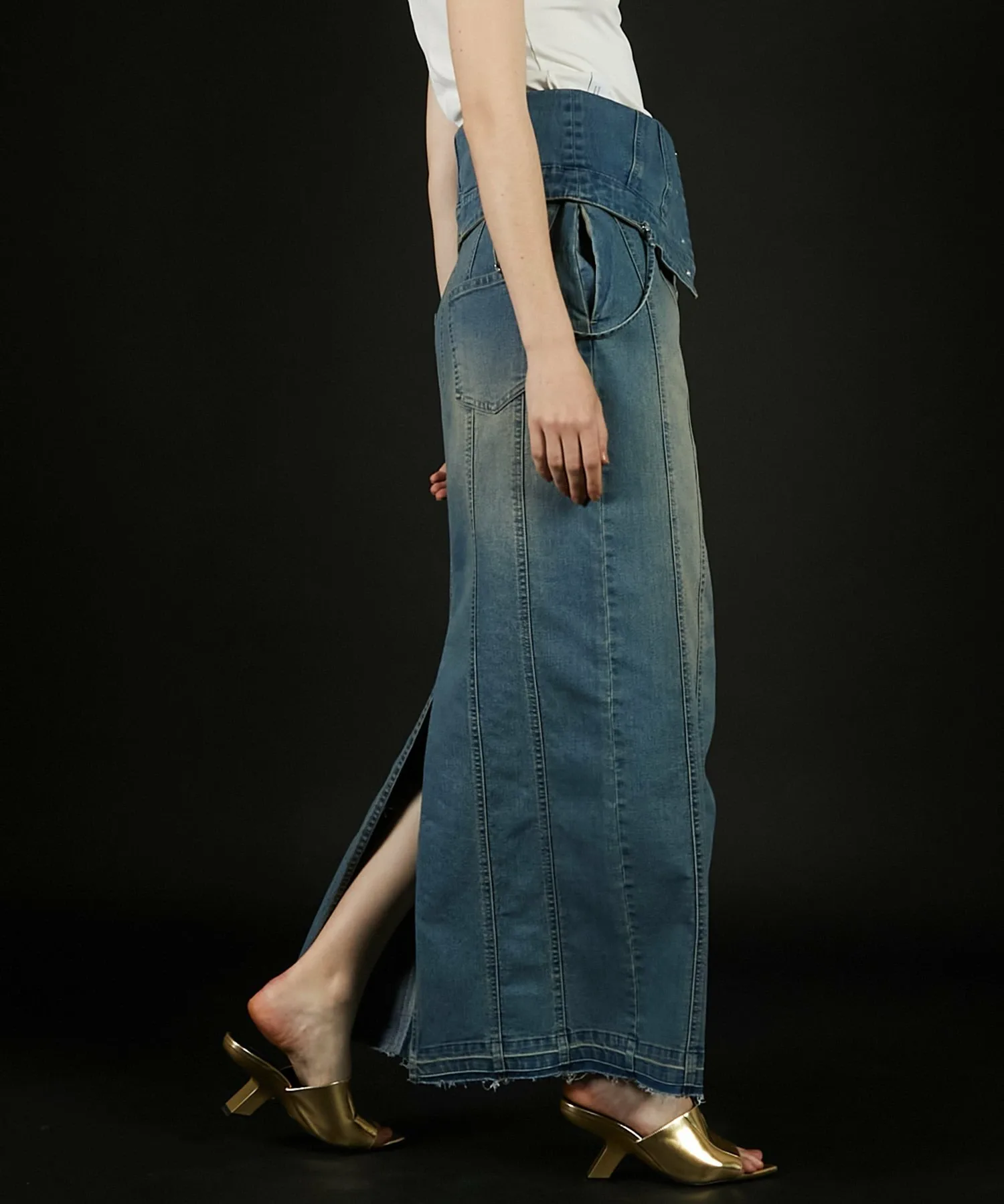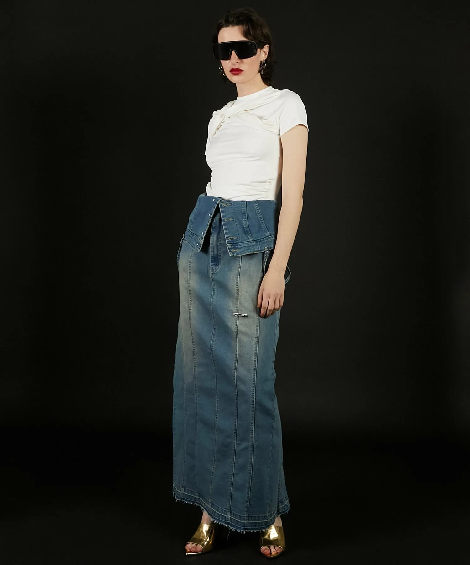 Его также можно носить как юбку I-силуэта, расстегнув пуговицы сверху и откинув назад, что делает его двусторонним изделием.