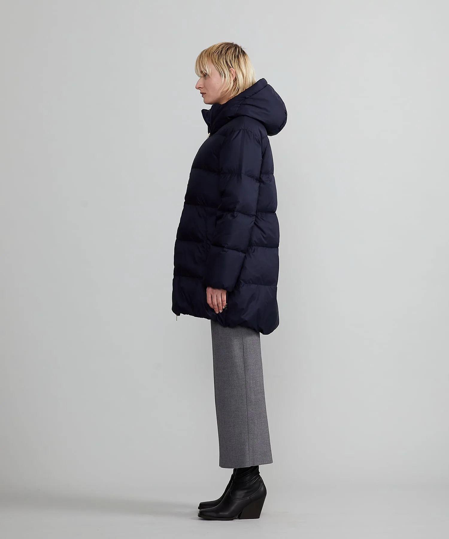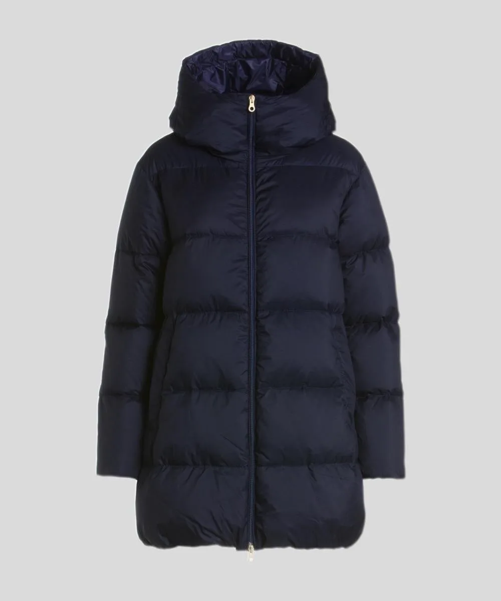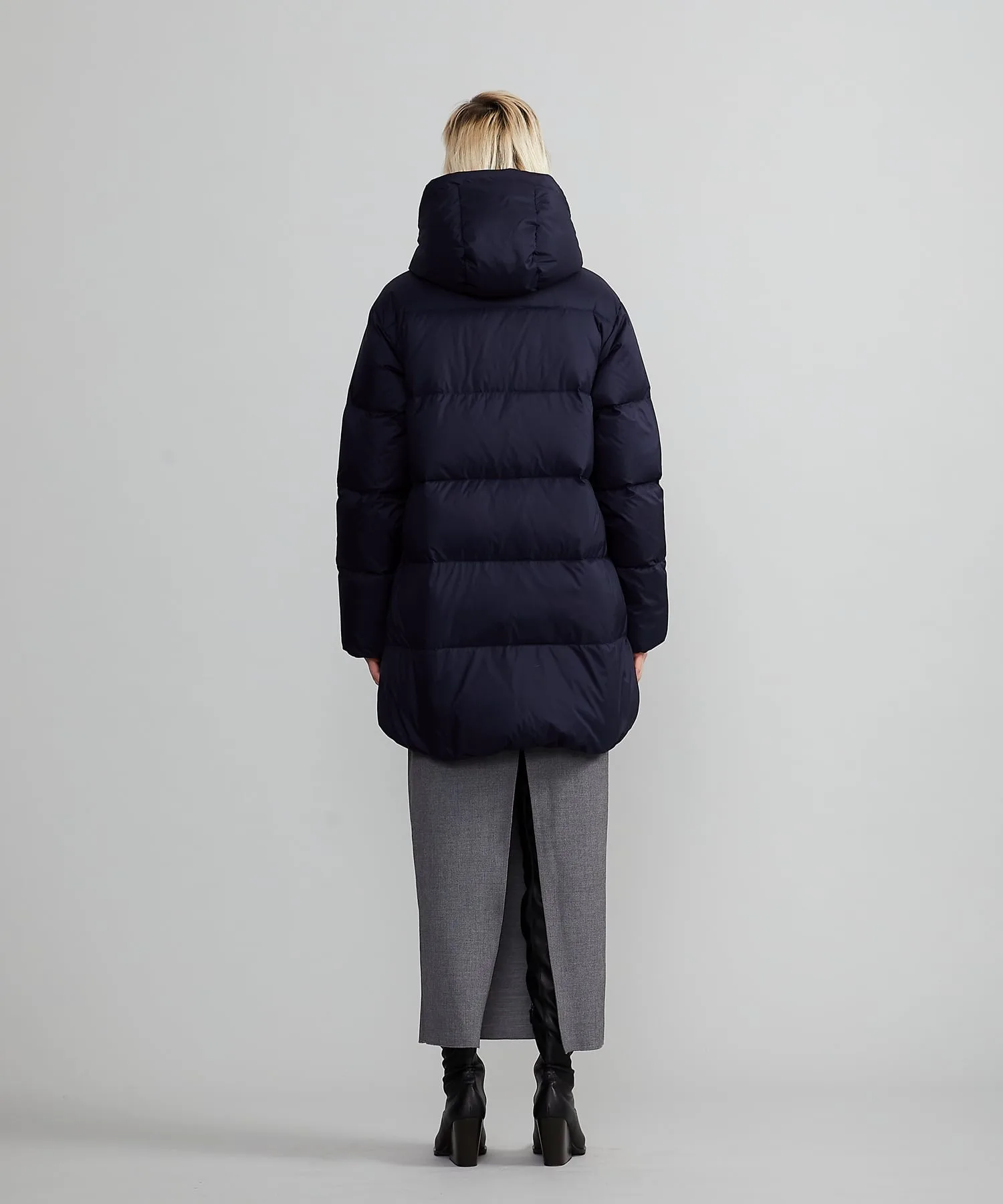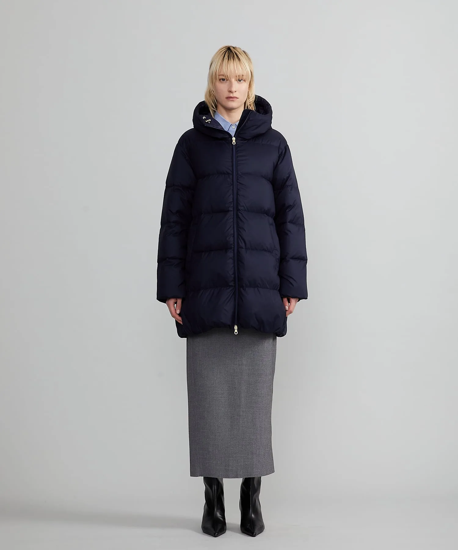 Длинное пуховое пальто базового цвета, создающее утонченное впечатление и легко сочетающееся с вашей одеждой.