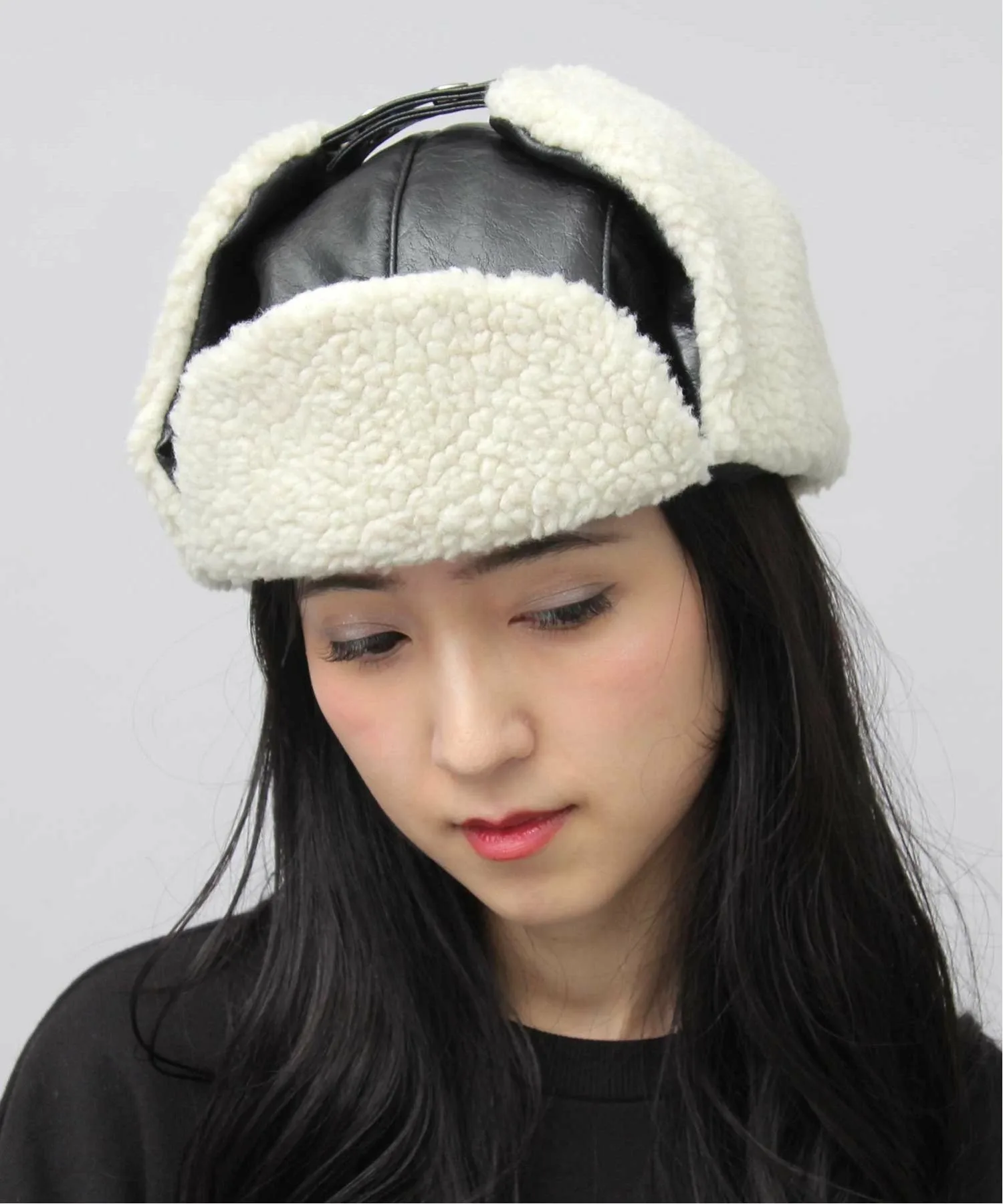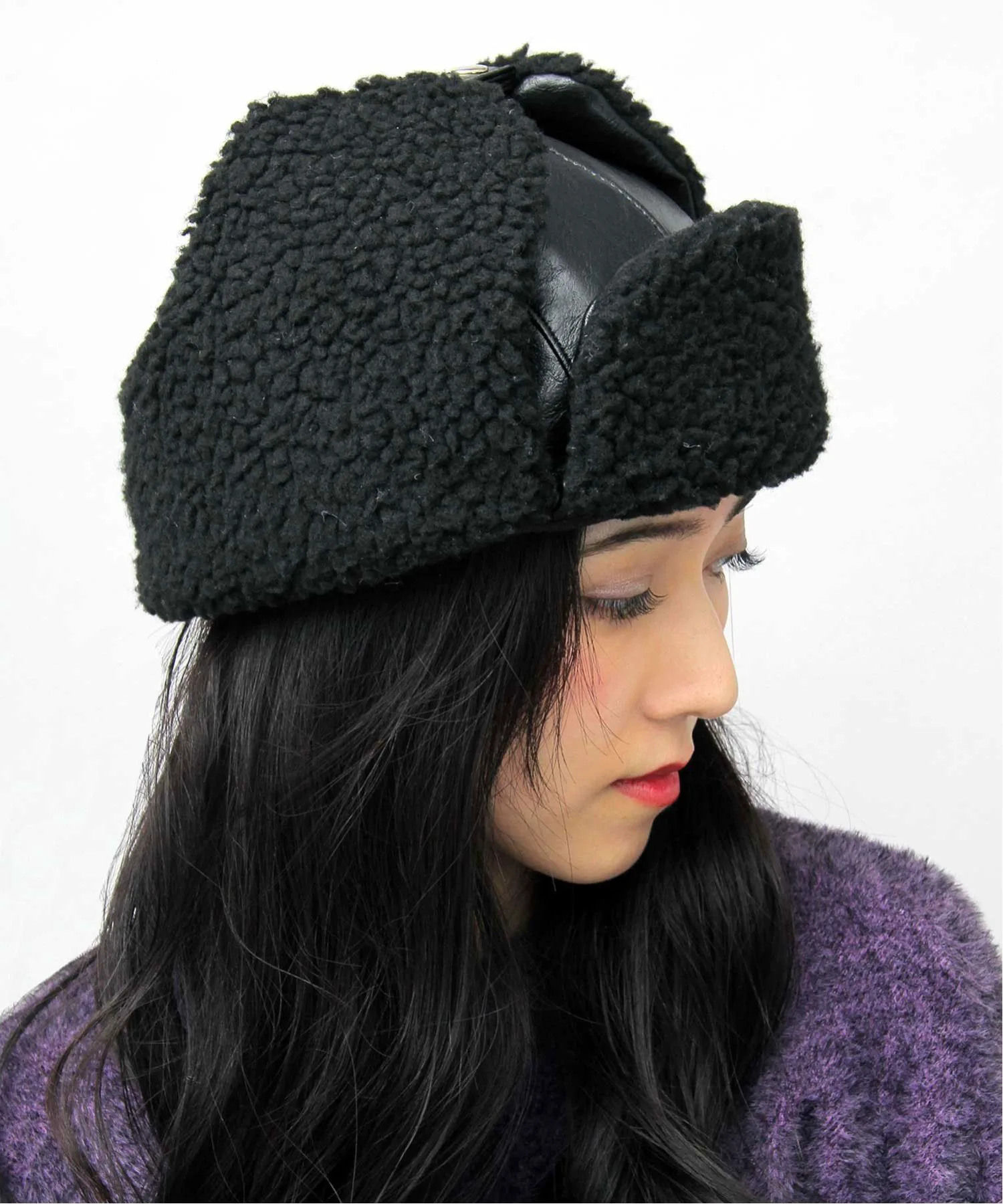 Эффектный аксессуар! Шляпа-авиатор, изготовленная на заказ из искусственной кожи и боа Эта шляпа-авиатор создана по образцу головных уборов пилотов самолетов. Изготовленная из большого количества материала боа, идеально подходящего для осени и зимы, она имеет теплый, объемный дизайн, который станет прекрасным дополнением к любому осенне-зимнему наряду. Искусственная кожа в винтажном стиле, отличающаяся уникальной мятой текстурой и блеском, сочетается с овчиной боа, создавая модный образ, напоминающий летную куртку B-3. Мягкая стеганая внутренняя подкладка не только отлично выглядит, но и обеспечивает превосходное тепло. Застегните кнопки под подбородком, и наушники из боа плотно облегают лицо, обеспечивая исключительную защиту от холода.