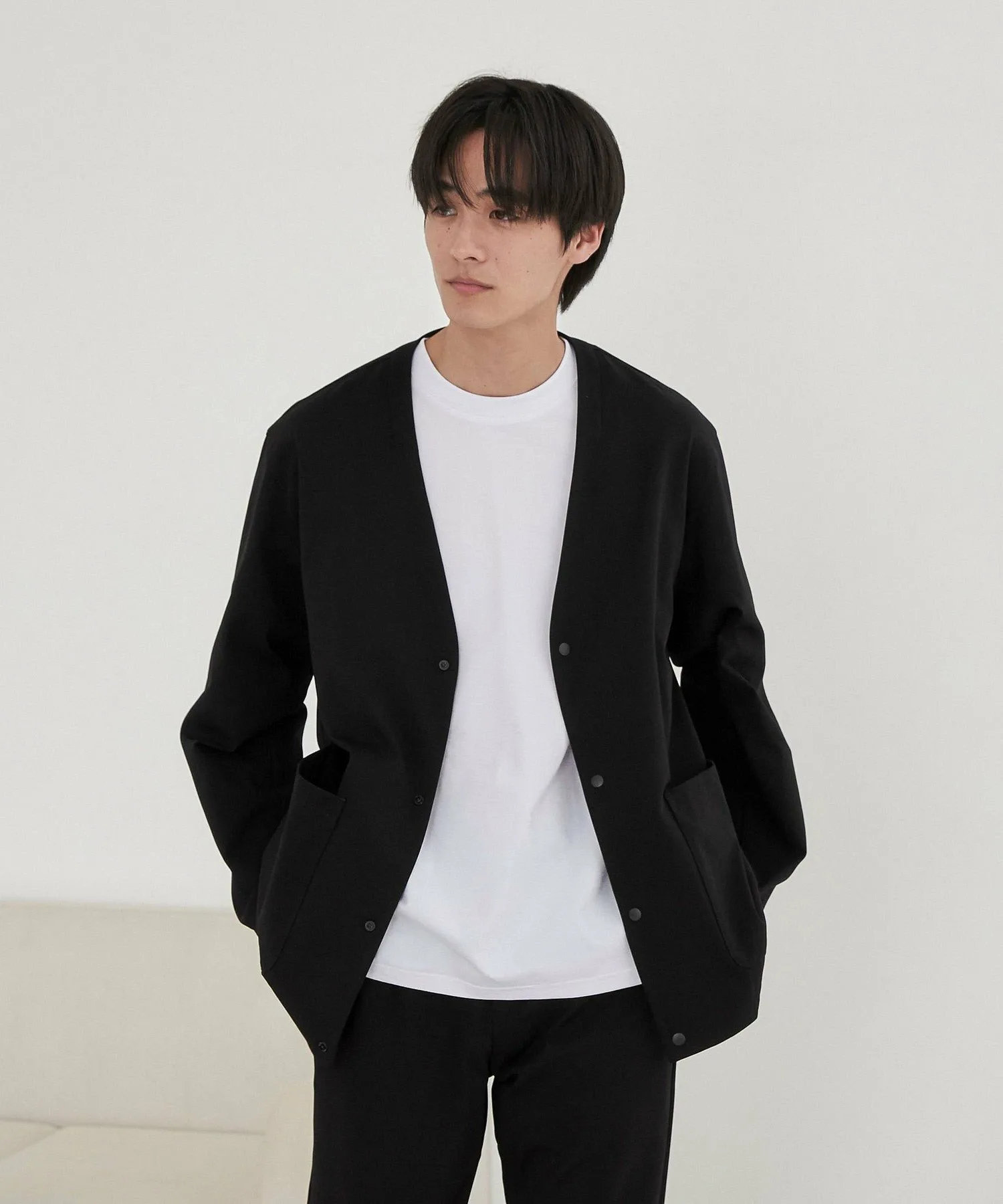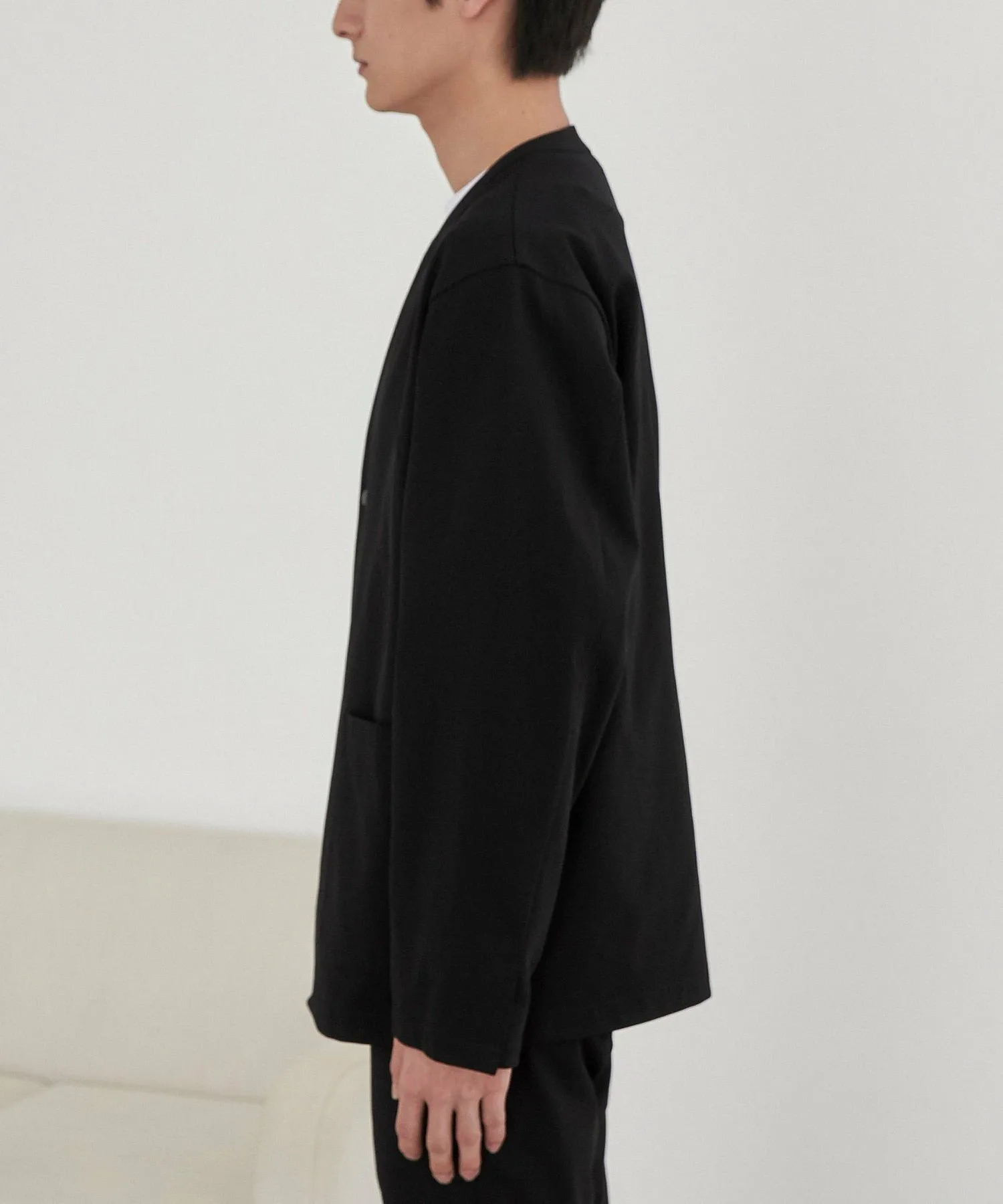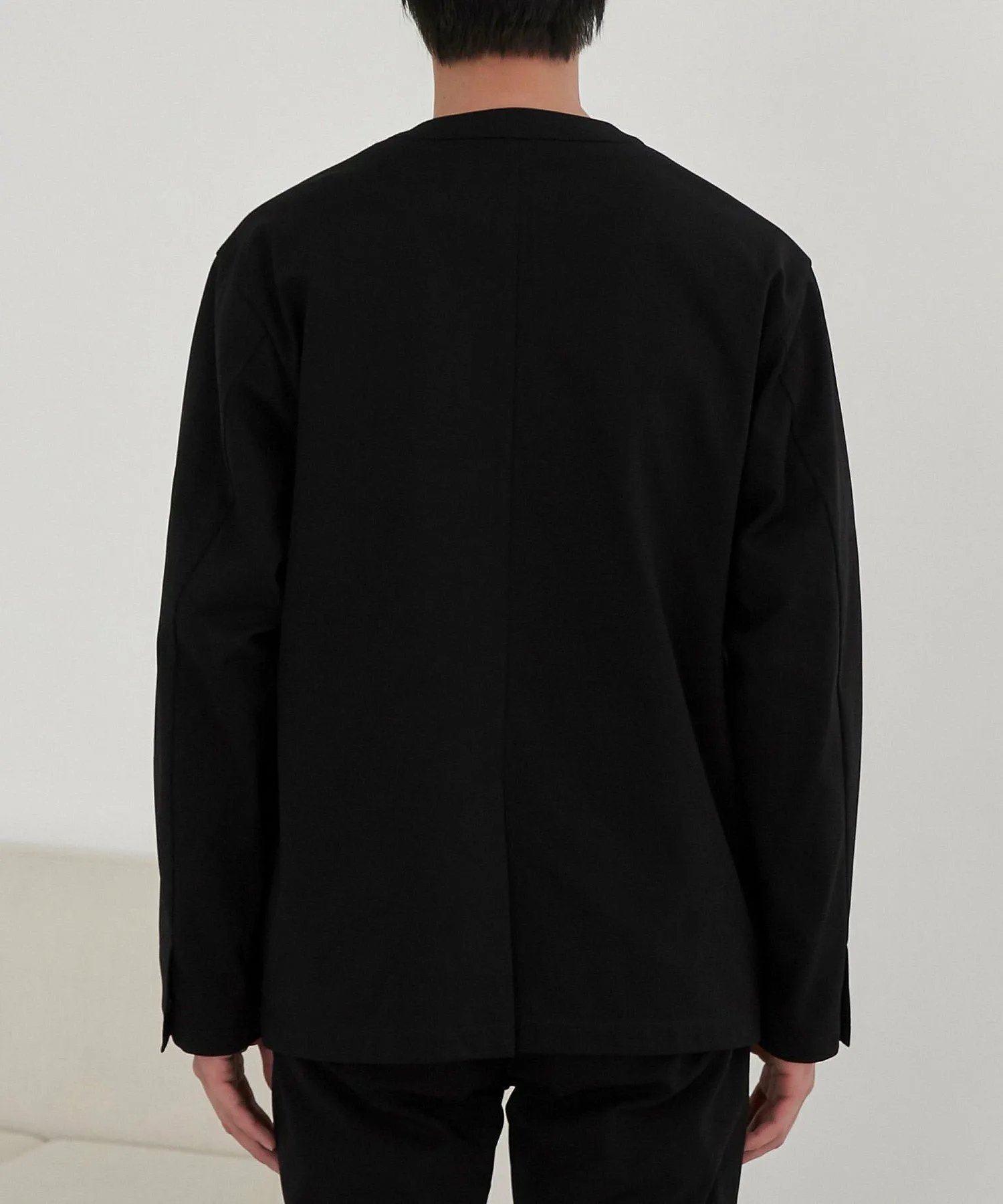 Куртка без воротника с изысканным дизайном, которую можно носить аккуратно.