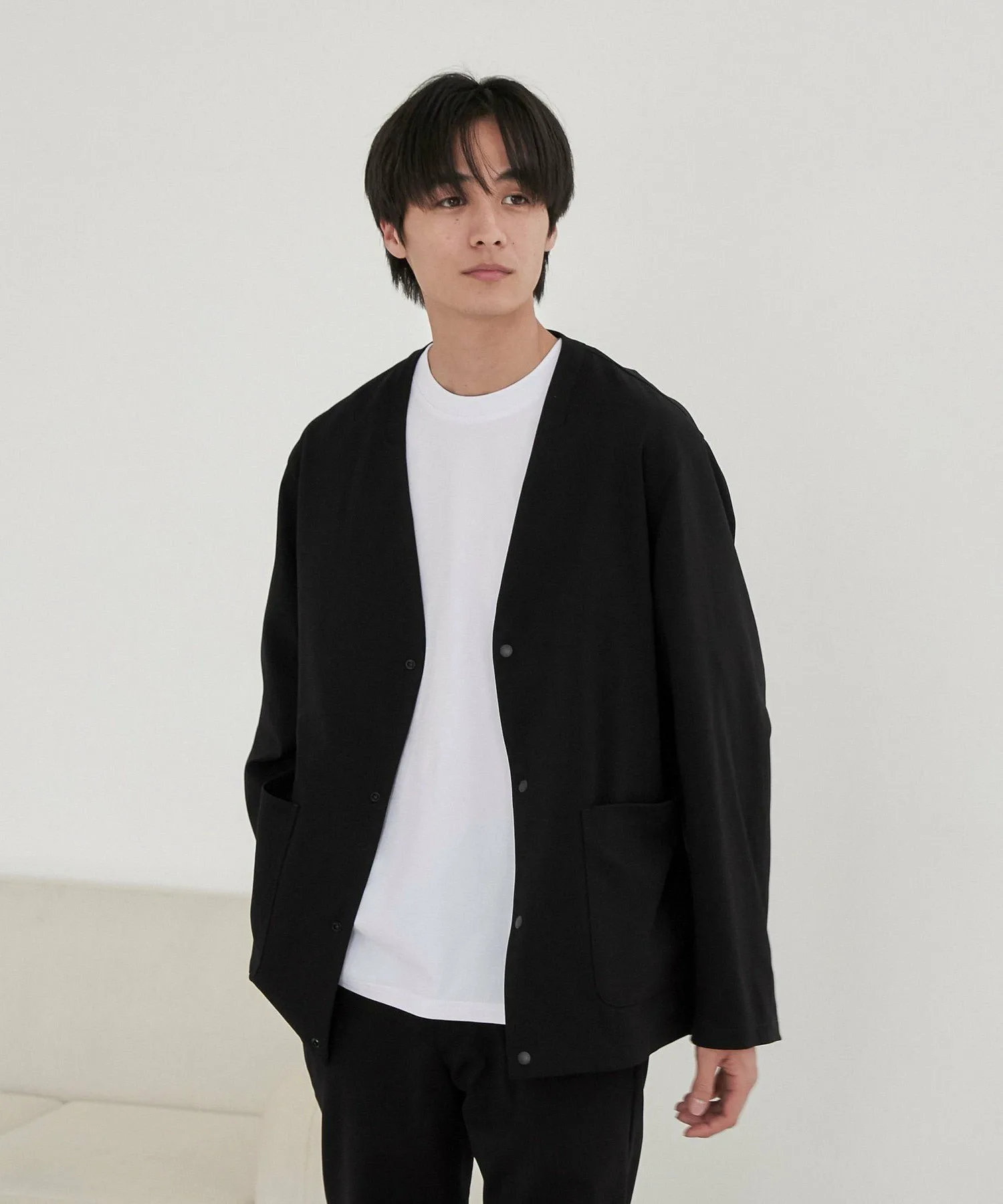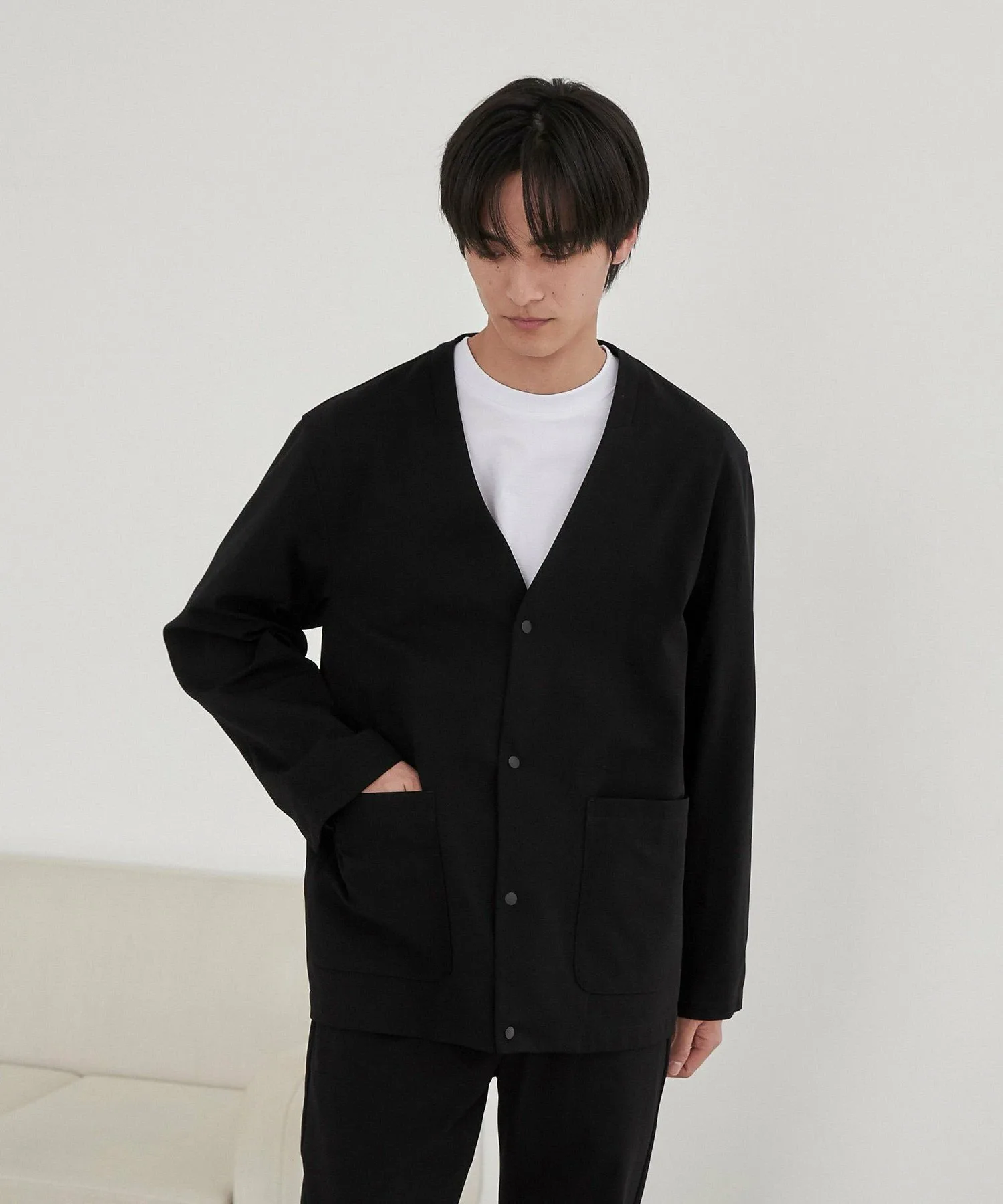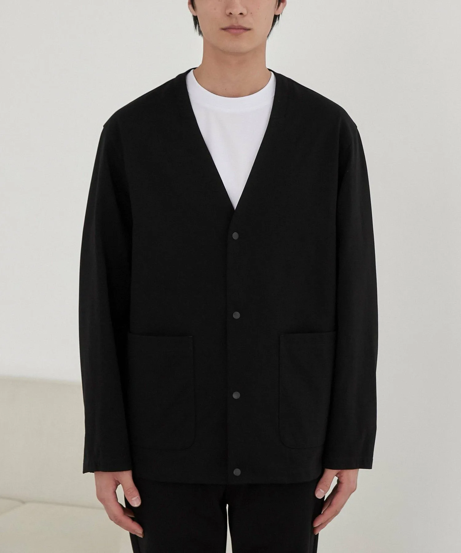 Куртка без воротника с изысканным дизайном, которую можно носить аккуратно.