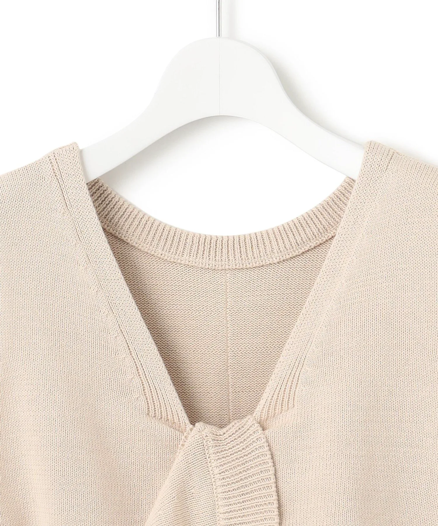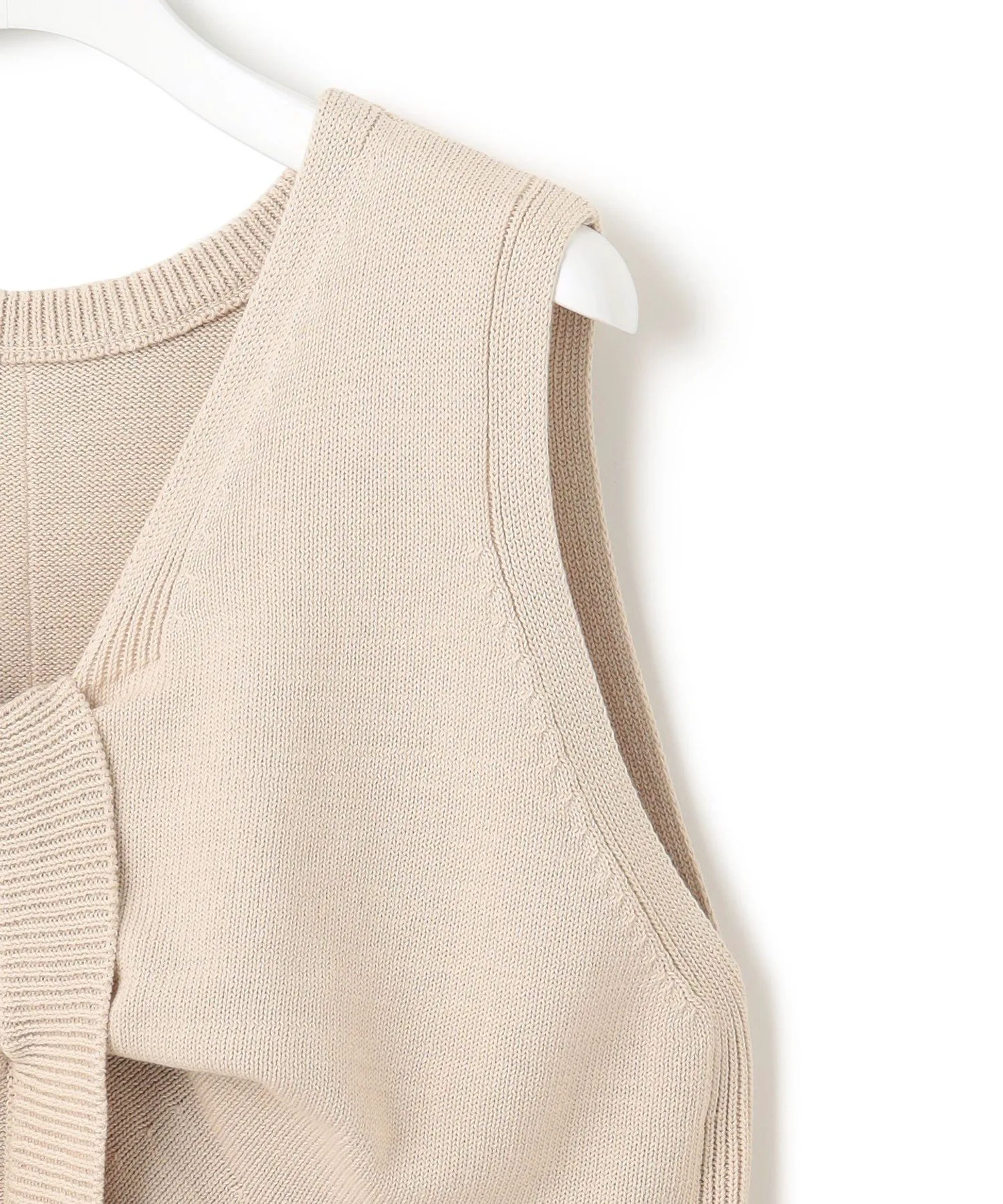 Этот трикотаж без рукавов выполнен из трикотажа. Передняя часть имеет витой узор, а задняя – складки для простой отделки. Его можно носить как спереди, так и сзади, что позволяет создавать разные образы в зависимости от настроения и наряда. Доступен в двух цветах: изысканном черном (#005) и натуральном бежевом (#033).