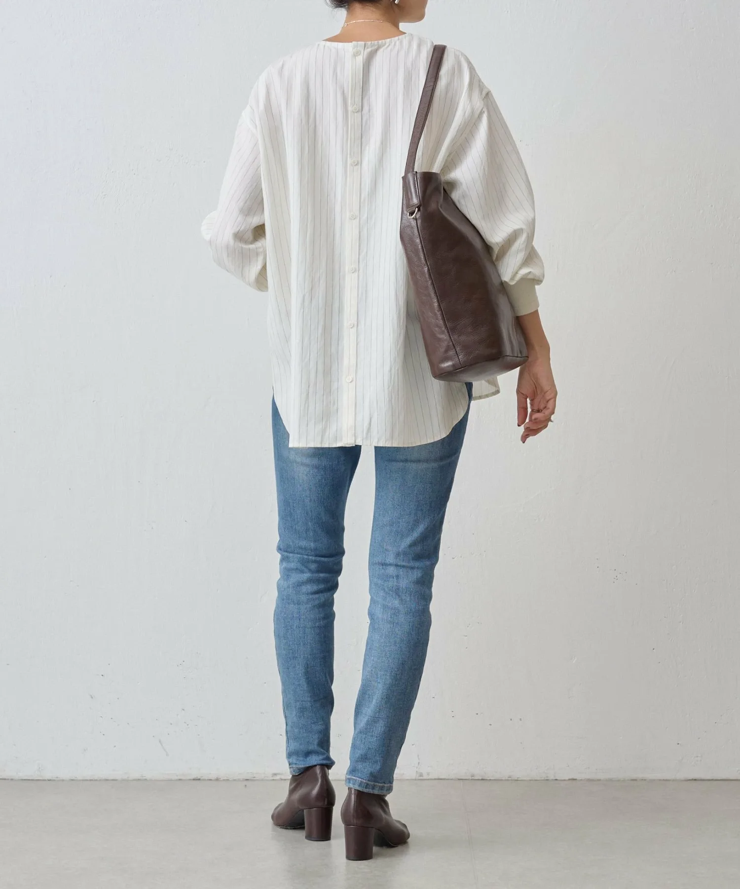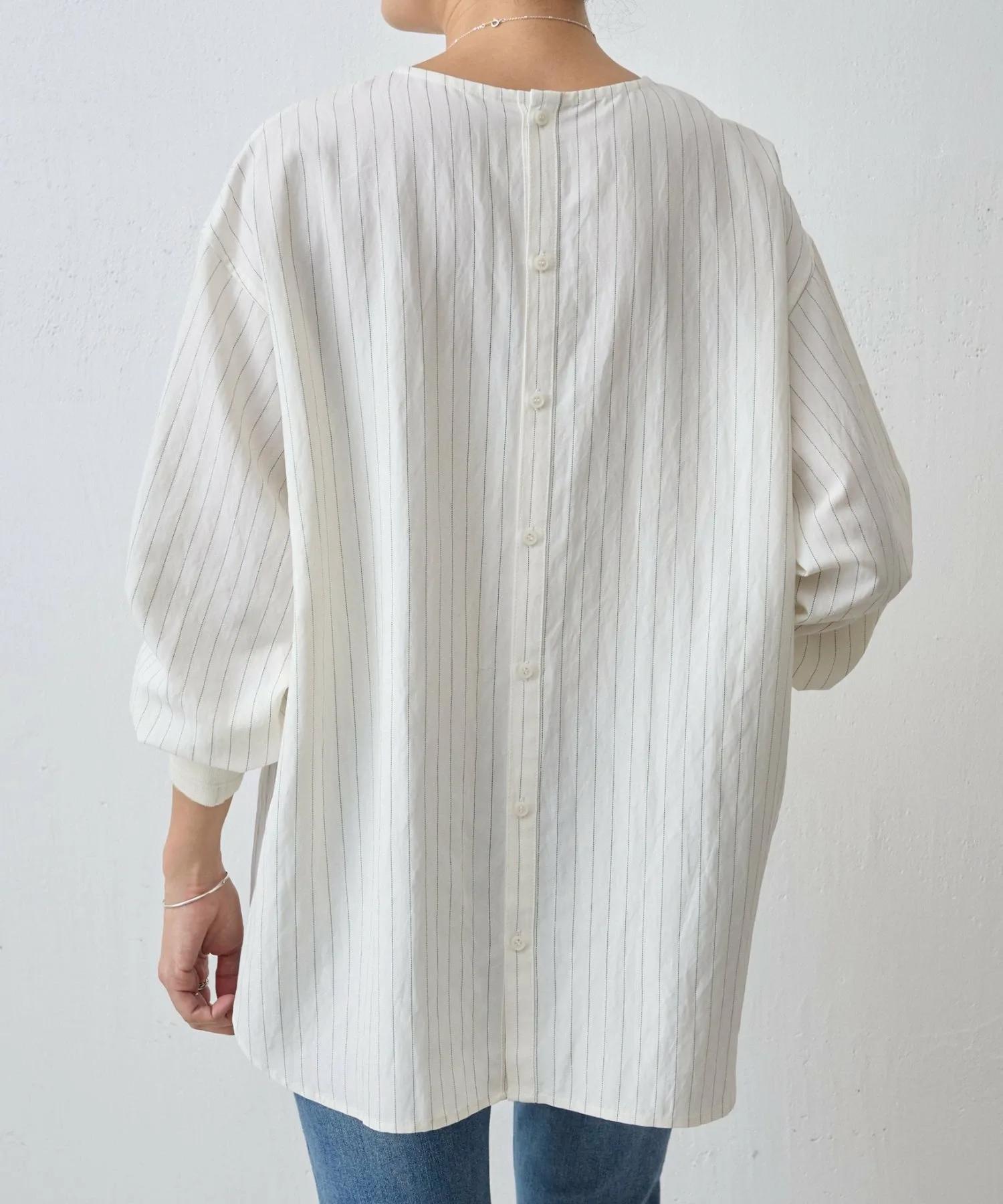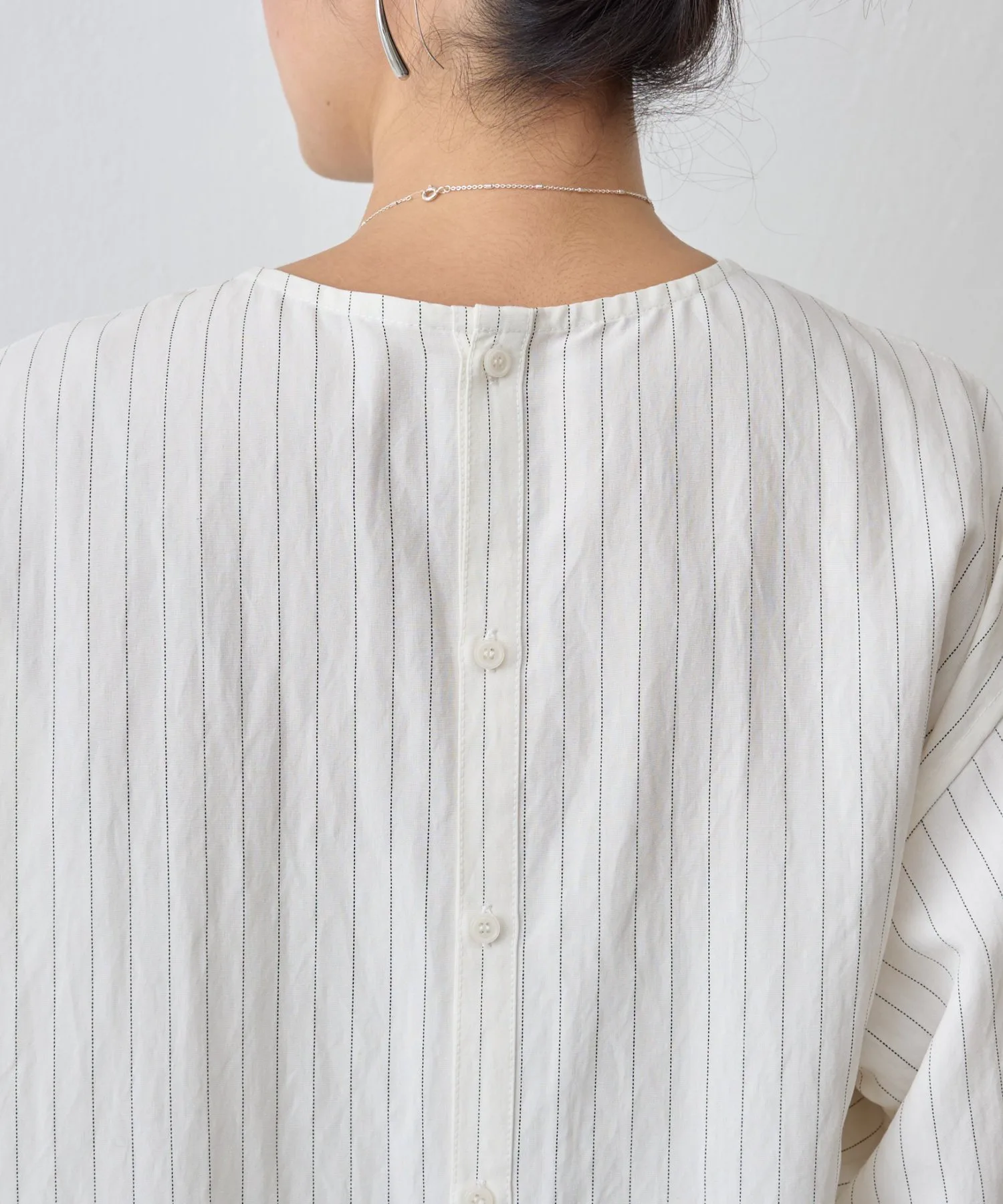 Пуловер с пуговицами на спине, демонстрирующий элегантный дизайн в тонкую полоску.