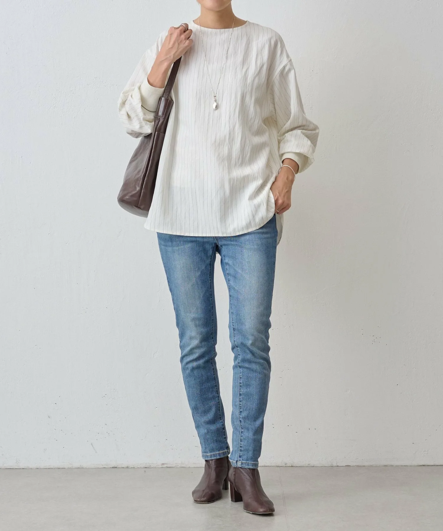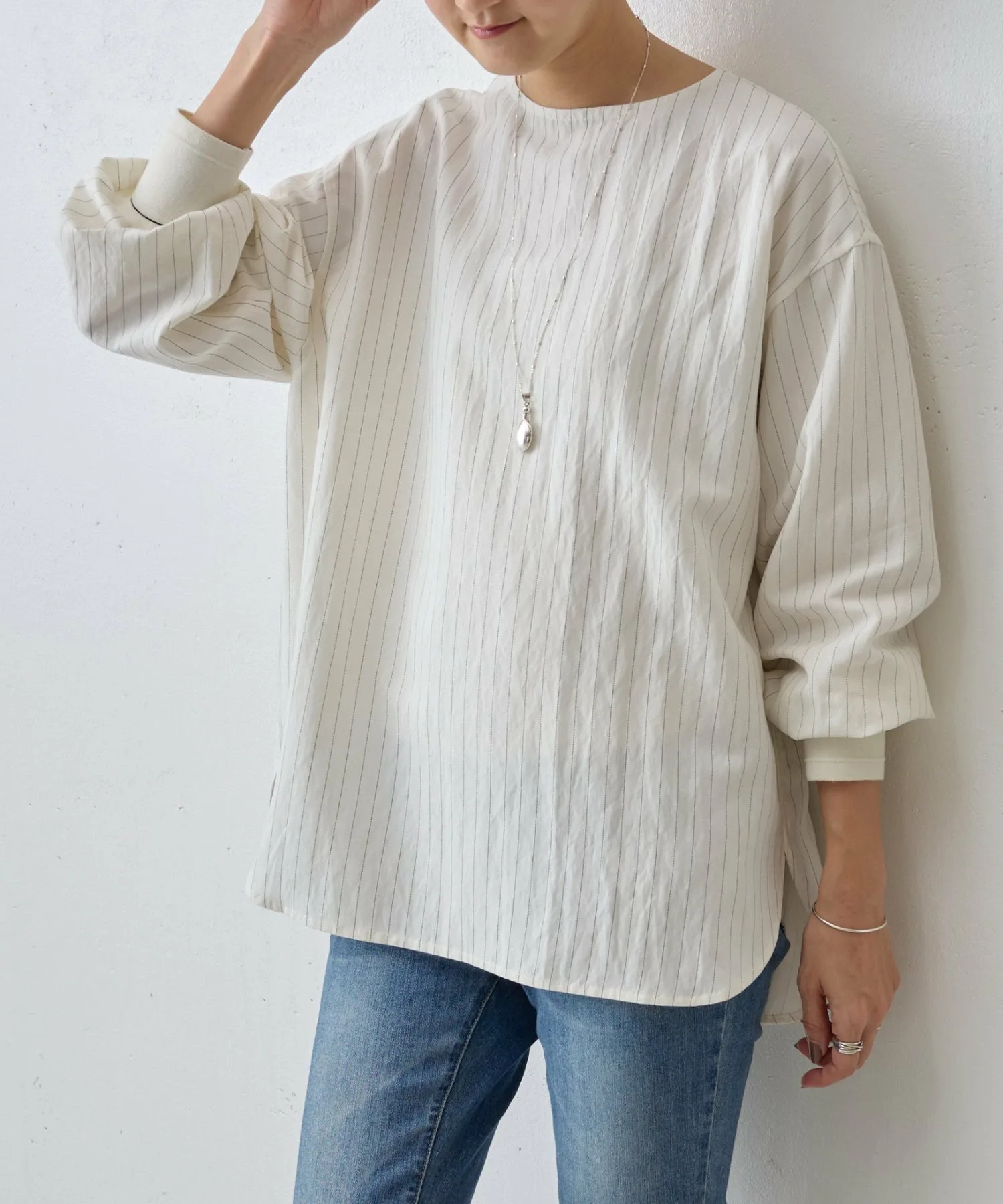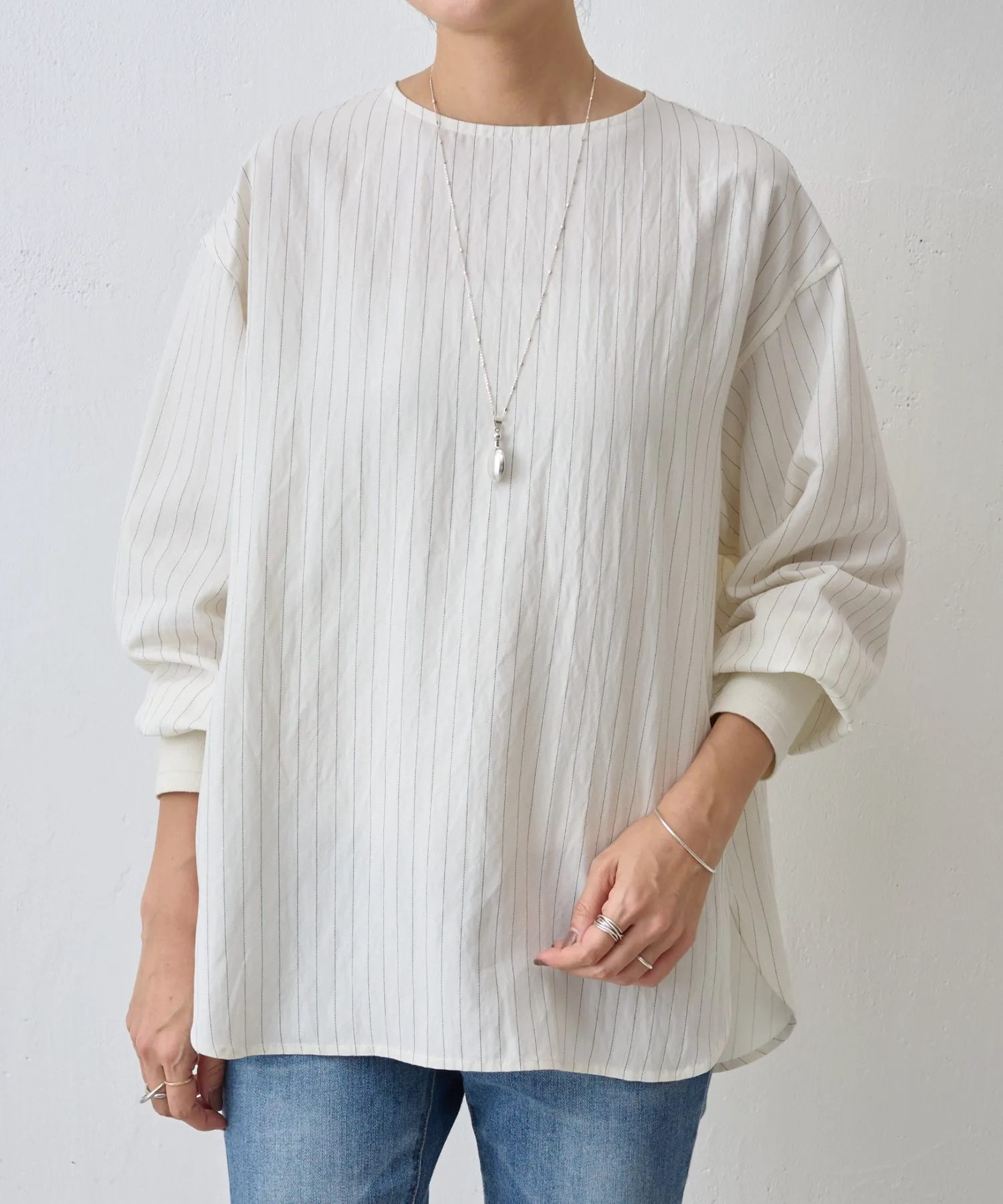 Пуловер с пуговицами на спине, демонстрирующий элегантный дизайн в тонкую полоску.