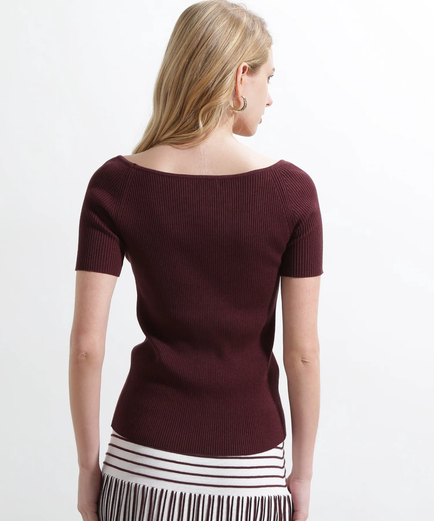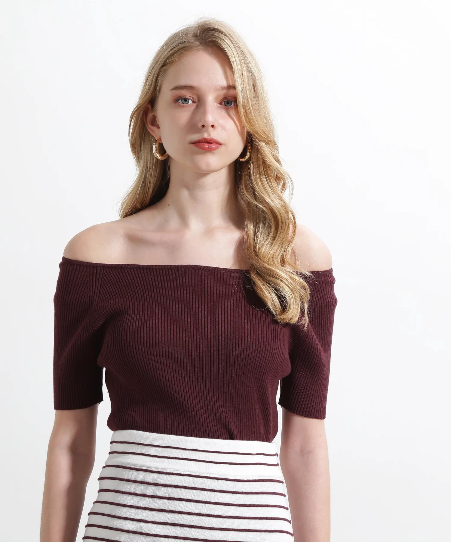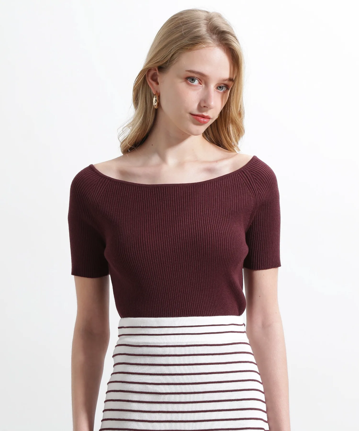 Трикотажная блузка с широким вырезом горловины. Тонкая ребристая вязка с плотным натяжением обеспечивает комфортную посадку, а также позволяет создать эффект открытых плеч, опустив вырез до самого низа. Умеренная линия талии позволяет изделию естественно повторять контуры тела до самого низа. Эта вещь хорошо сочетается с любыми брюками или юбками.