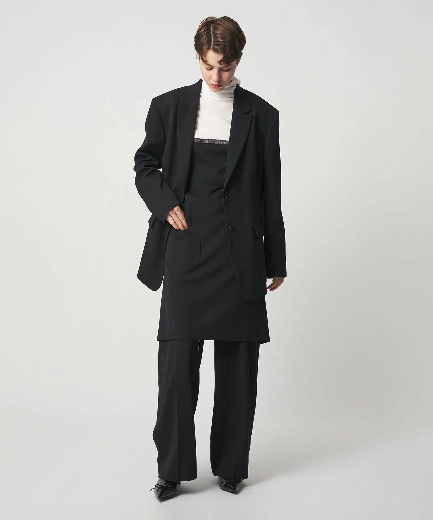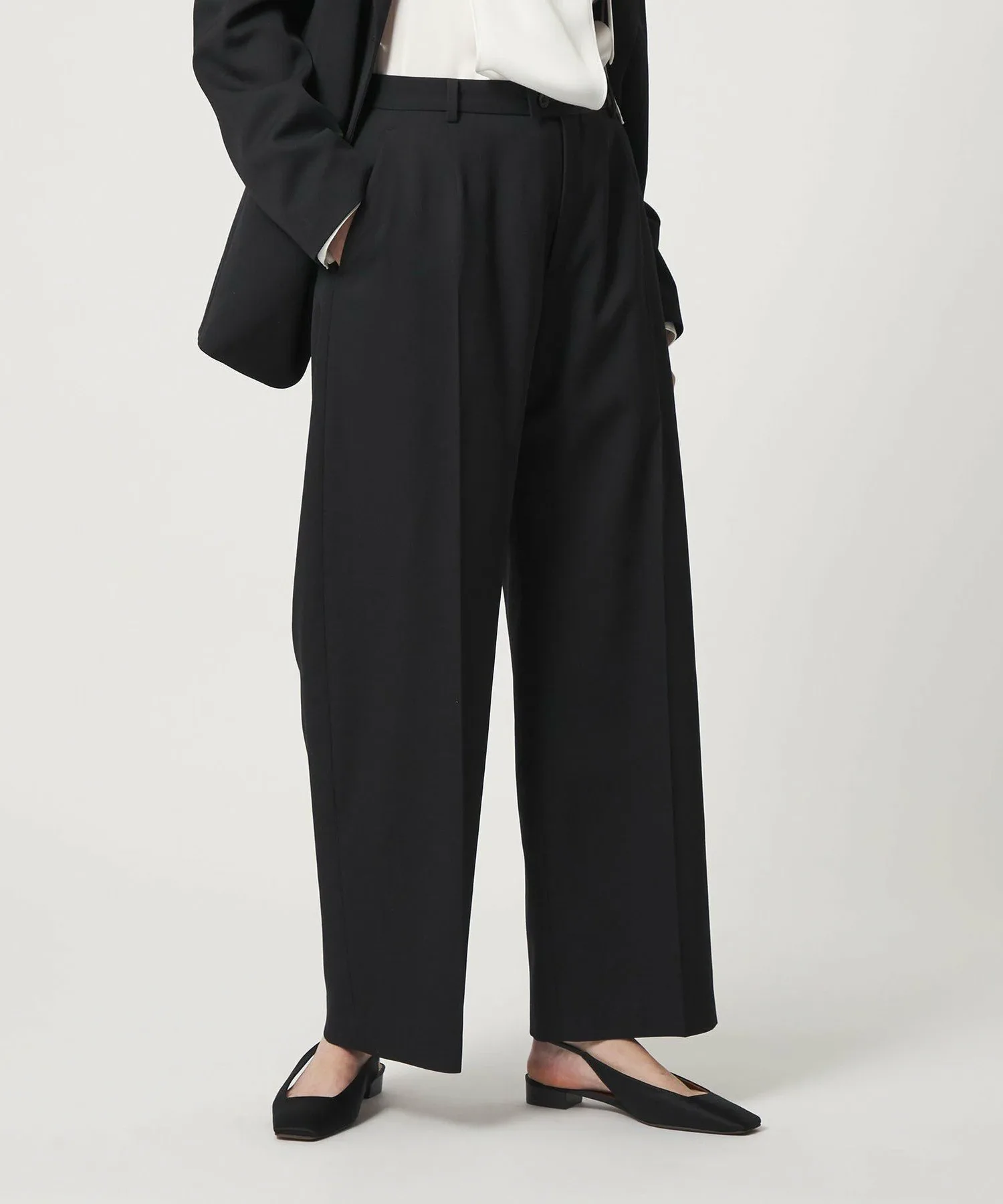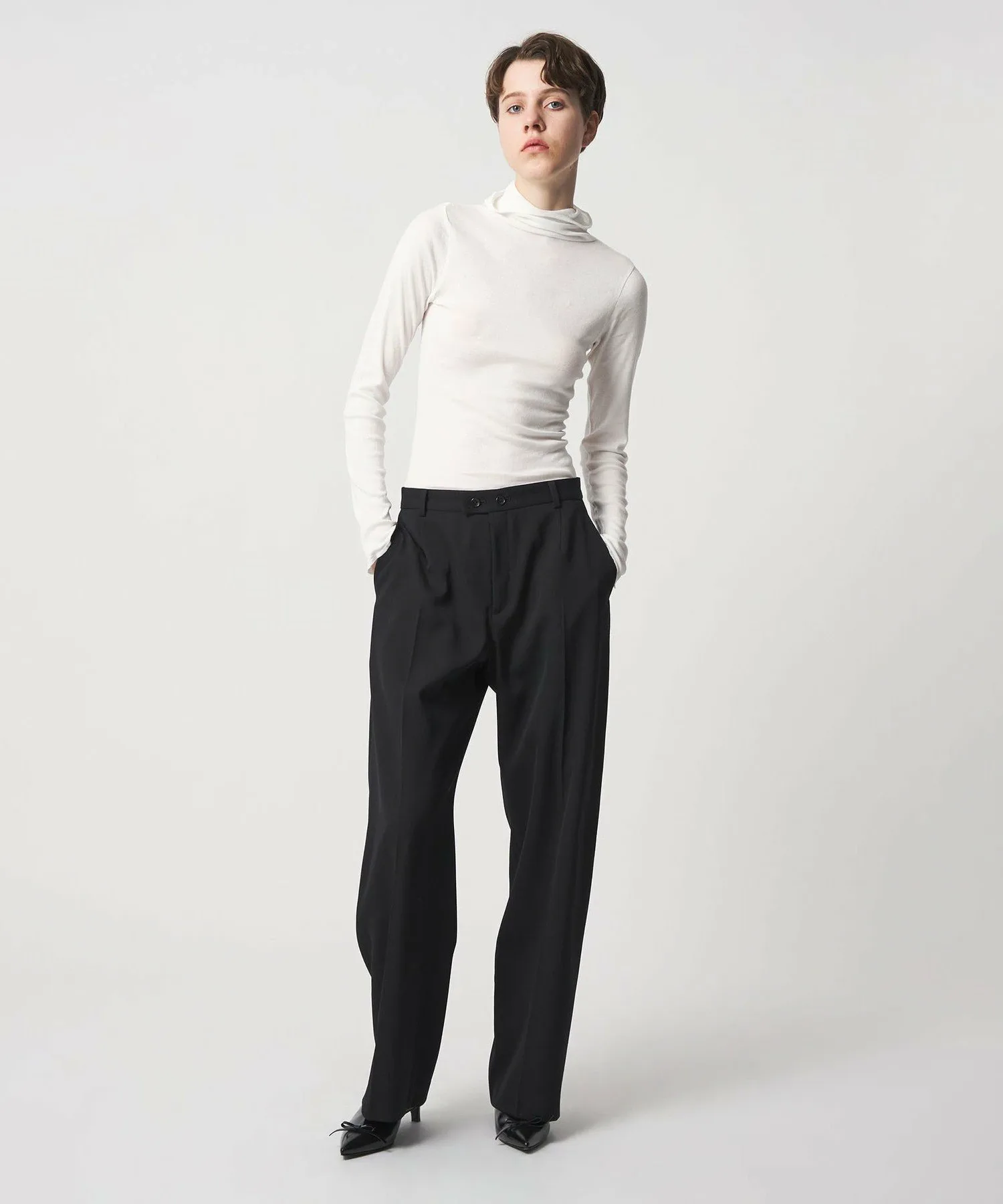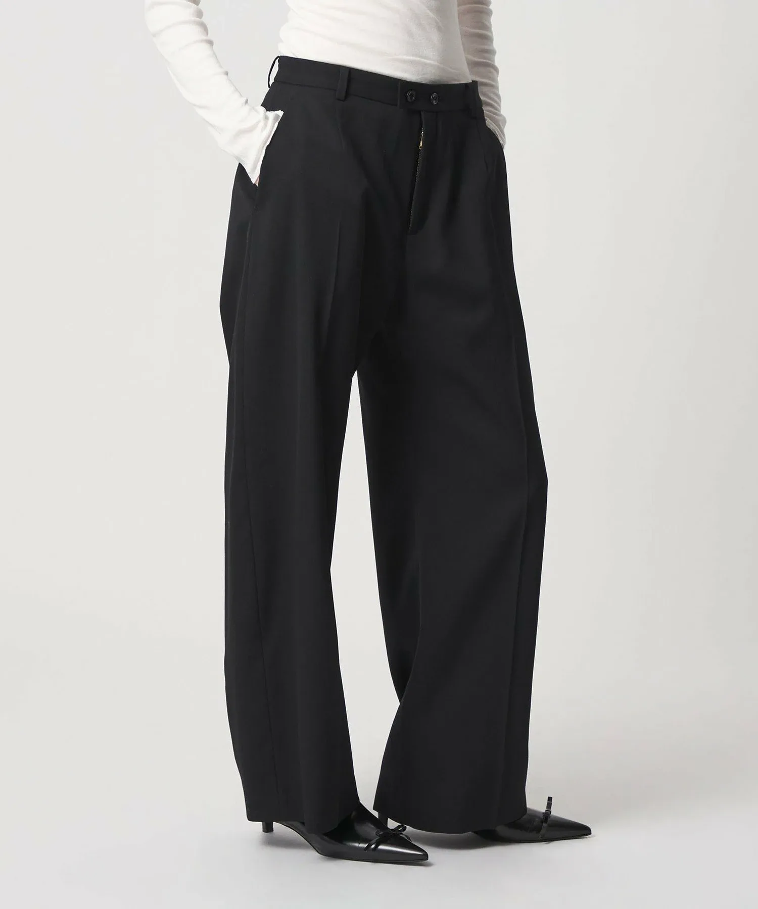 Эти брюки изготовлены из шерстяной ткани с легким блеском и оптимальной плотностью и жесткостью. Плавные изгибы создают непринужденный, но элегантный силуэт. Сочетайте их с жакетом ) или фартуком .