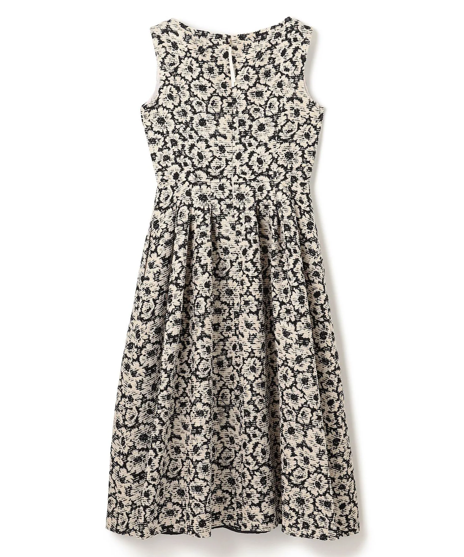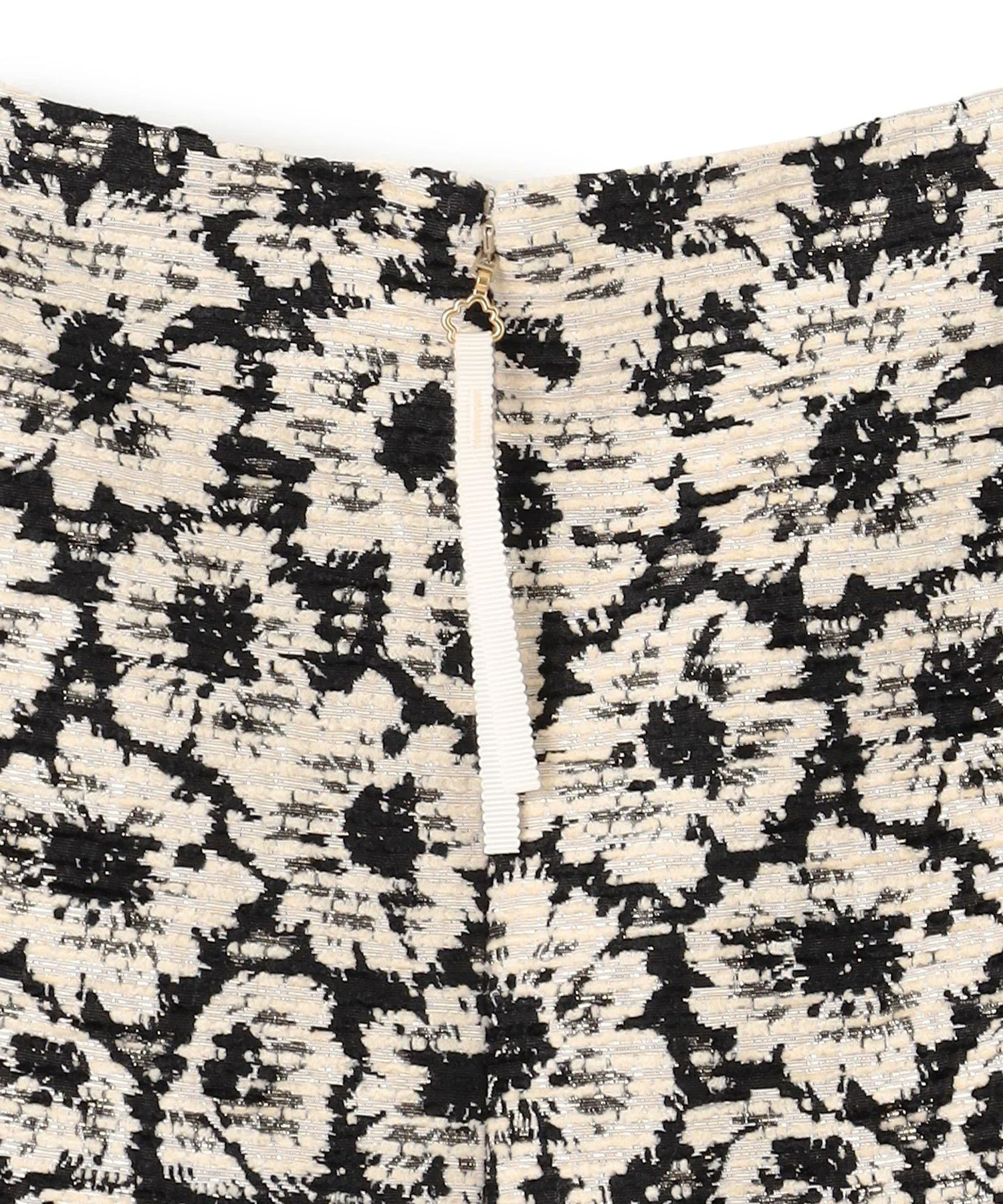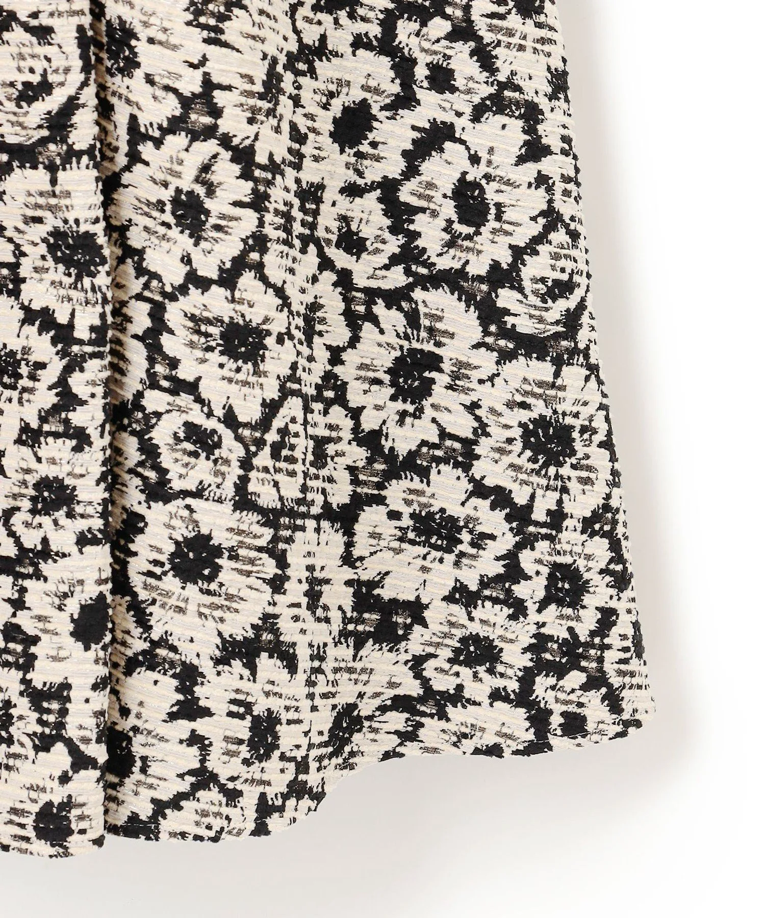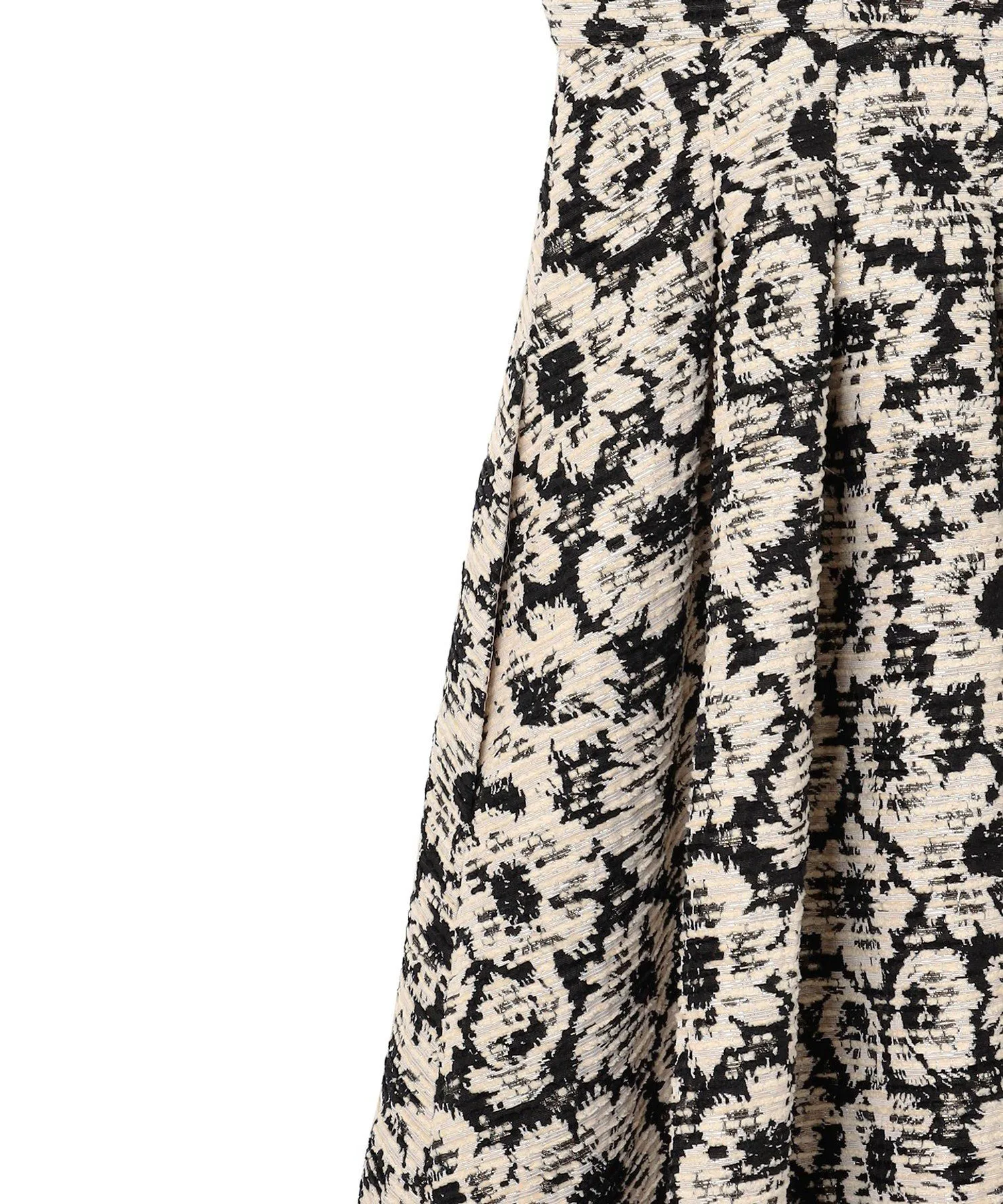 Шикарная черно-бежевая цветовая гамма придает этому платью классический, утонченный и женственный вид. Силуэт «приталенный и расклешенный» добавляет драматичности и нежности. Пушистый жаккард с цветочным узором, тонко переплетенный с блестками, добавляет элегантности. Умеренная плотность и натяжение ткани выгодно подчеркивают фигуру, не облегая тело.