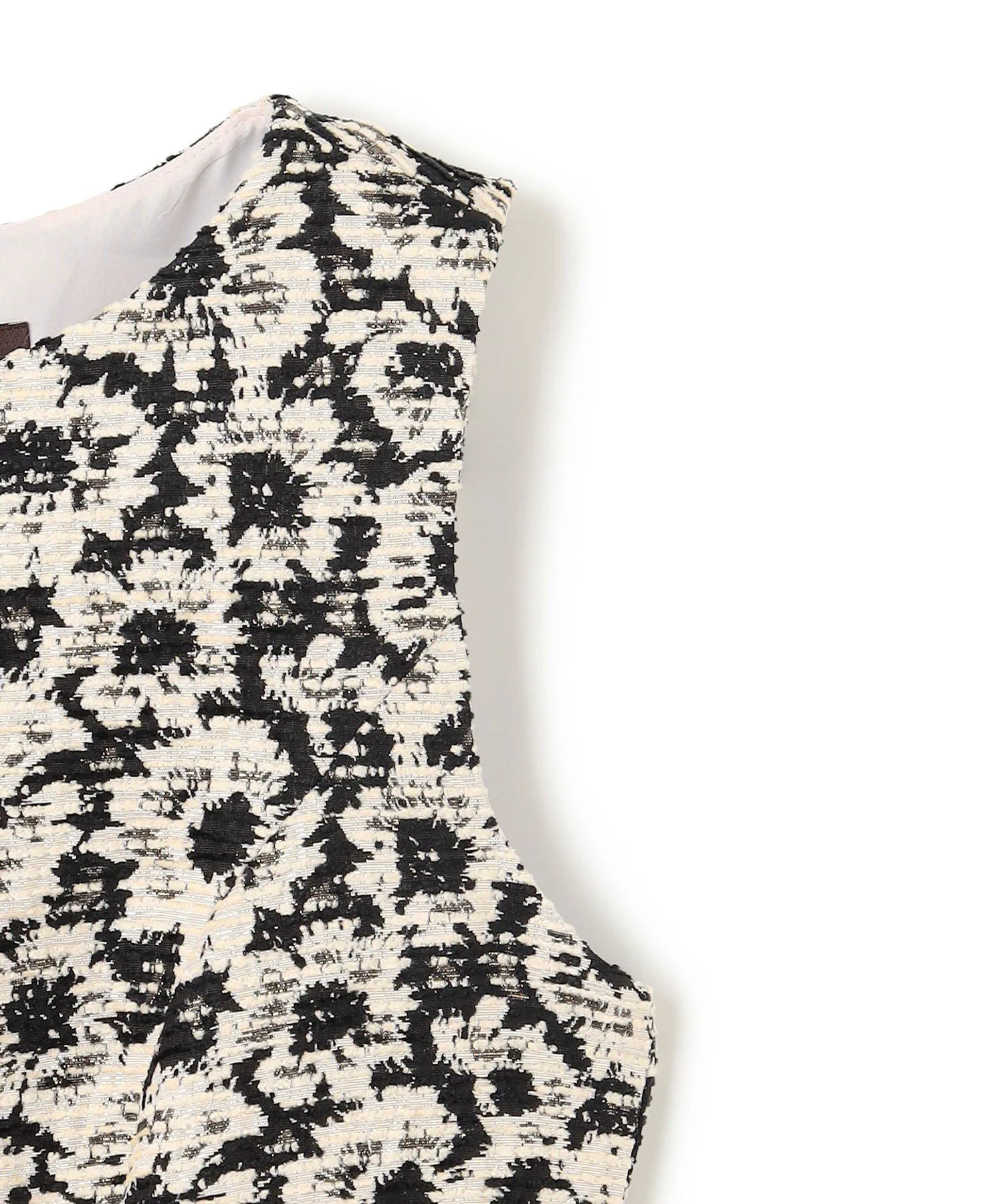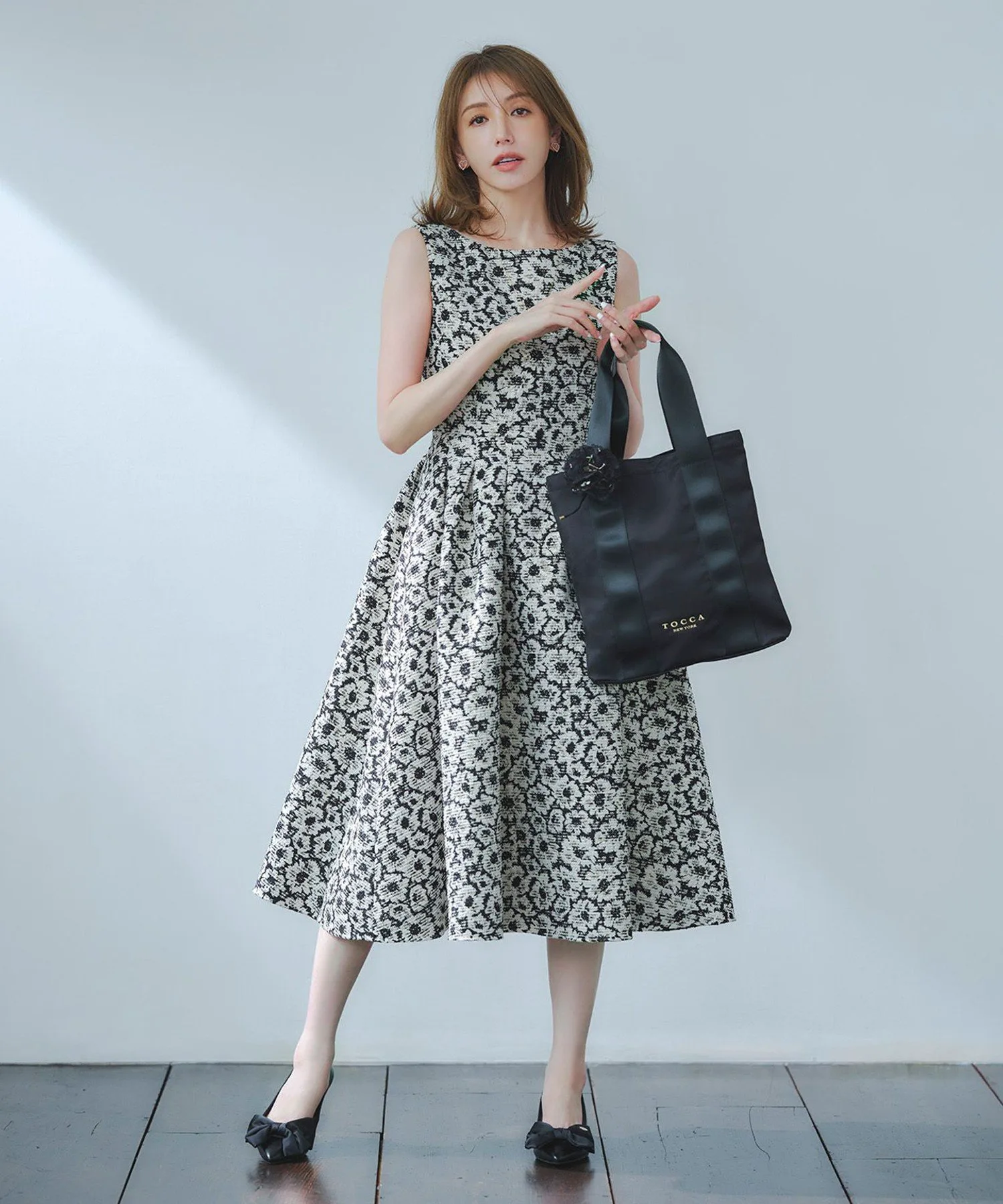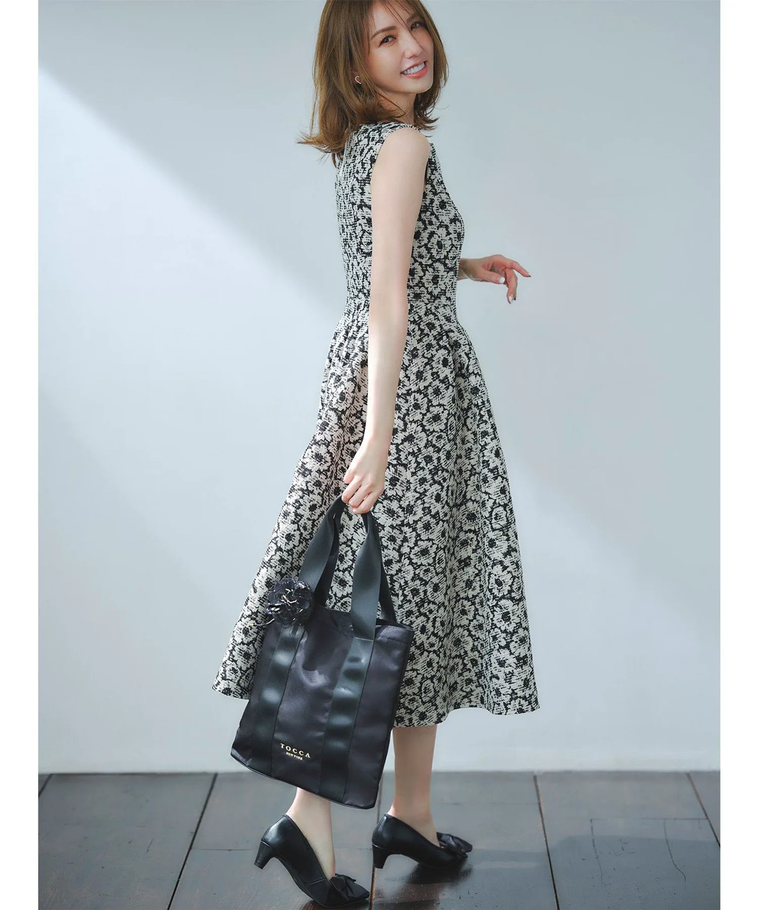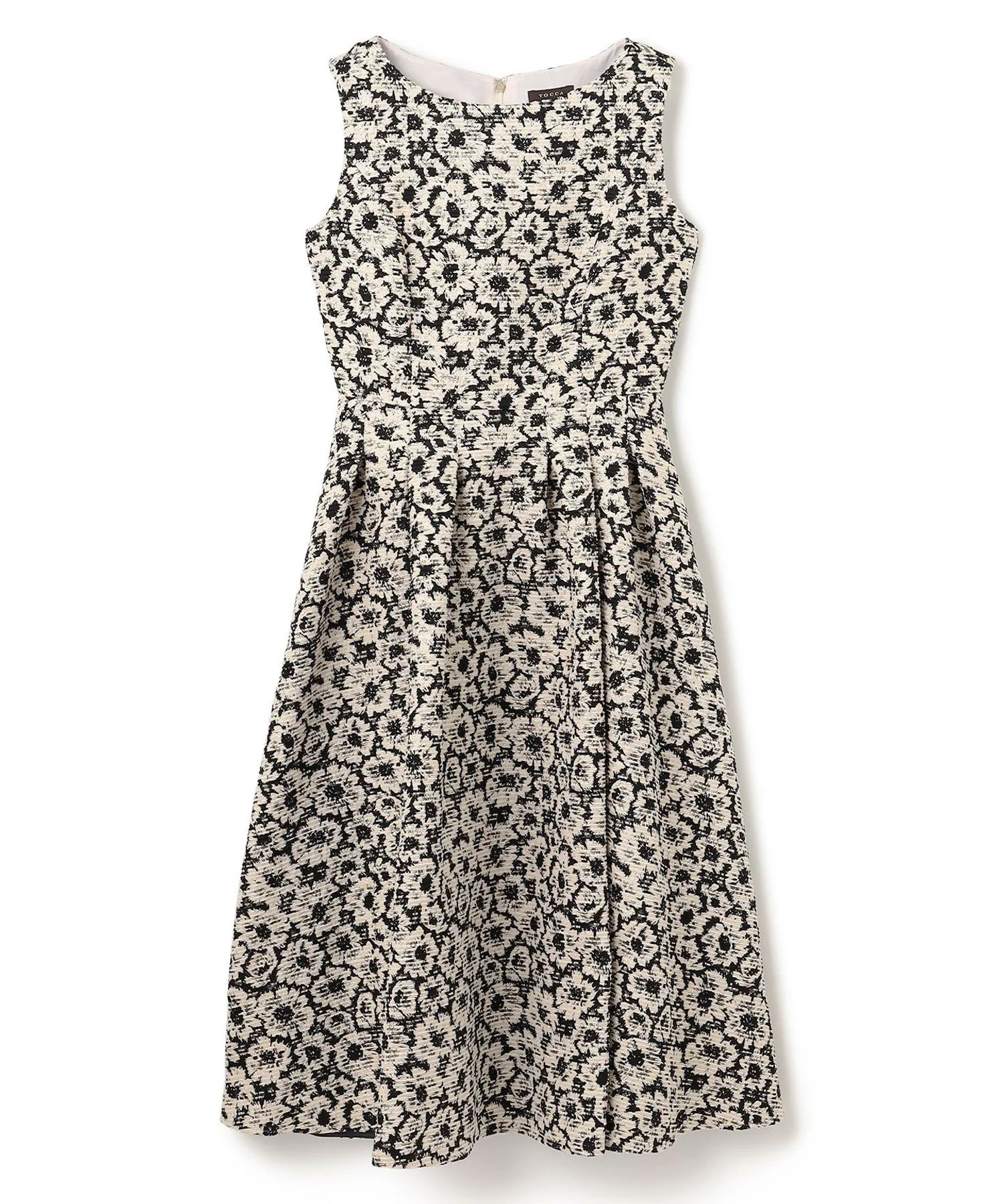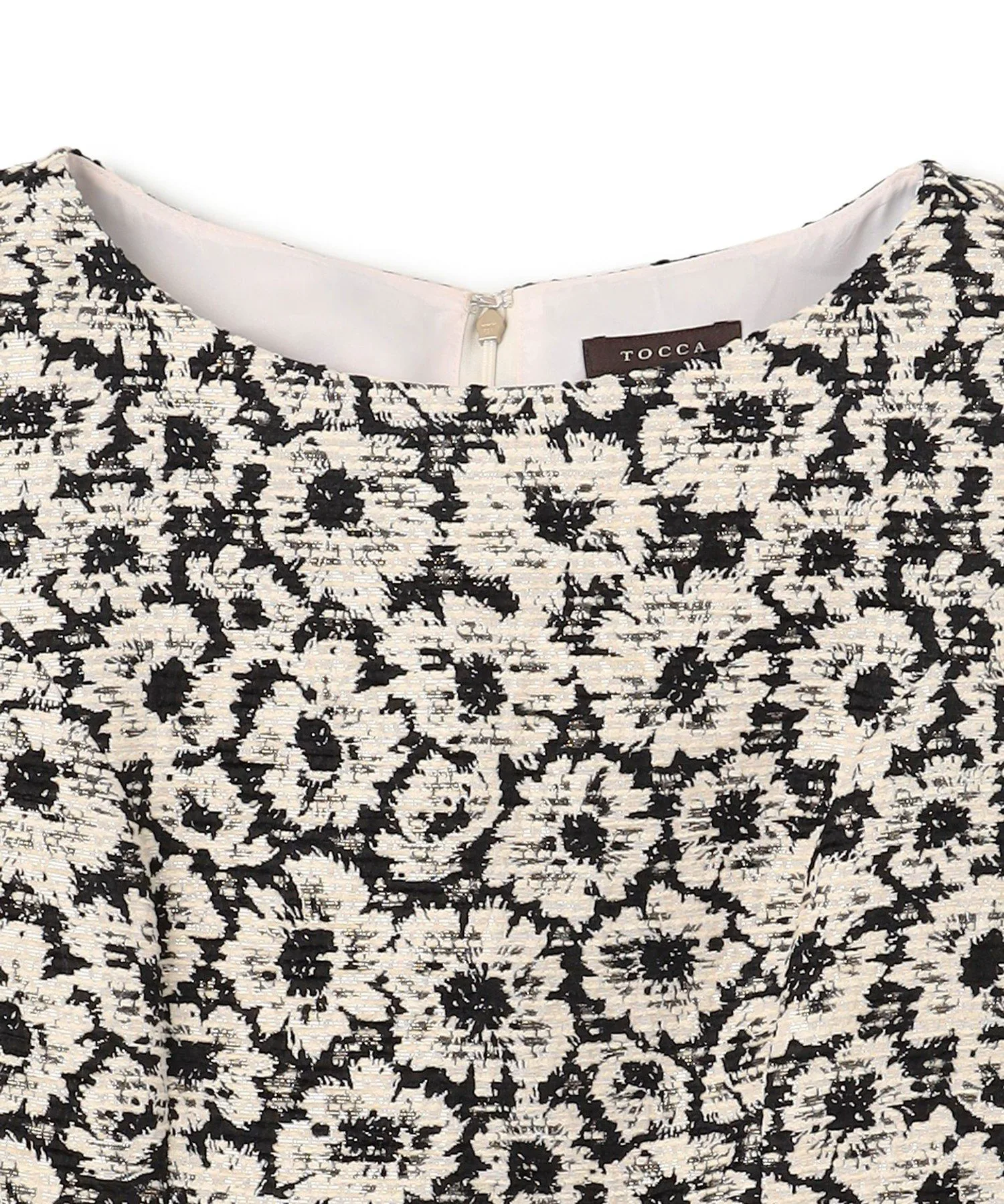 Шикарная черно-бежевая цветовая гамма придает этому платью классический, утонченный и женственный вид. Силуэт «приталенный и расклешенный» добавляет драматичности и нежности. Пушистый жаккард с цветочным узором, тонко переплетенный с блестками, добавляет элегантности. Умеренная плотность и натяжение ткани выгодно подчеркивают фигуру, не облегая тело.