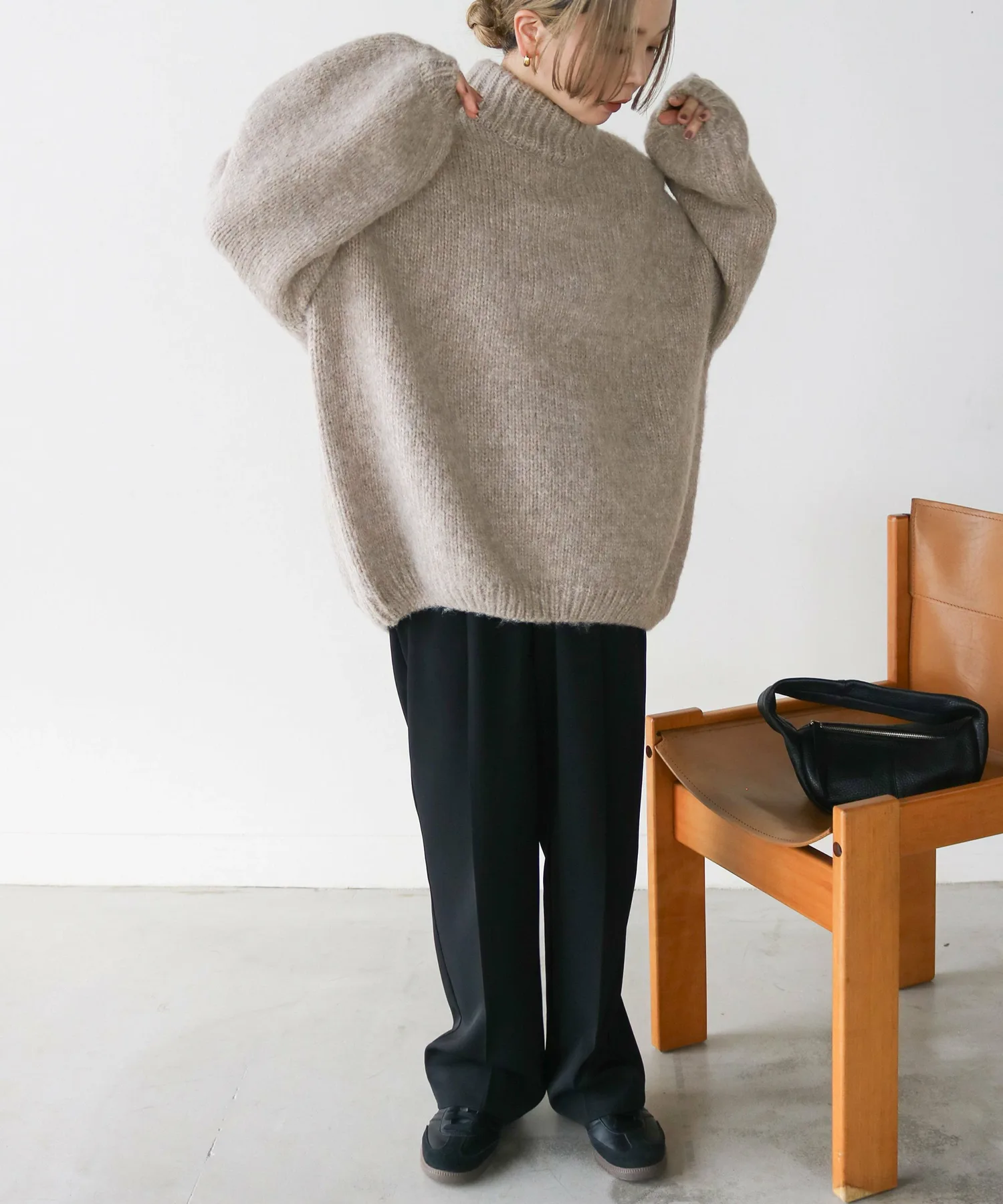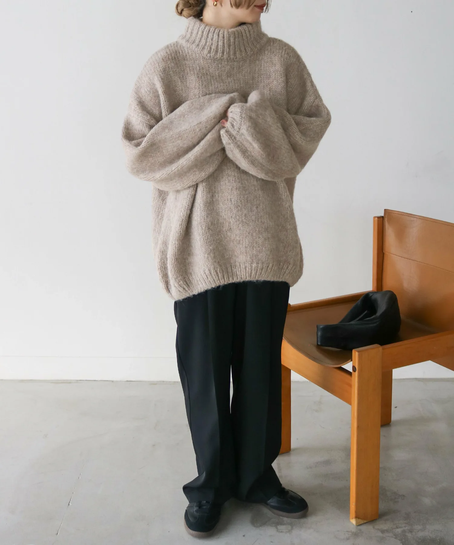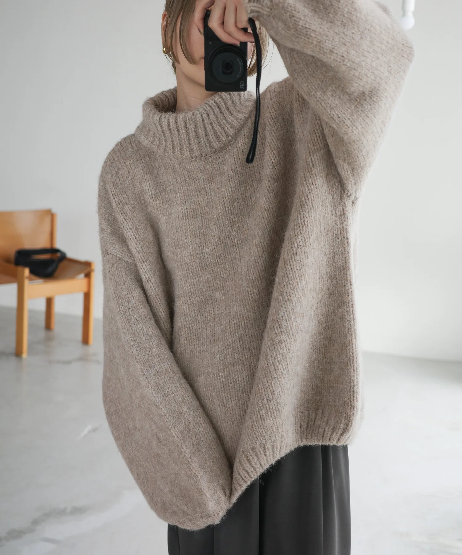Милый, свободный вязаный свитер с округлым, обволакивающим силуэтом.