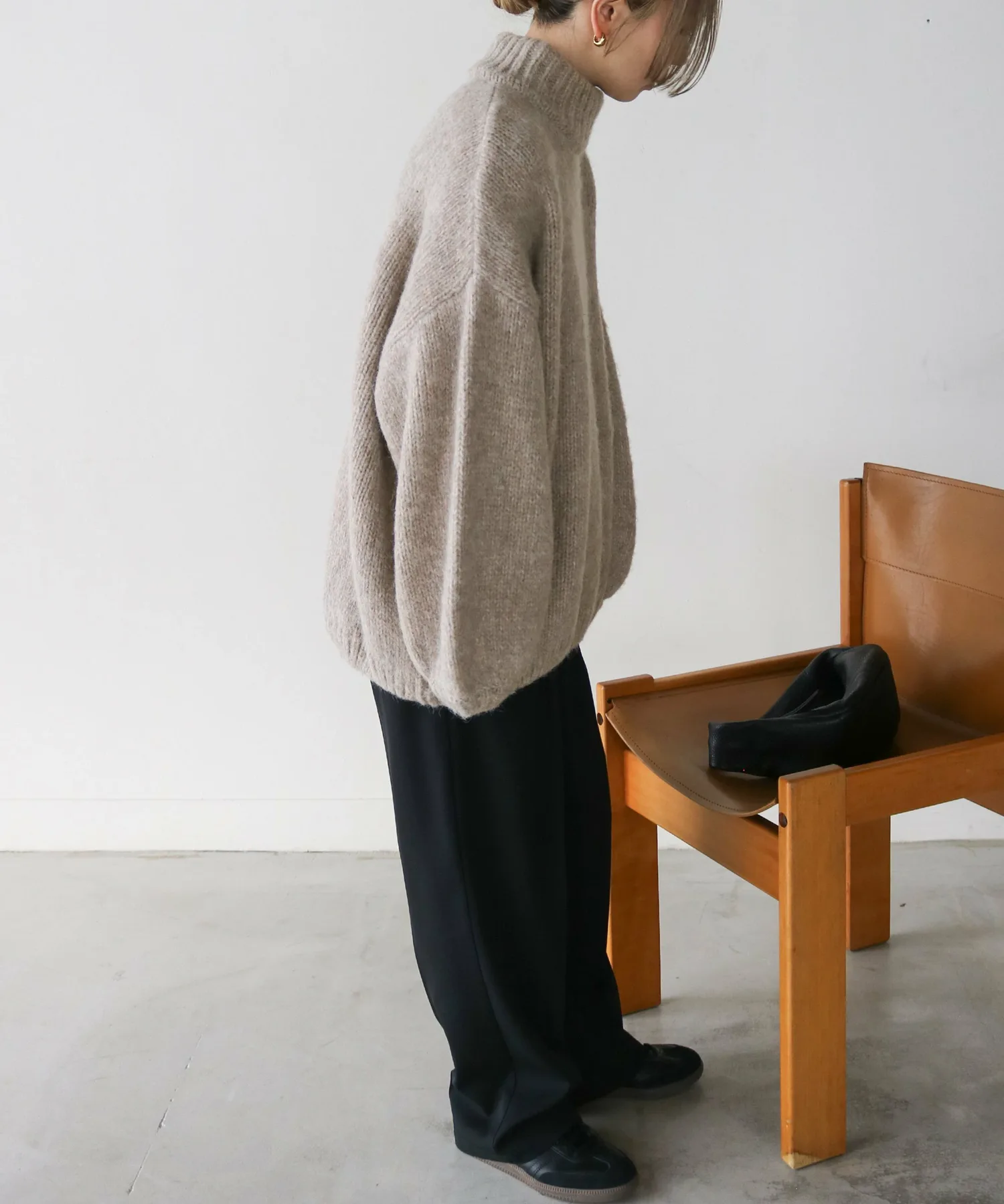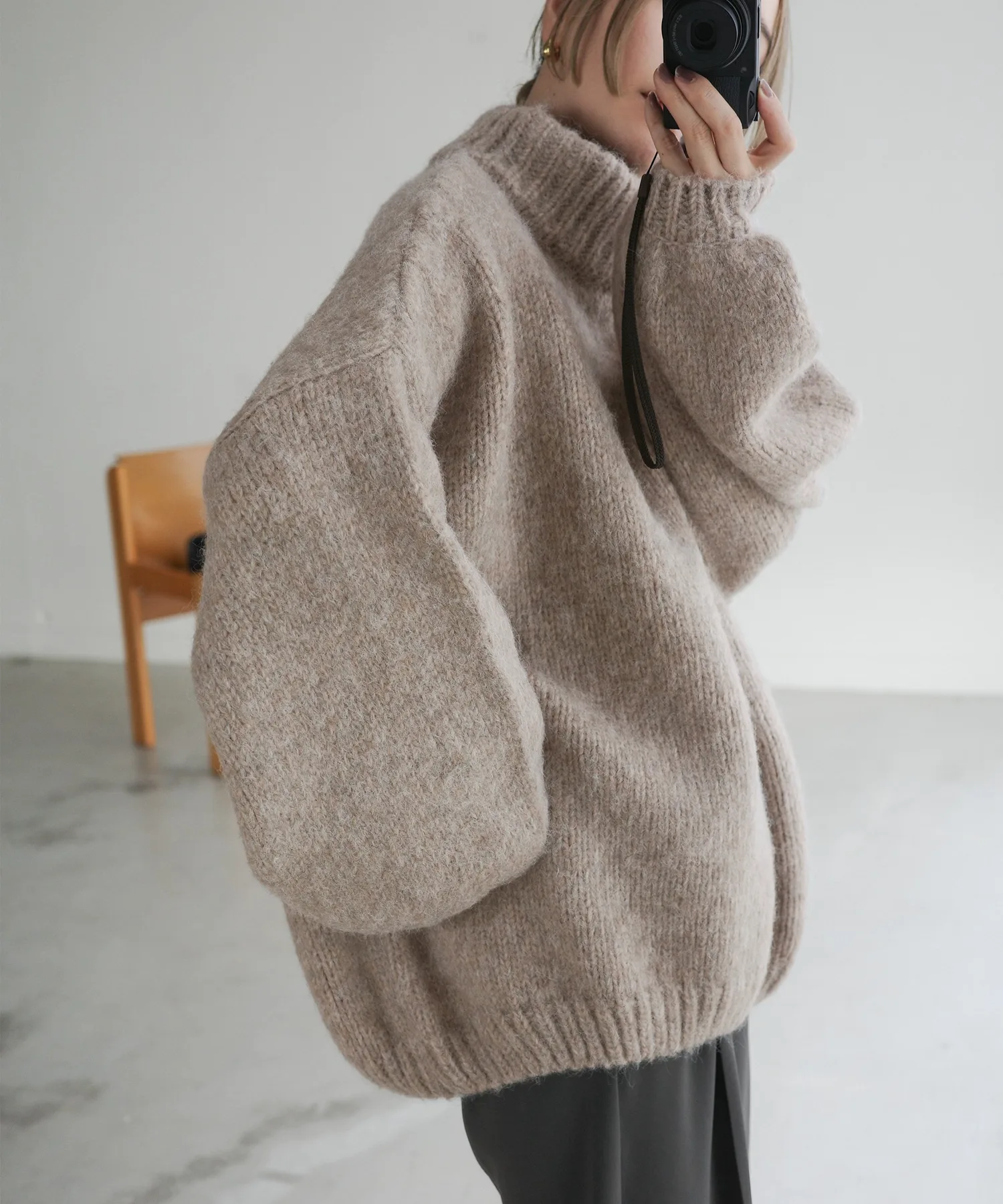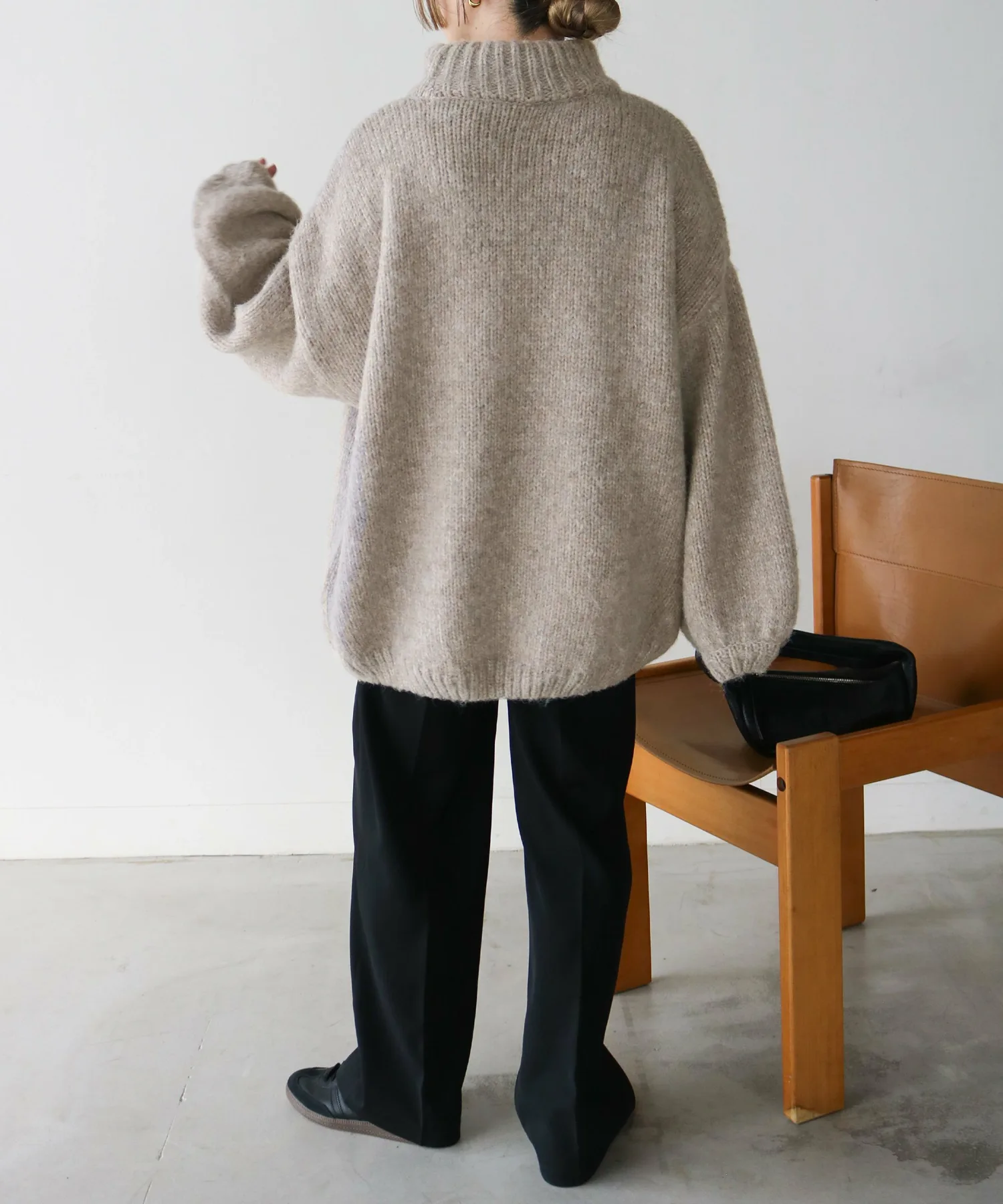 Милый, свободный вязаный свитер с округлым, обволакивающим силуэтом.