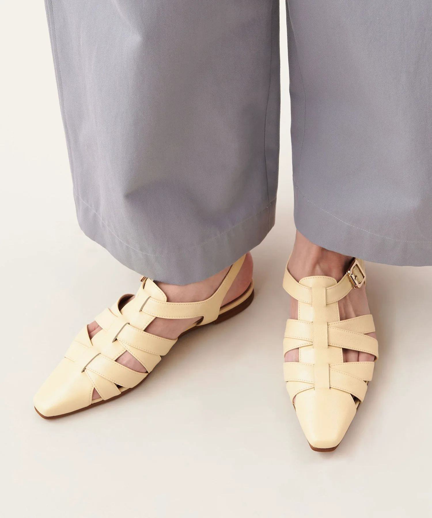 Эти балетки имеют перекрестный ремешок, мягко облегающий подъем стопы, и длинный квадратный носок, что придает им утонченный и элегантный вид.