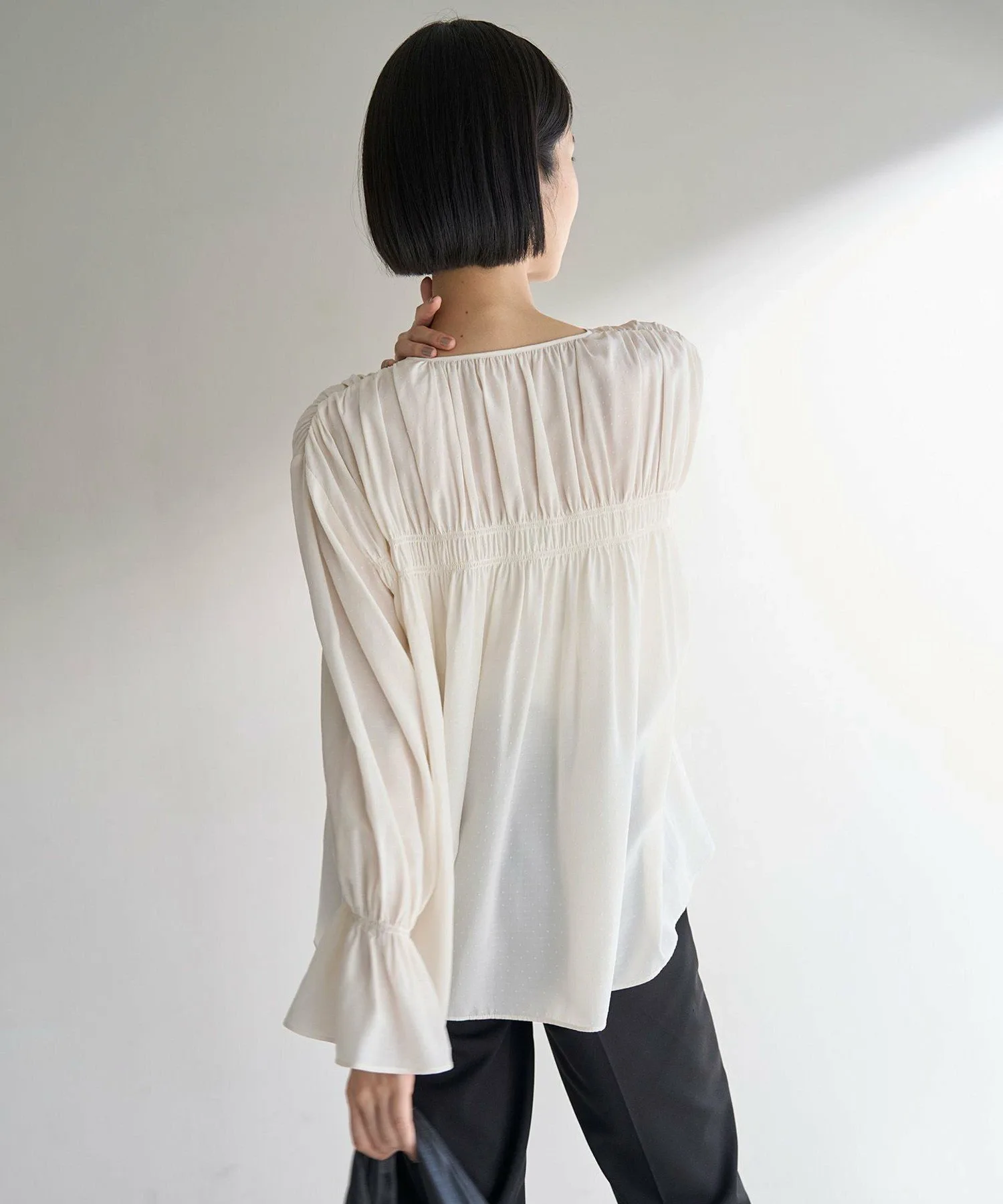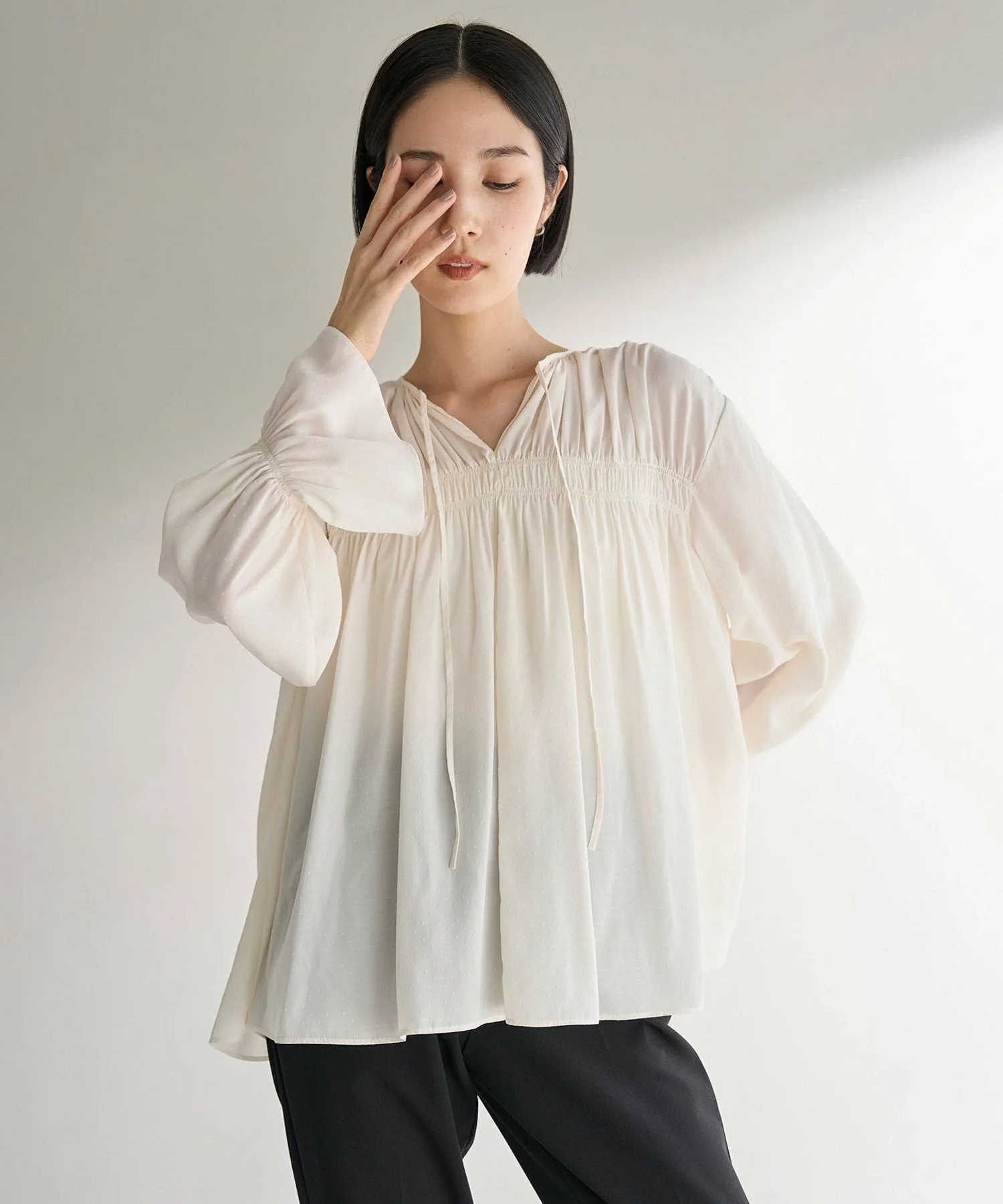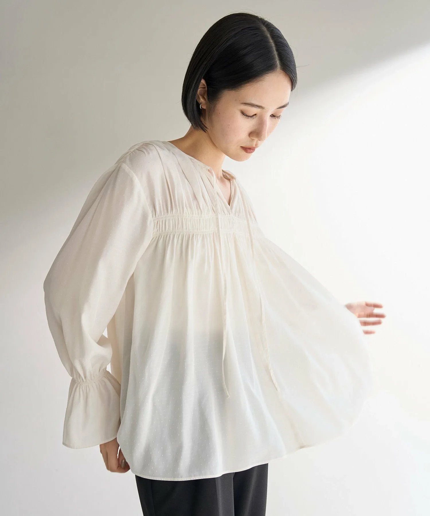 Эта блузка из крепа украшена нежным узором в горошек, что придает ей изысканный и милый вид.