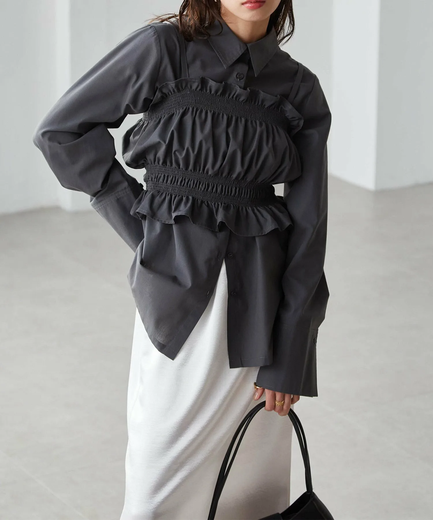 - Рубашку можно носить отдельно, или бюстье будет мило смотреться в сочетании с базовым трикотажным топом.