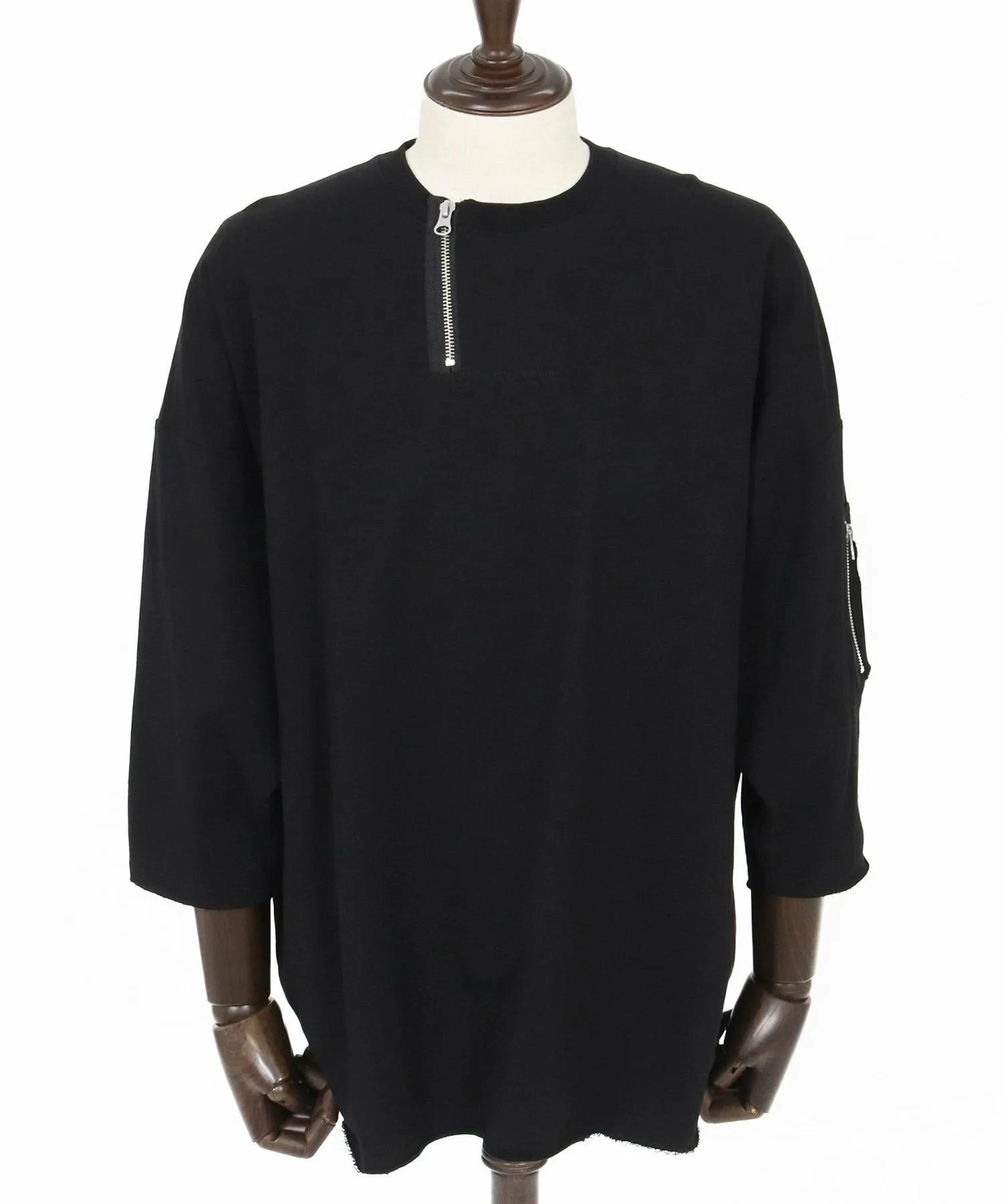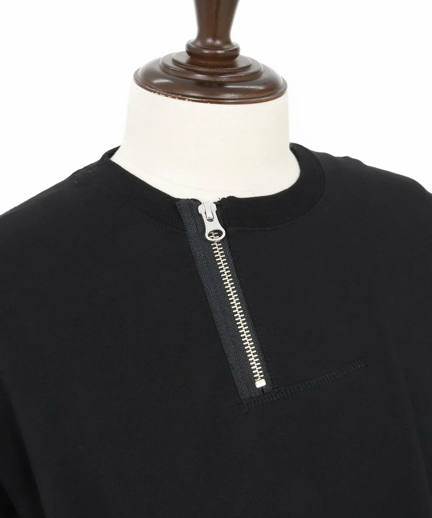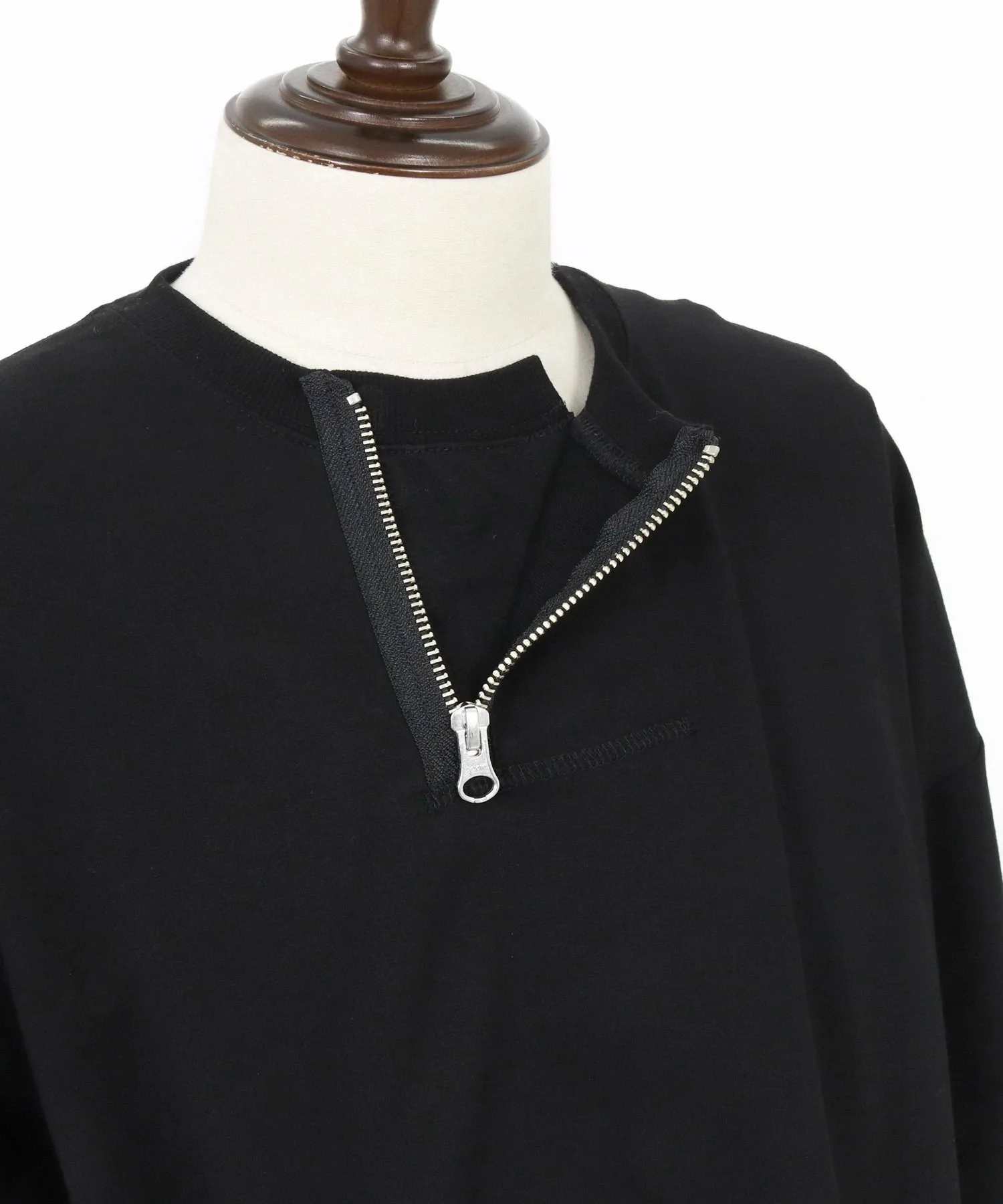 Воротник имеет форму «хенли» с молнией, слегка смещенной от центра, что создает грубый и повседневный вид.