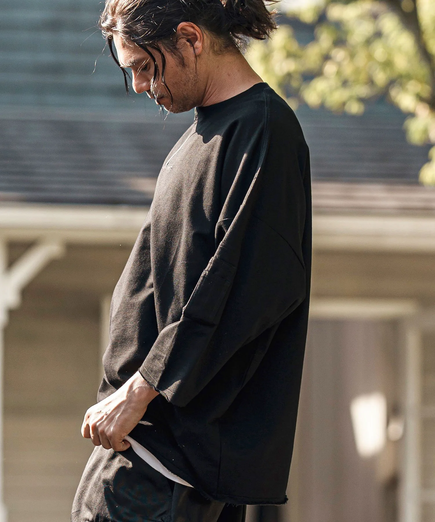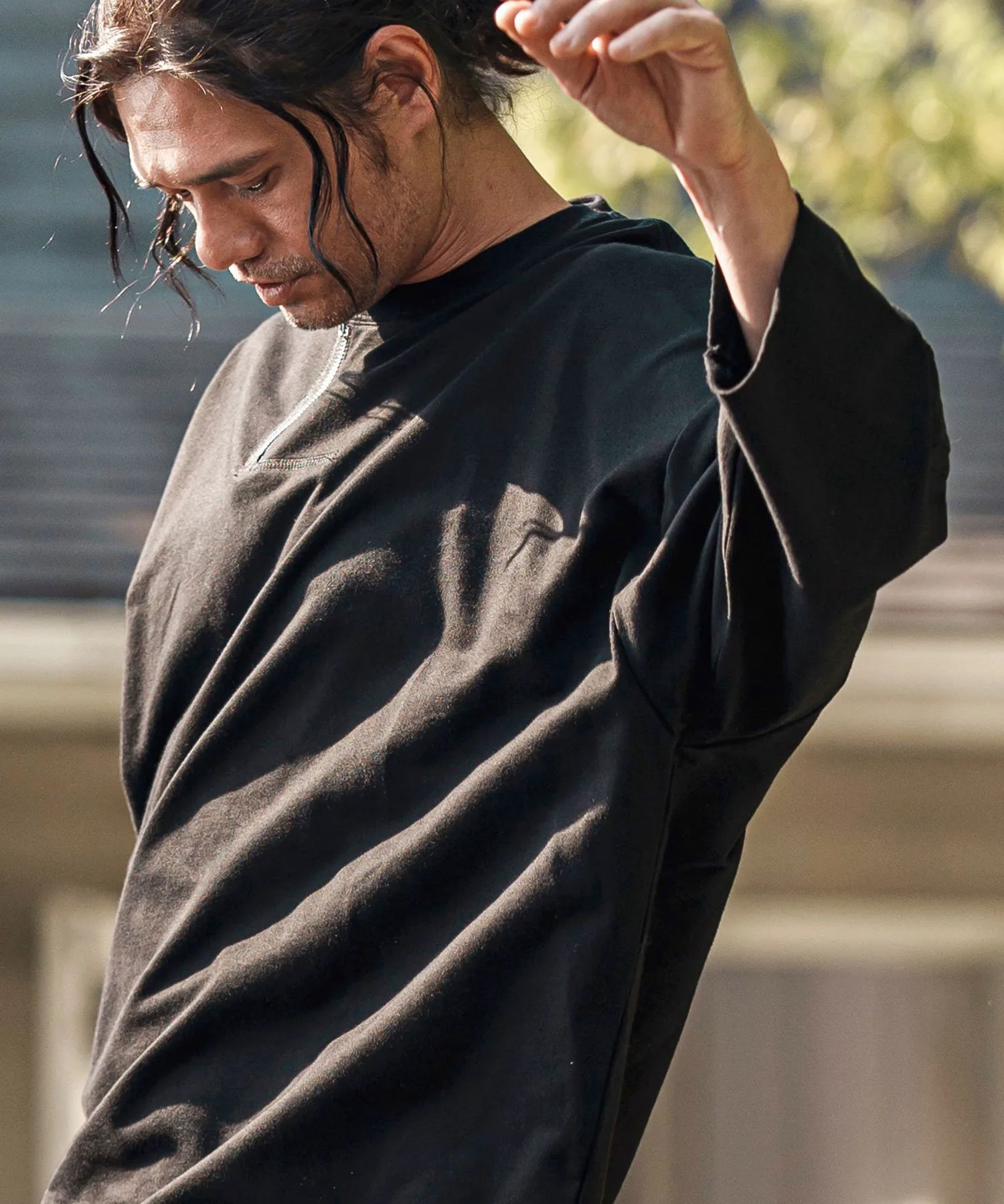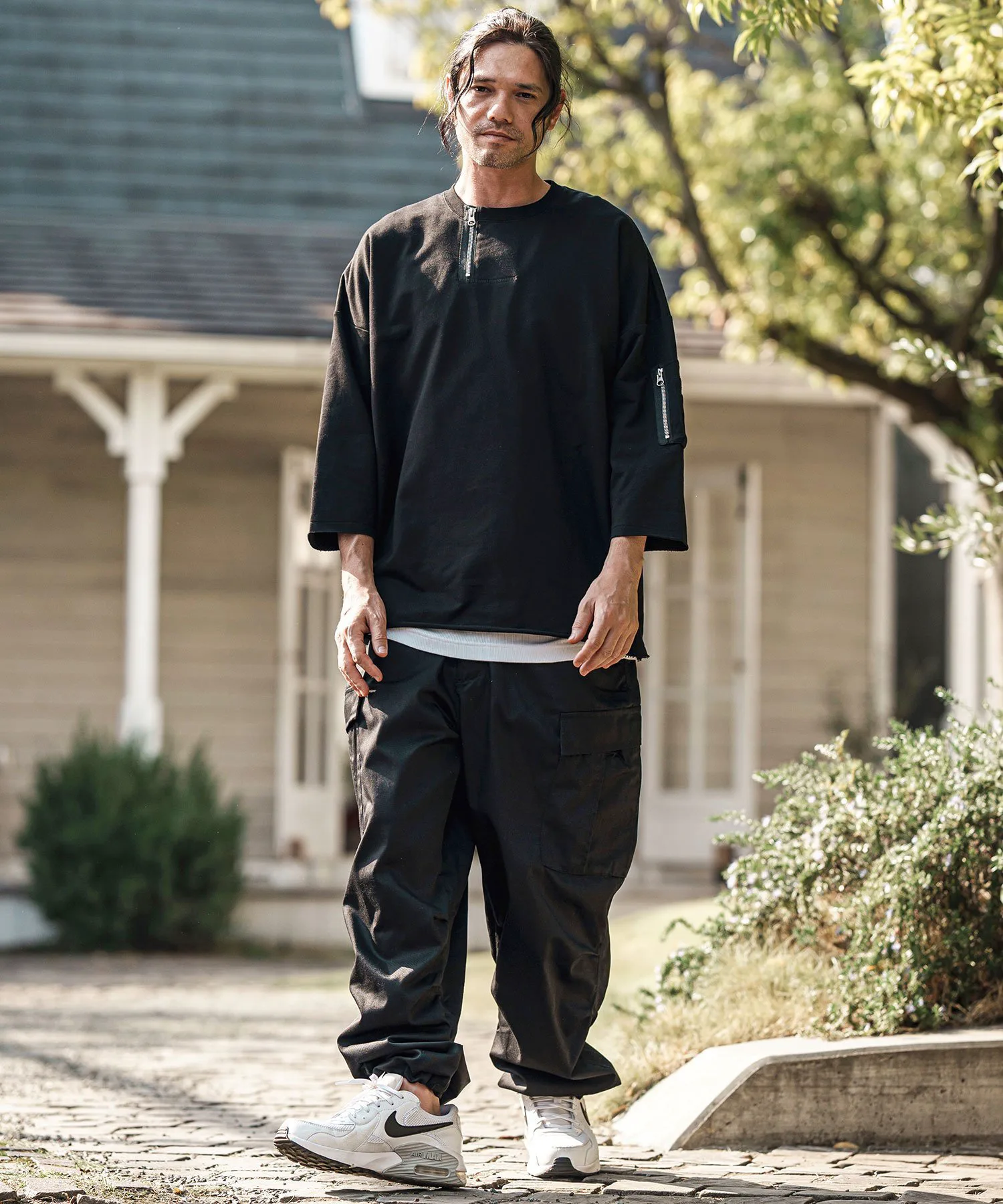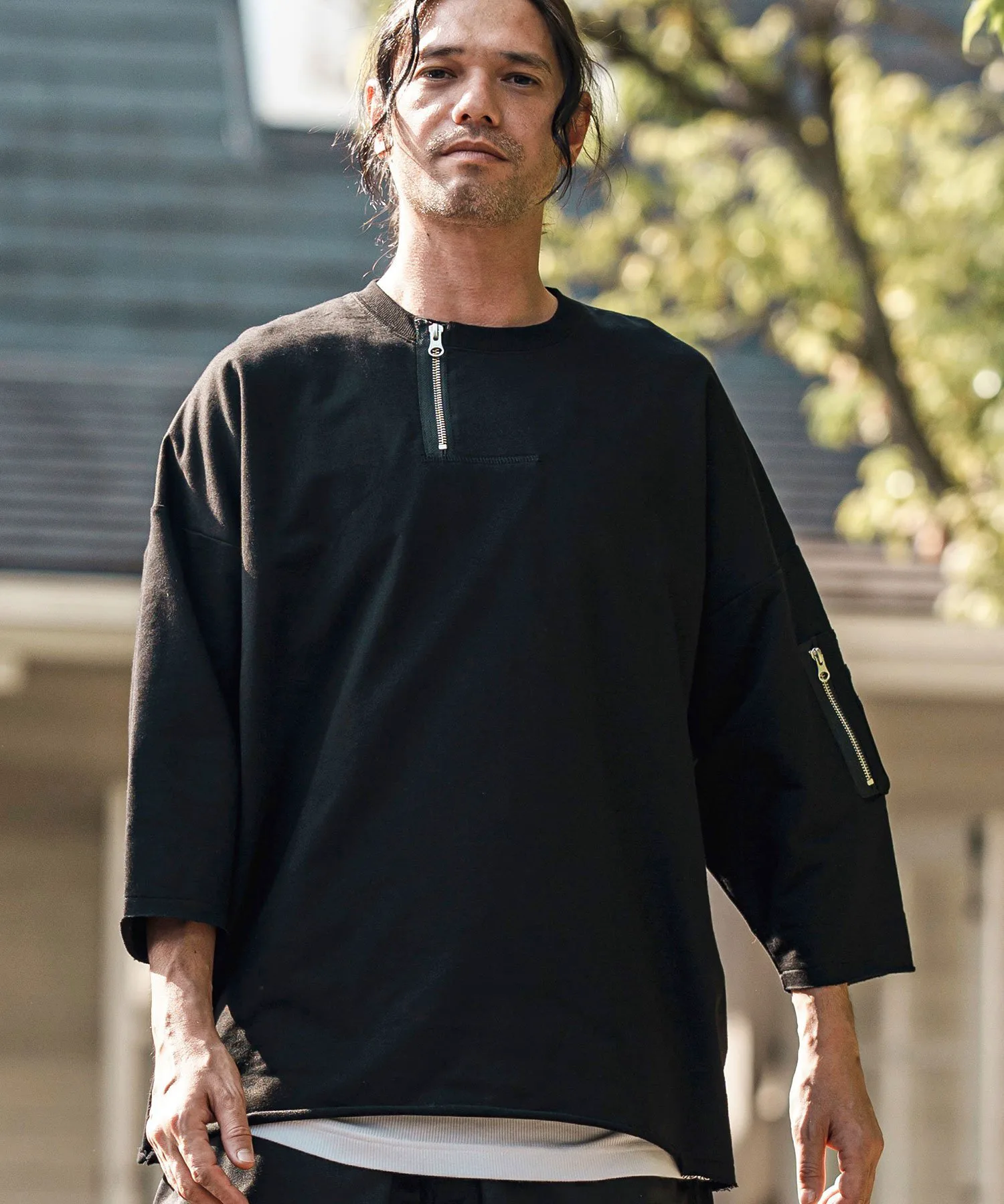 Воротник имеет форму «хенли» с молнией, слегка смещенной от центра, что создает грубый и повседневный вид.