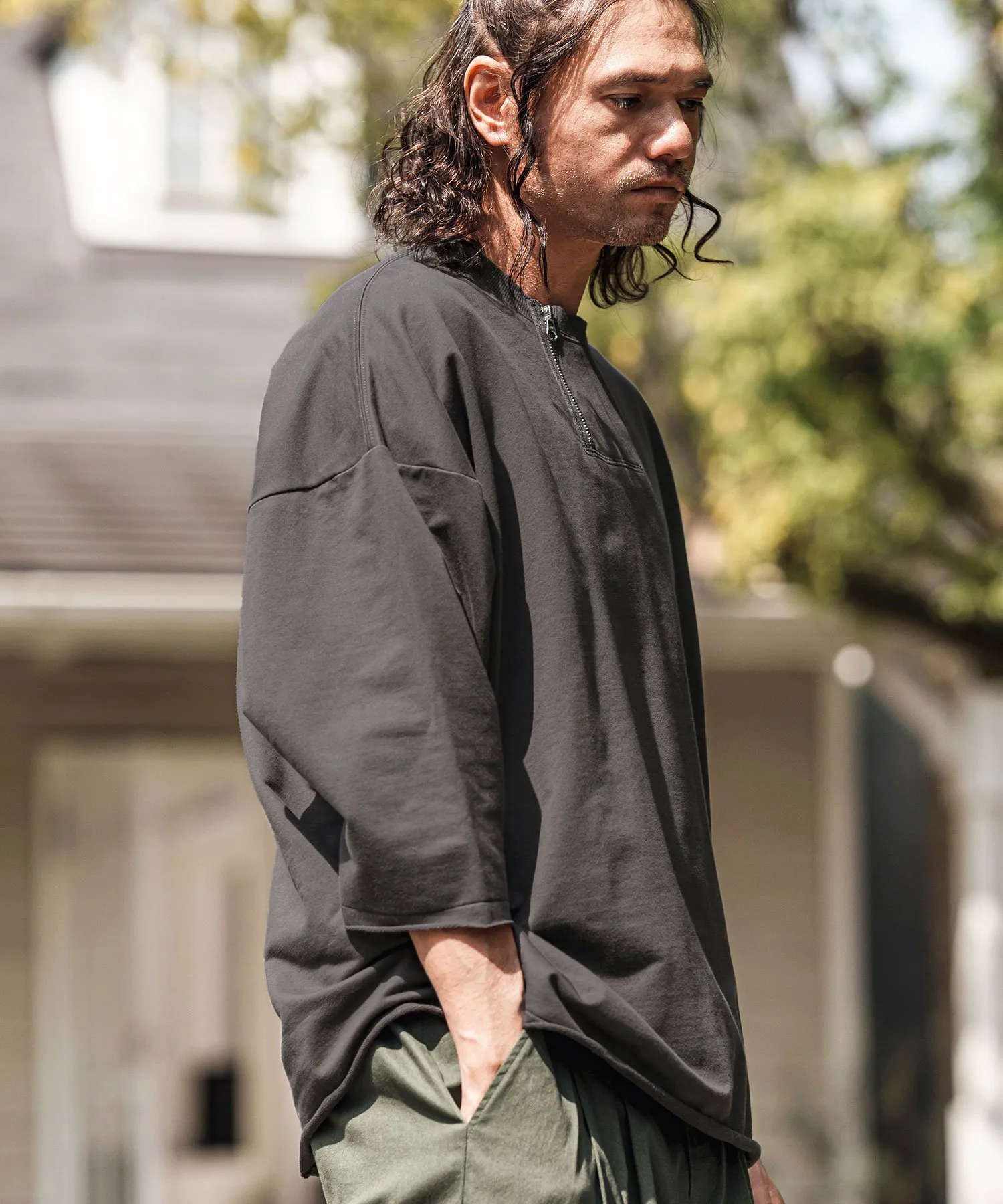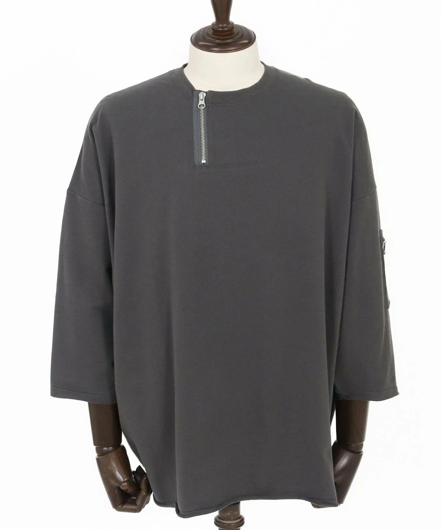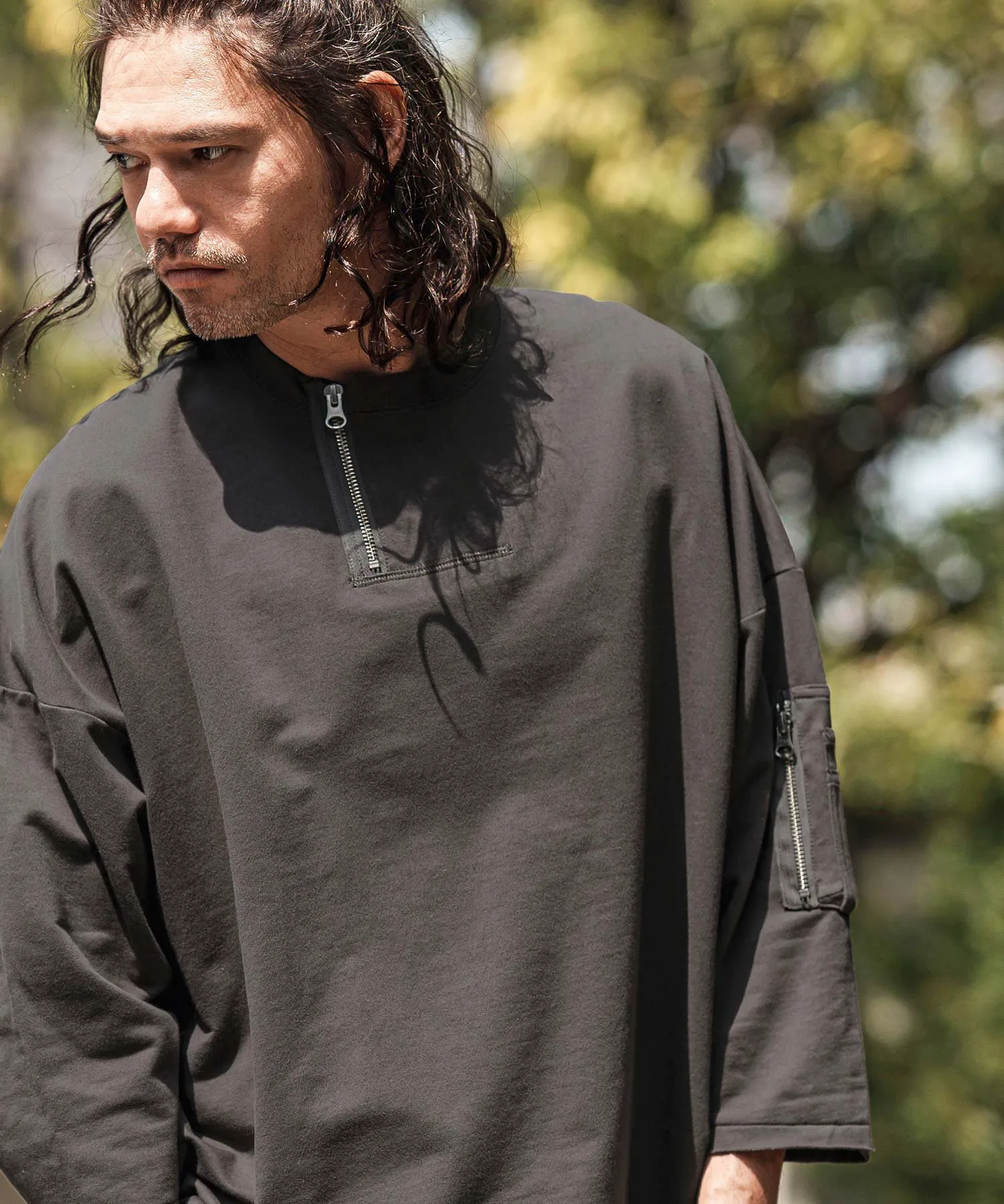 Воротник имеет форму «хенли» с молнией, слегка смещенной от центра, что создает грубый и повседневный вид.