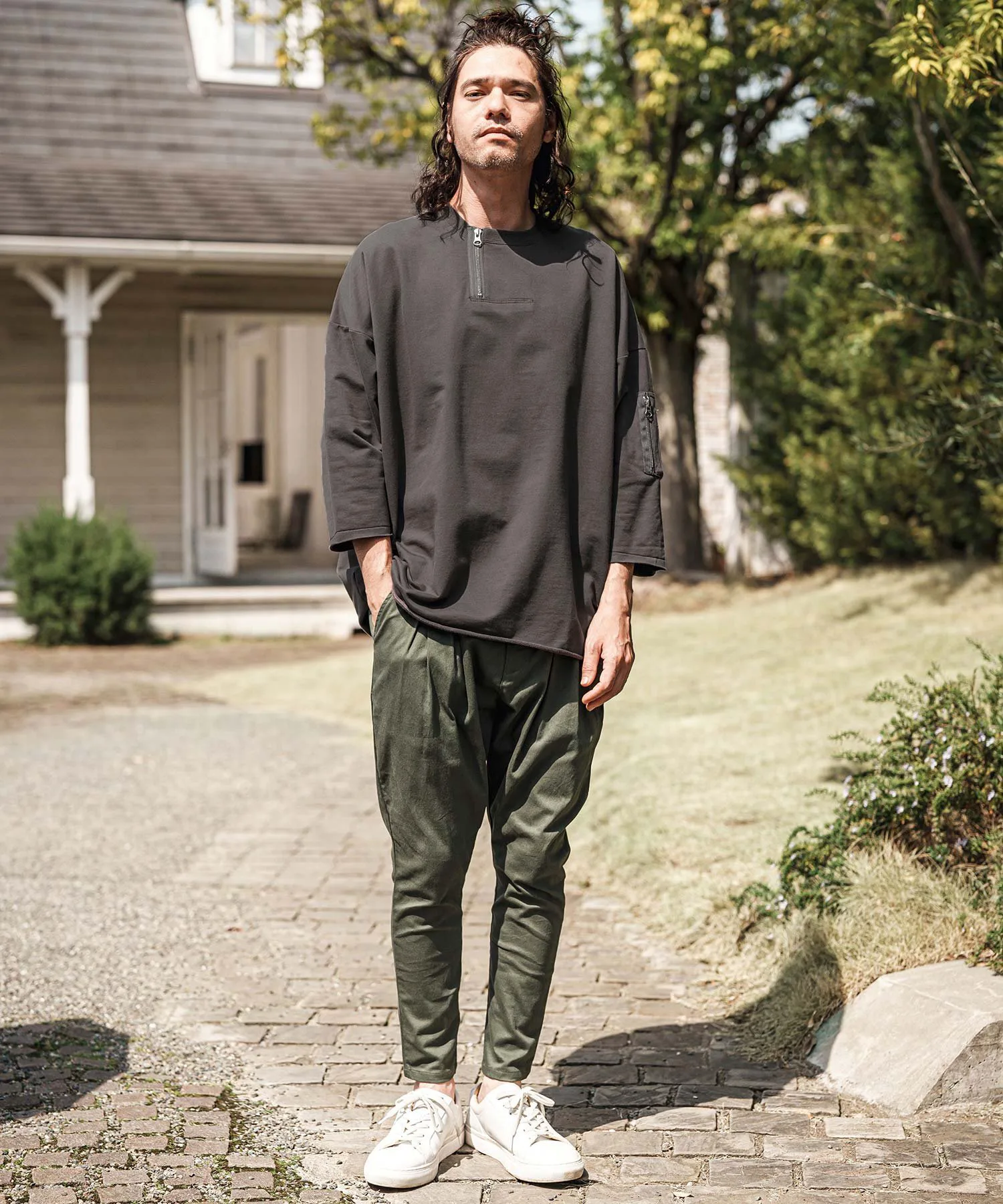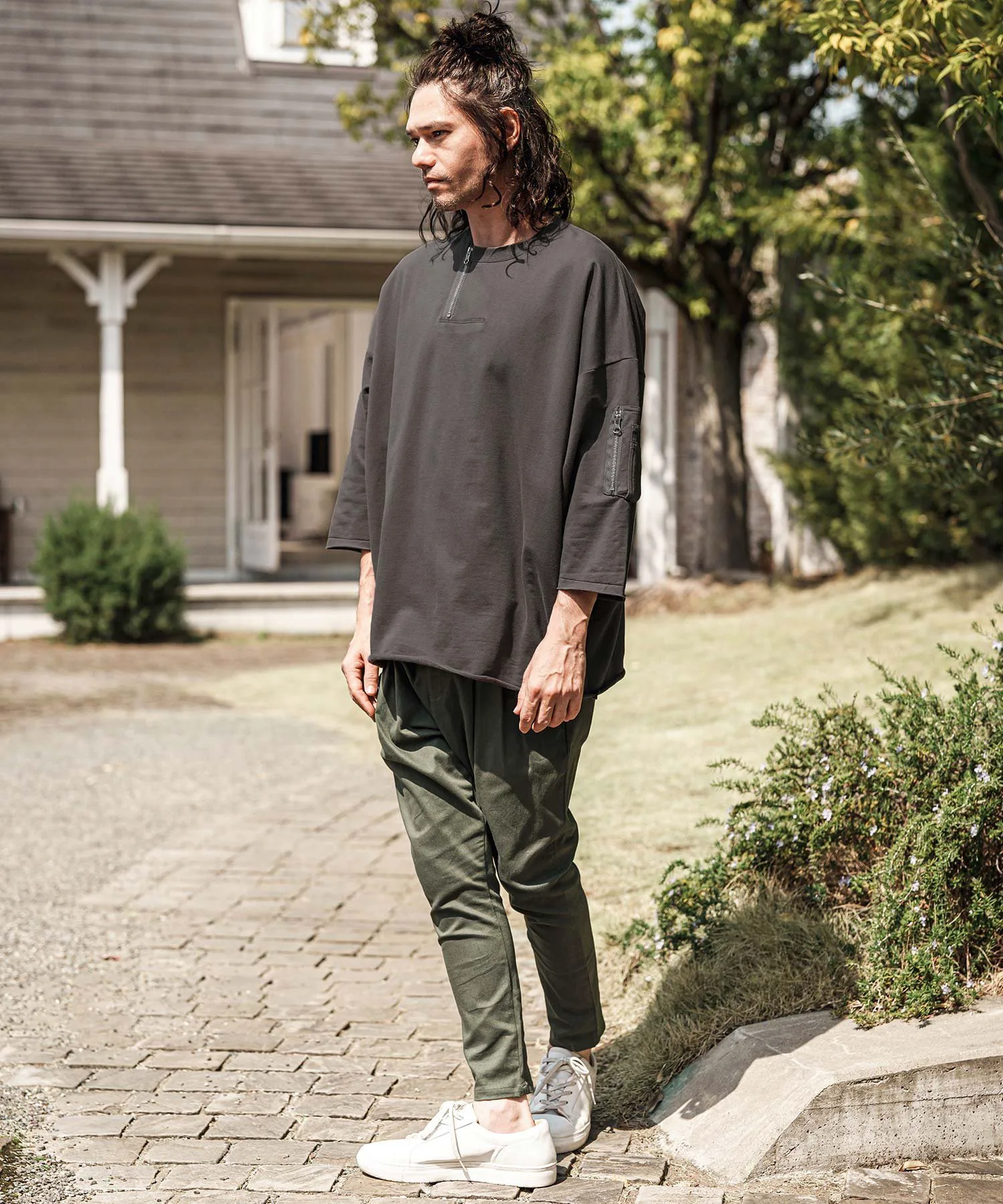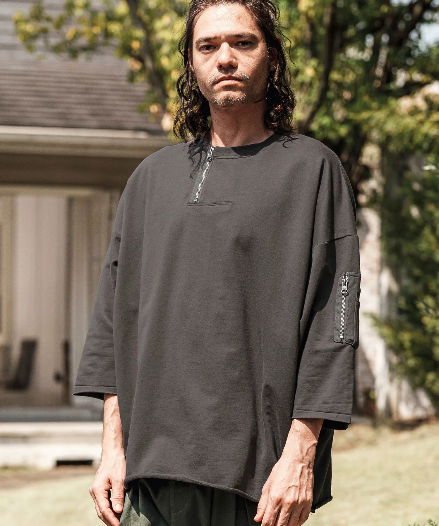 Воротник имеет форму «хенли» с молнией, слегка смещенной от центра, что создает грубый и повседневный вид.