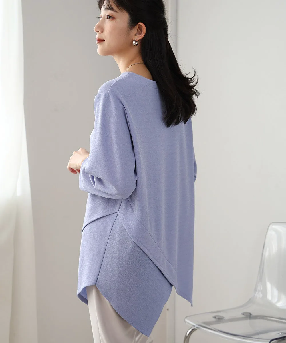 Изготовлен из трикотажа с грушевидной текстурой и небольшими неровностями. Он имеет красивую драпировку, как у блузки, и легкий блеск для изысканного вида. Будучи трикотажным, он очень эластичный и не мнется, что является плюсом.