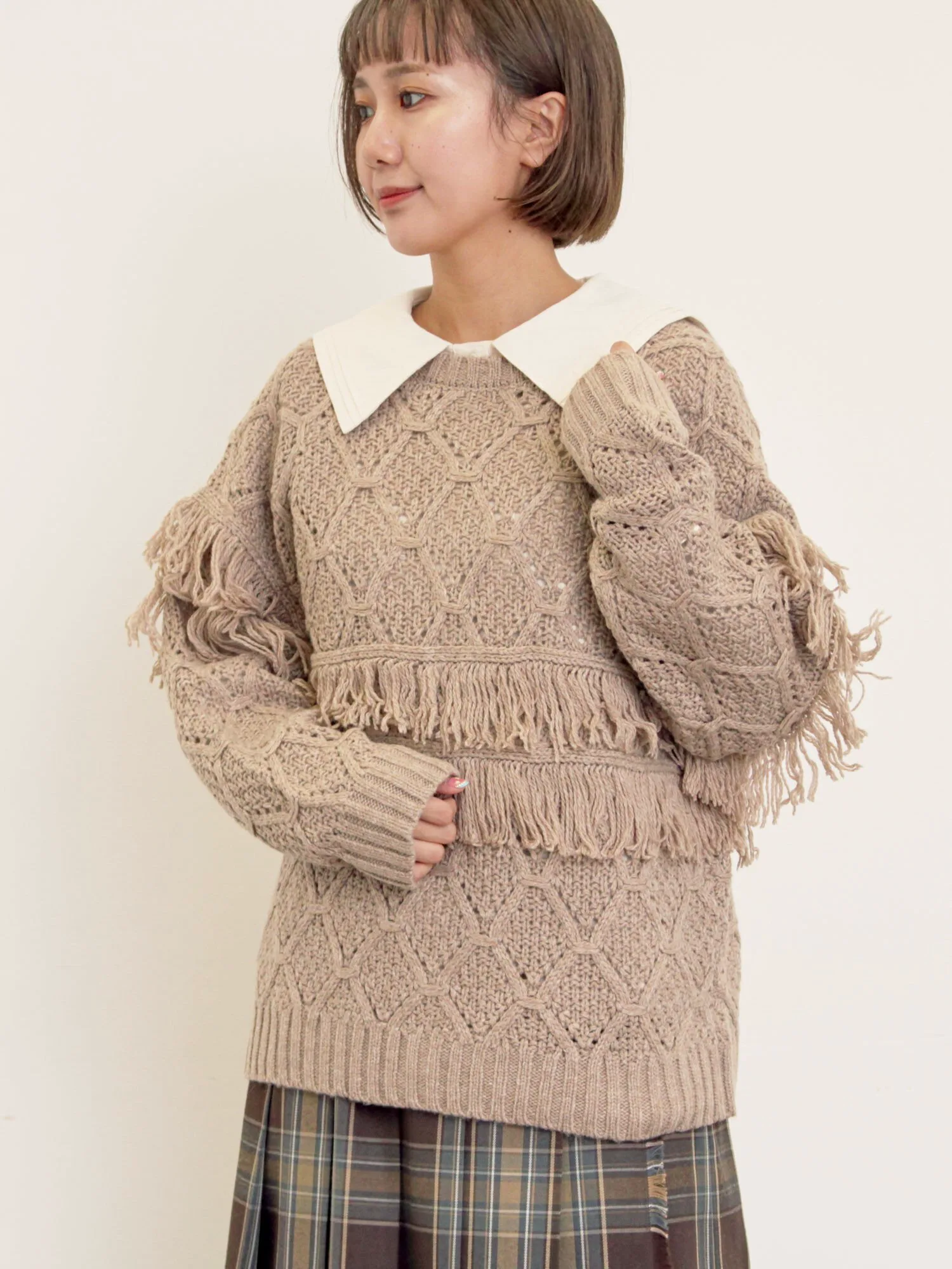 Вязаный свитер с развевающимися бахромами, создающий восхитительное впечатление.