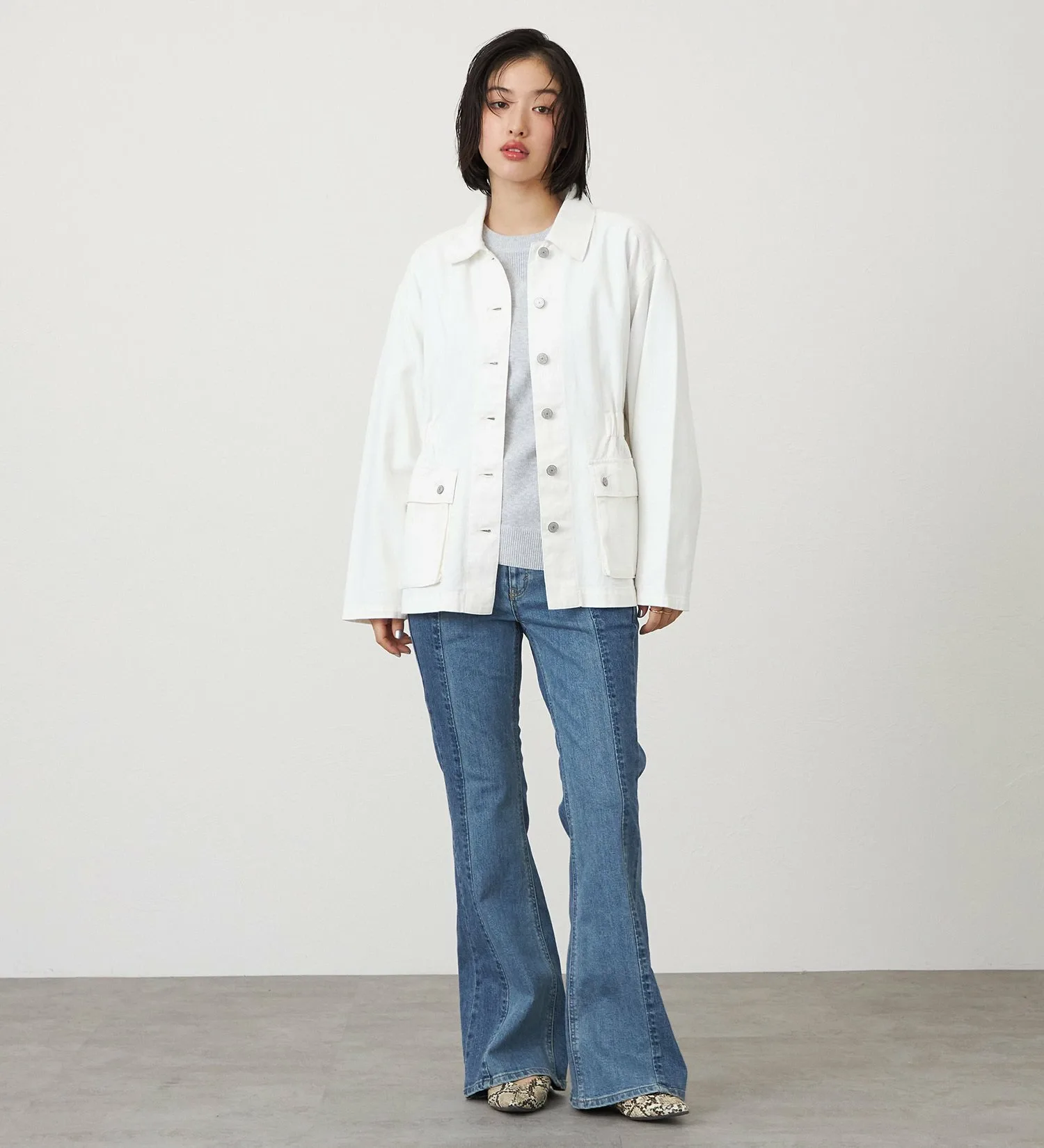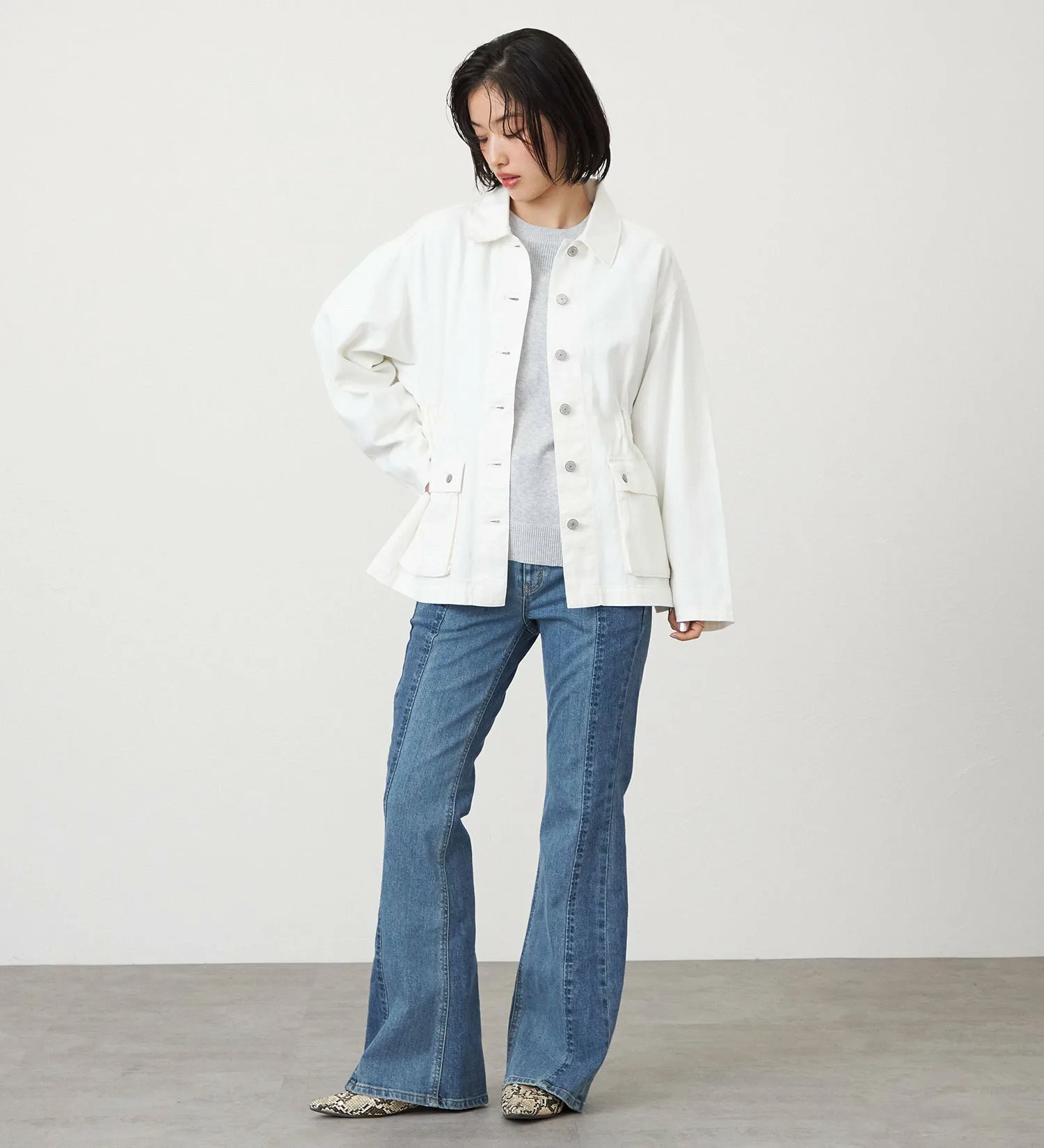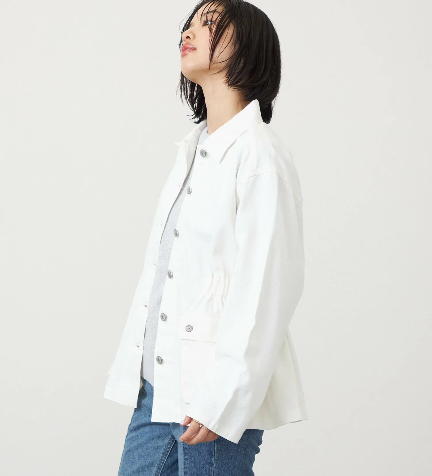 Светло-голубой : Этот 100% хлопковый деним, изготовленный из плотно скрученной пряжи, имеет сухую текстуру. Его минимальная неровность придает ему изысканный вид, не делая его слишком повседневным. Оба цвета легкие и идеально подходят в качестве легкой весенней верхней одежды.