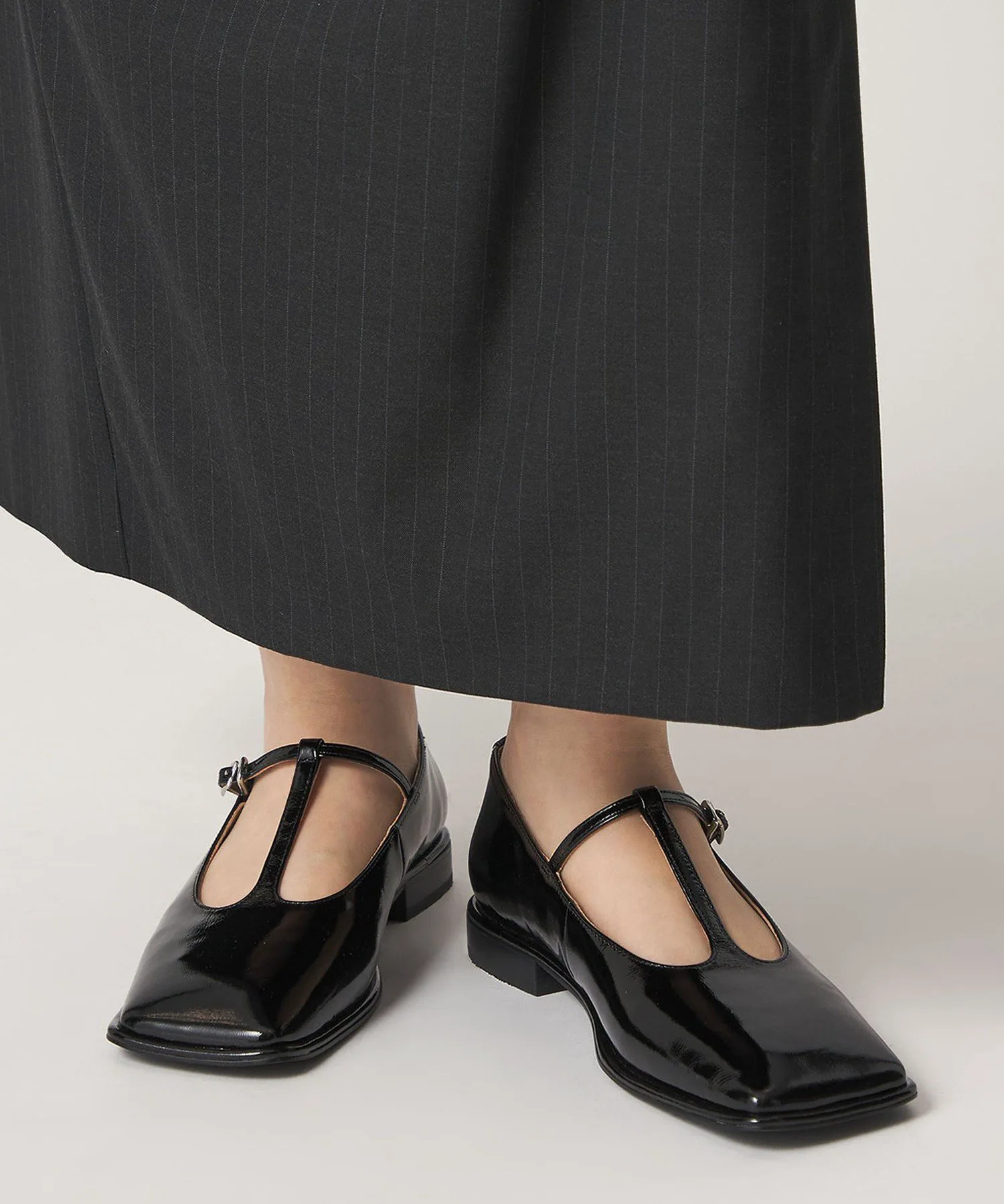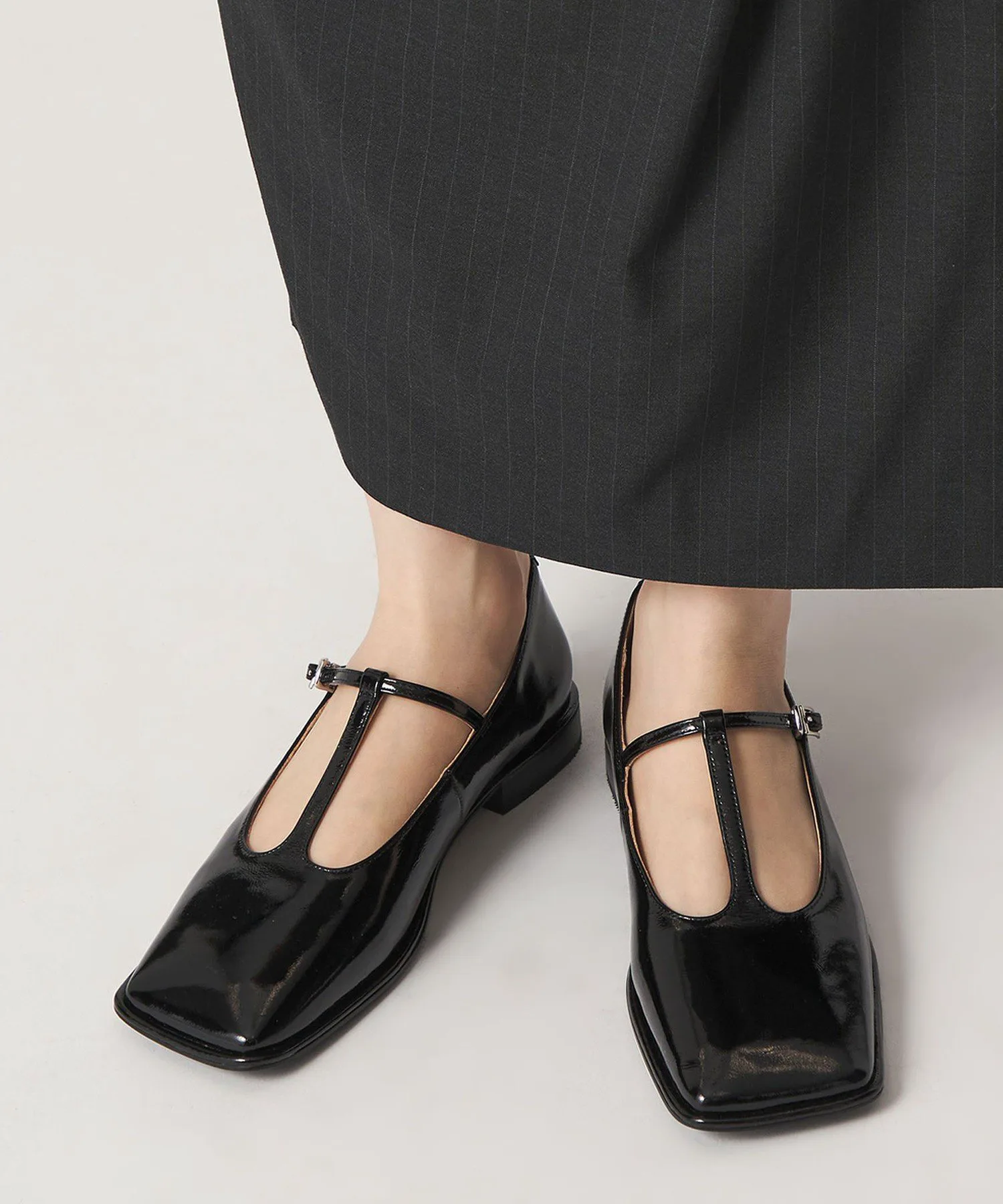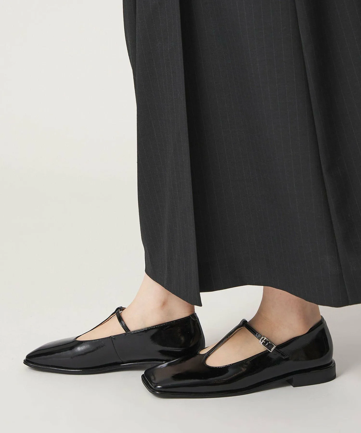 Эти балетки имеют широкий квадратный носок и изящный Т-образный ремешок, создавая сбалансированный образ, не будучи слишком тяжелыми.