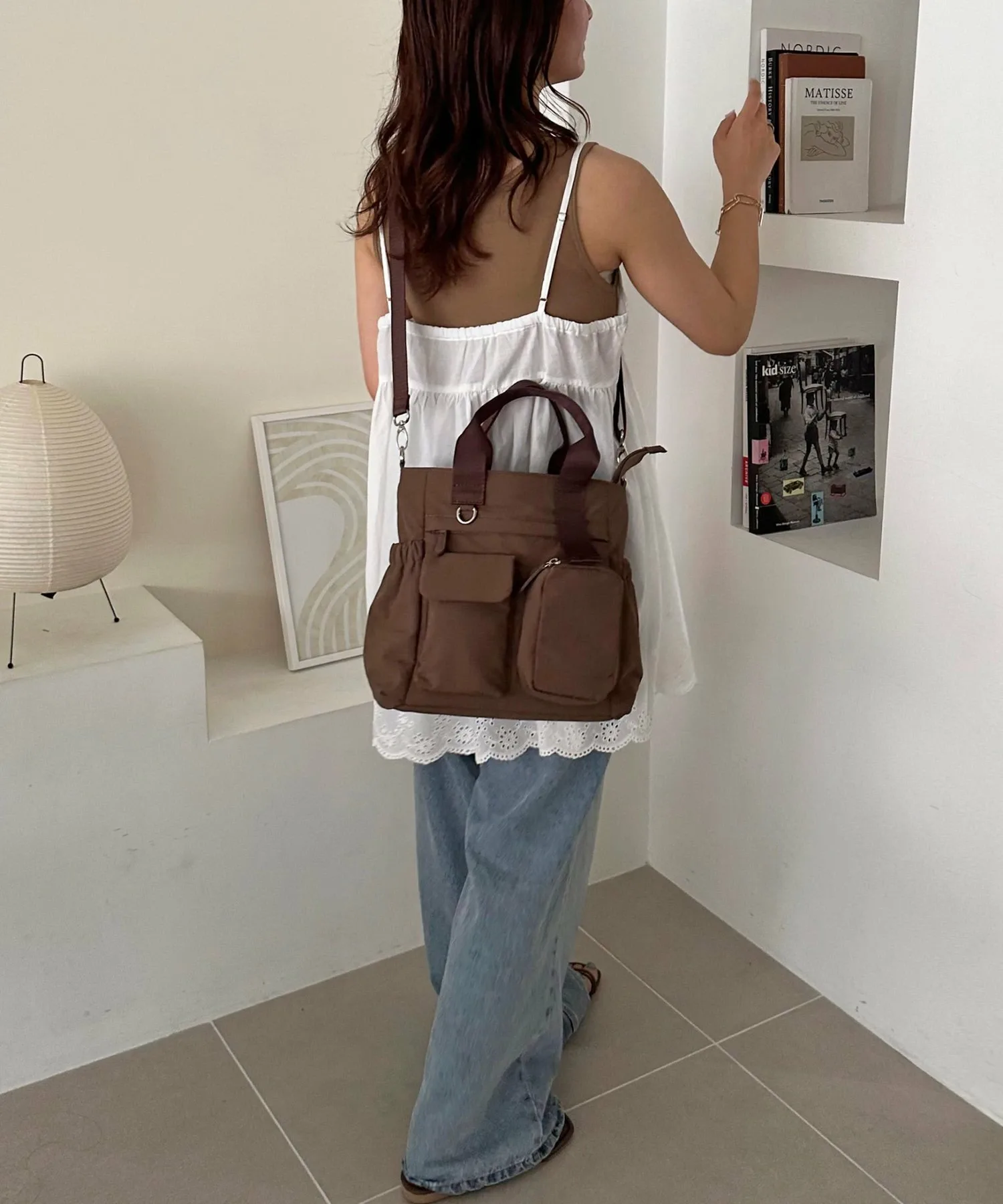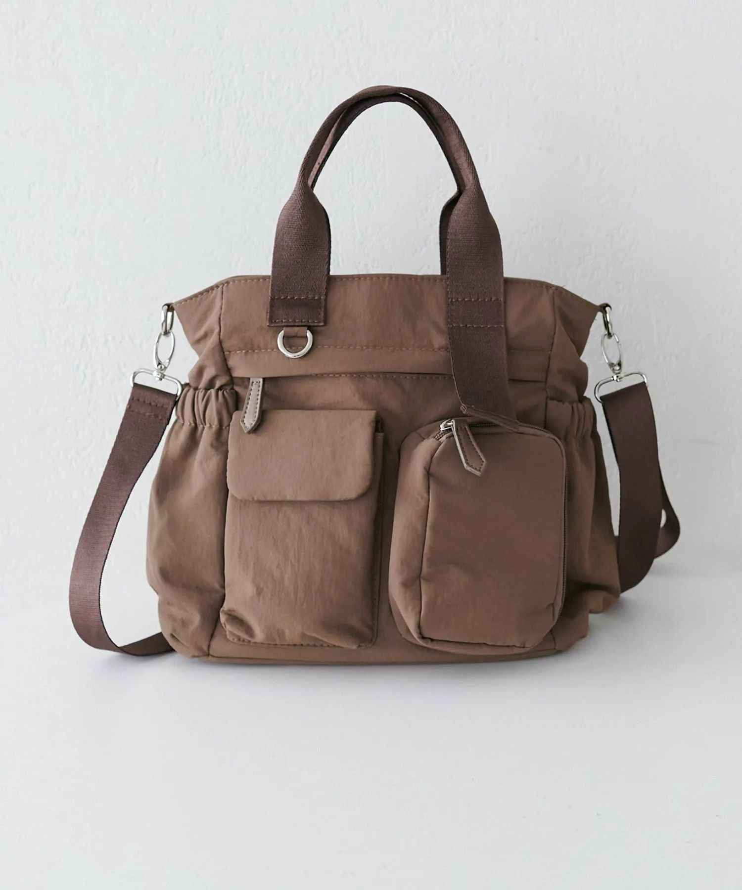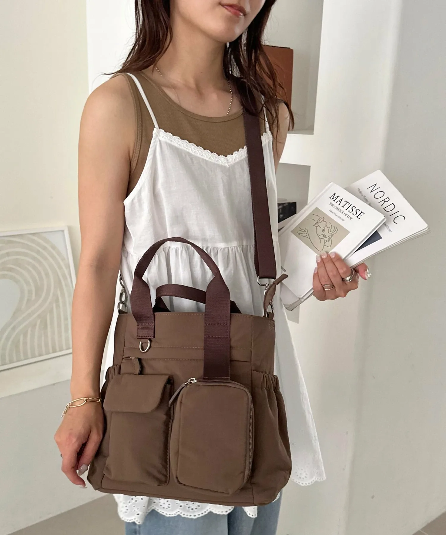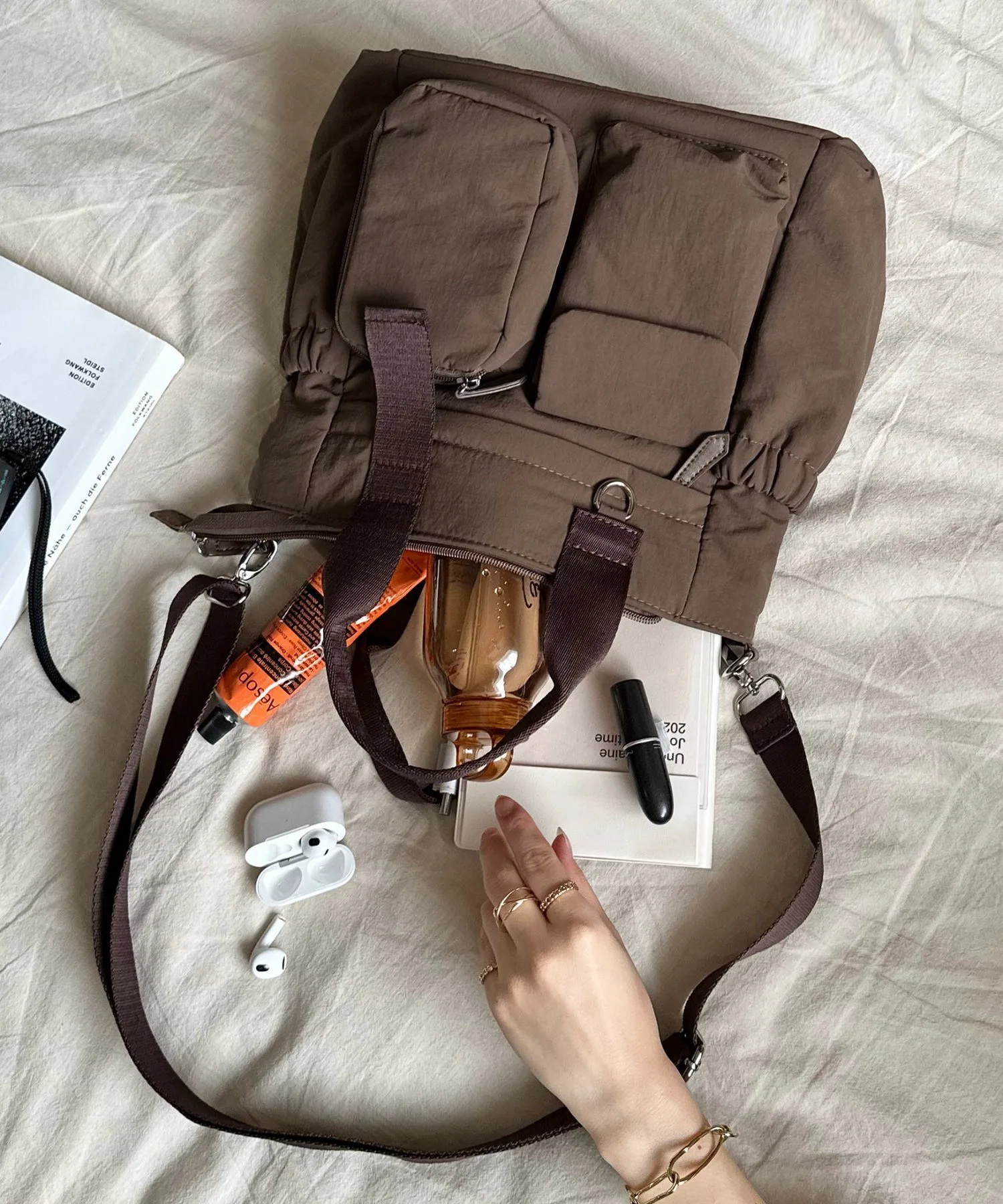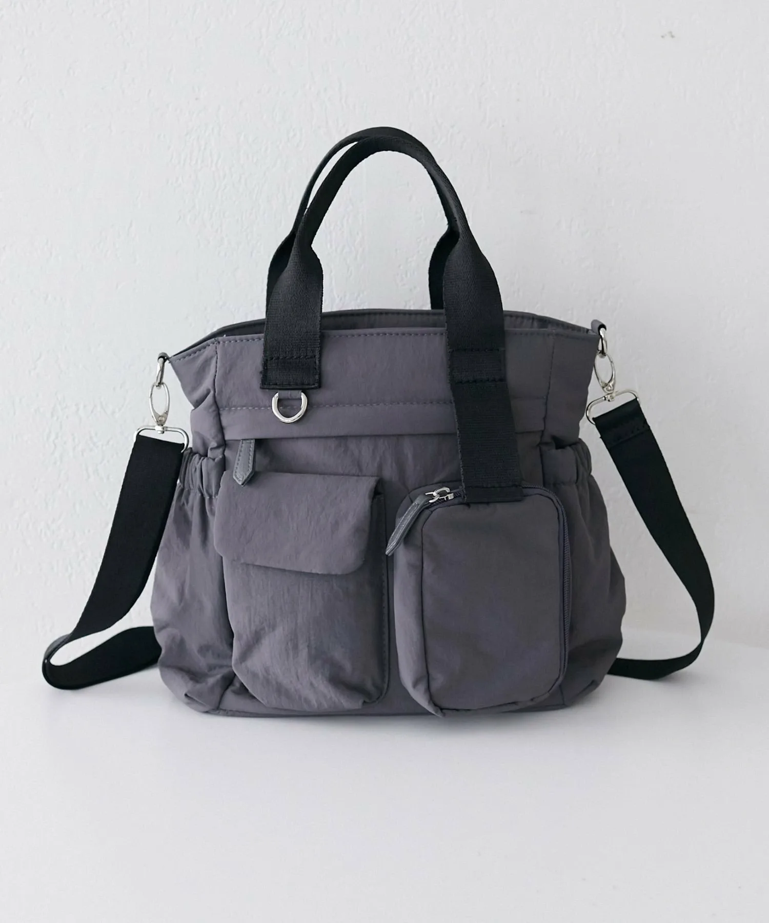 Несмотря на компактный внешний вид, эта сумка имеет в общей сложности 11 карманов, как внутри, так и снаружи, что обеспечивает ей огромную вместительность. Еще одна отличительная особенность — ее объемный дизайн, который придает ей мягкий, пухлый вид. Она также поставляется со съемным регулируемым плечевым ремнем, поэтому вы можете менять способ ношения в зависимости от ситуации.◎ Более того, задняя часть сумки разработана как ручная кладь, поэтому ее можно надеть на ручку чемодана, что делает ее идеальной для путешествий.♪ Она выпускается в трех основных цветах: черном, бежевом и темно-синем.
