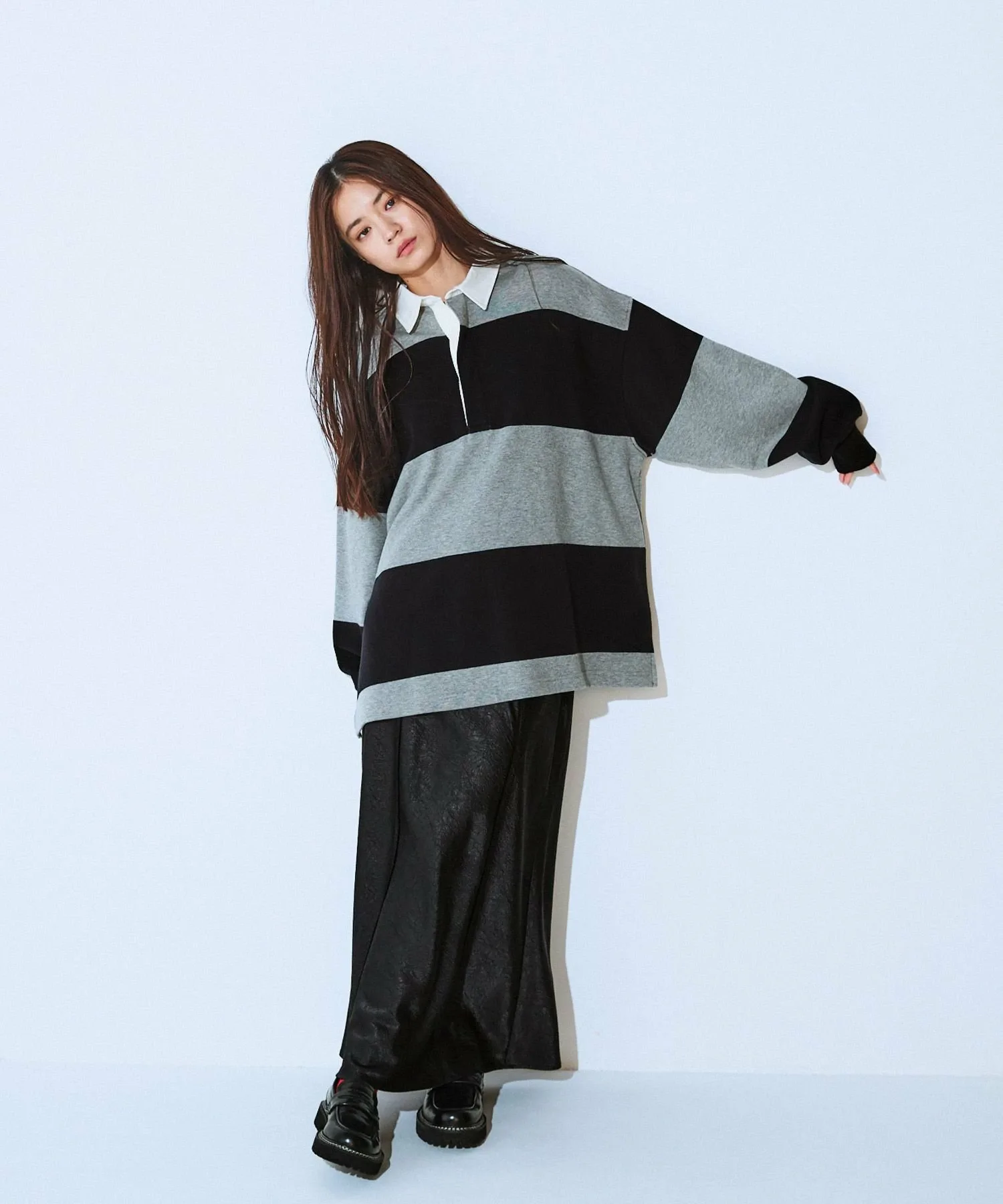 Контрастный дизайн создает трехмерный, но при этом обтекаемый полурасклешенный силуэт.