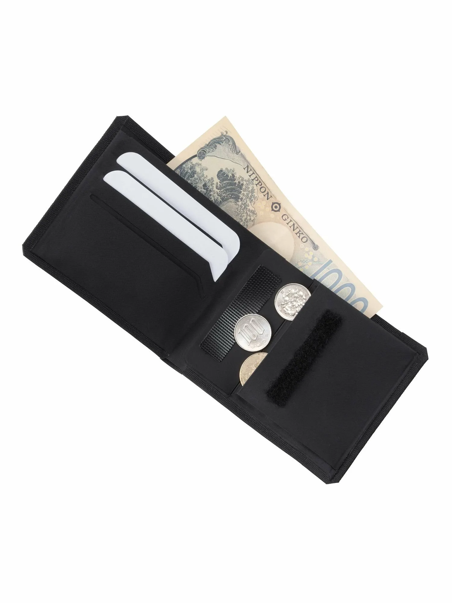 Материал изготовлен из переработанного полиэстера. Внутри имеется отделение для банкнот, отделение для монет и три прорезных кармана для карт. Спереди расположен карман на молнии, удобный для хранения смарт-меток и тому подобного, а также кольцо для ключей, которое можно прикрепить к сумке или ремешку для дополнительного стиля.