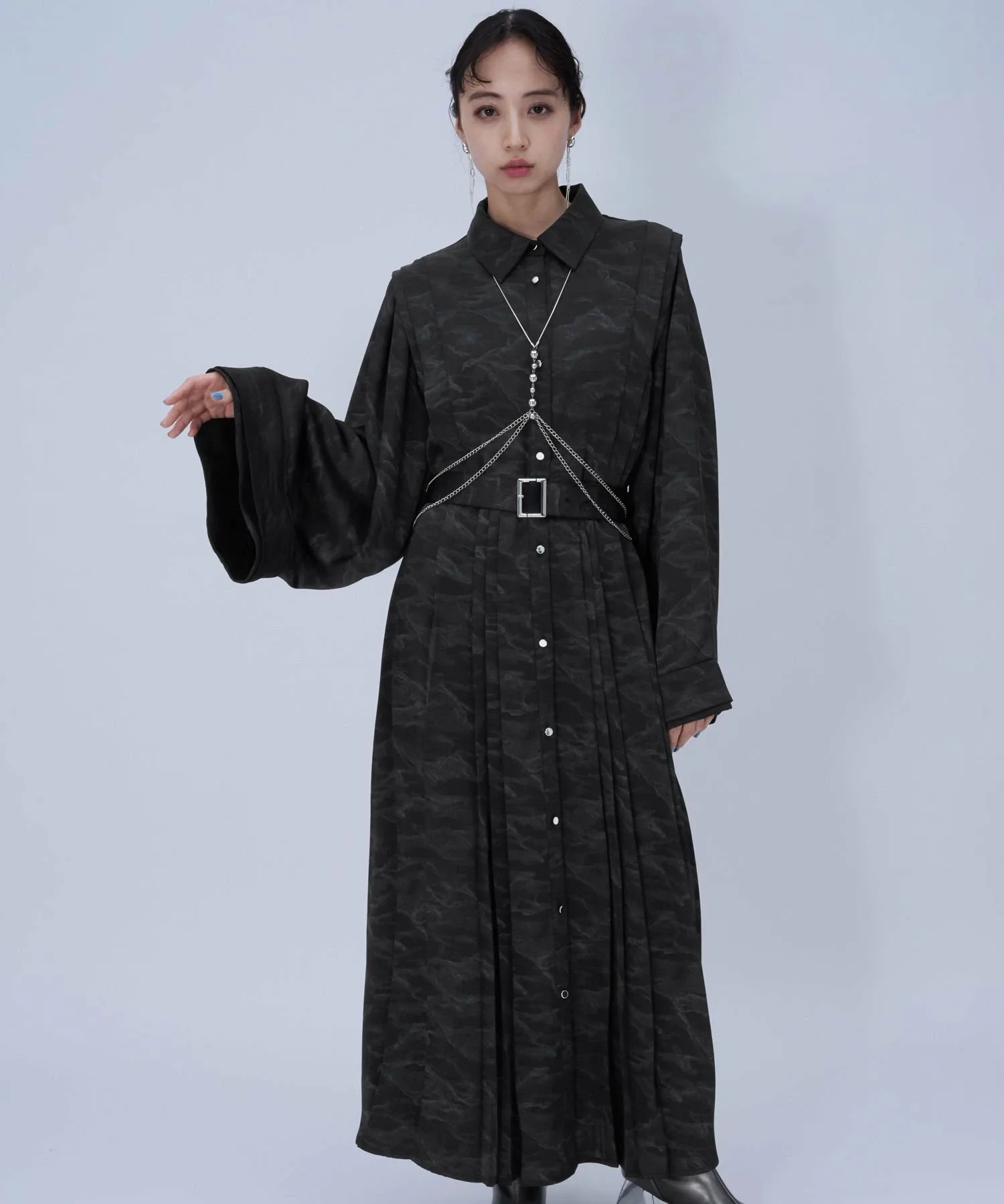 Платье-рубашка, в котором тема «многослойности» выражается через складки.