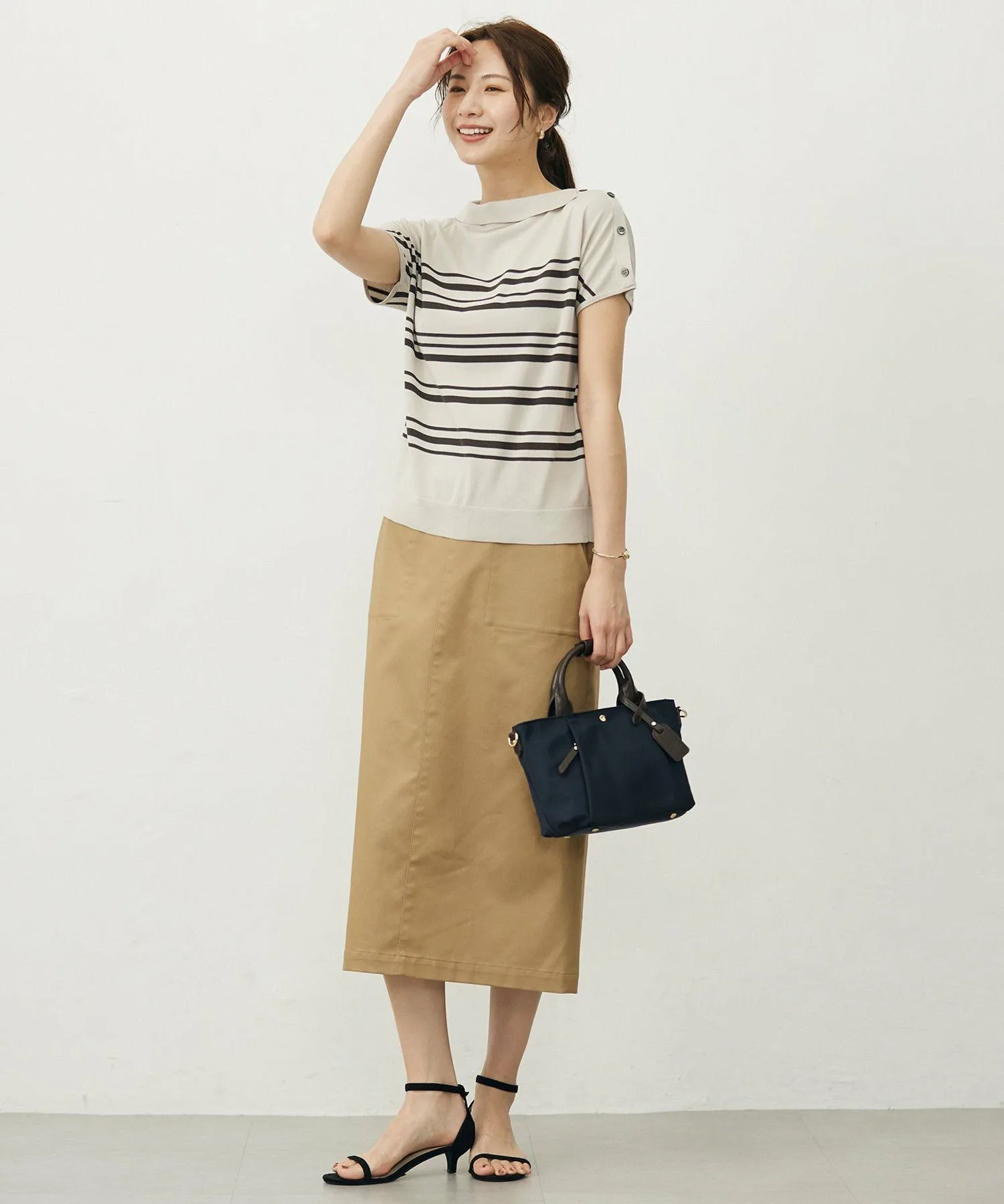 Дизайн: Полосатый трикотаж с воротником в классическом стиле. Пуговицы из ракушек на левом плече добавляют элегантности аккуратному воротнику. Французские рукава немного длиннее, чтобы естественным образом прикрыть проблемные предплечья. Легко сочетается с брюками или юбками и достаточно универсален для широкого круга случаев, от повседневных до нарядных. Несмотря на простоту, тонкие детали выделяют его, делая его идеальным элементом для изысканных ансамблей. Доступен в трех цветах: мягкий серо-коричневый (#103), натуральный и насыщенный коричнево-серо-бежевый (#130) и сдержанный и элегантный темно-синий и серо-бежевый (#175). Материал: Этот материал изготовлен из тонкозернистого индийского хлопка, спряденного с использованием технологии компактного прядения, которая включает в себя ворс, и обернут полиэстером с низкой степенью эластичности для комфортной посадки и оптимальной степени растяжения. Обладает гладкой, прохладной текстурой, прост в уходе и идеально подходит для длительной летней жары. Изделия из того же материала: Трикотаж с воротником (KRGJGA0810) Большие размеры (KRGTGA0810) Маленькие размеры (KRG0GA0810) Трикотаж поло (KRGJGA0812) Большие размеры (KRGTGA0812) Маленькие размеры (KRG0GA0812) Трикотаж с рукавом «летучая мышь» (KRGJGA0813) Большие размеры (KRGTGA0813) Маленькие размеры (KRG0GA0813) *Размер L доступен только в стандартных размерах. *Изображения товаров являются образцами, поэтому обратите внимание, что цвет, размеры и другие характеристики могут быть изменены. Модель: H172 B83 W59 H87