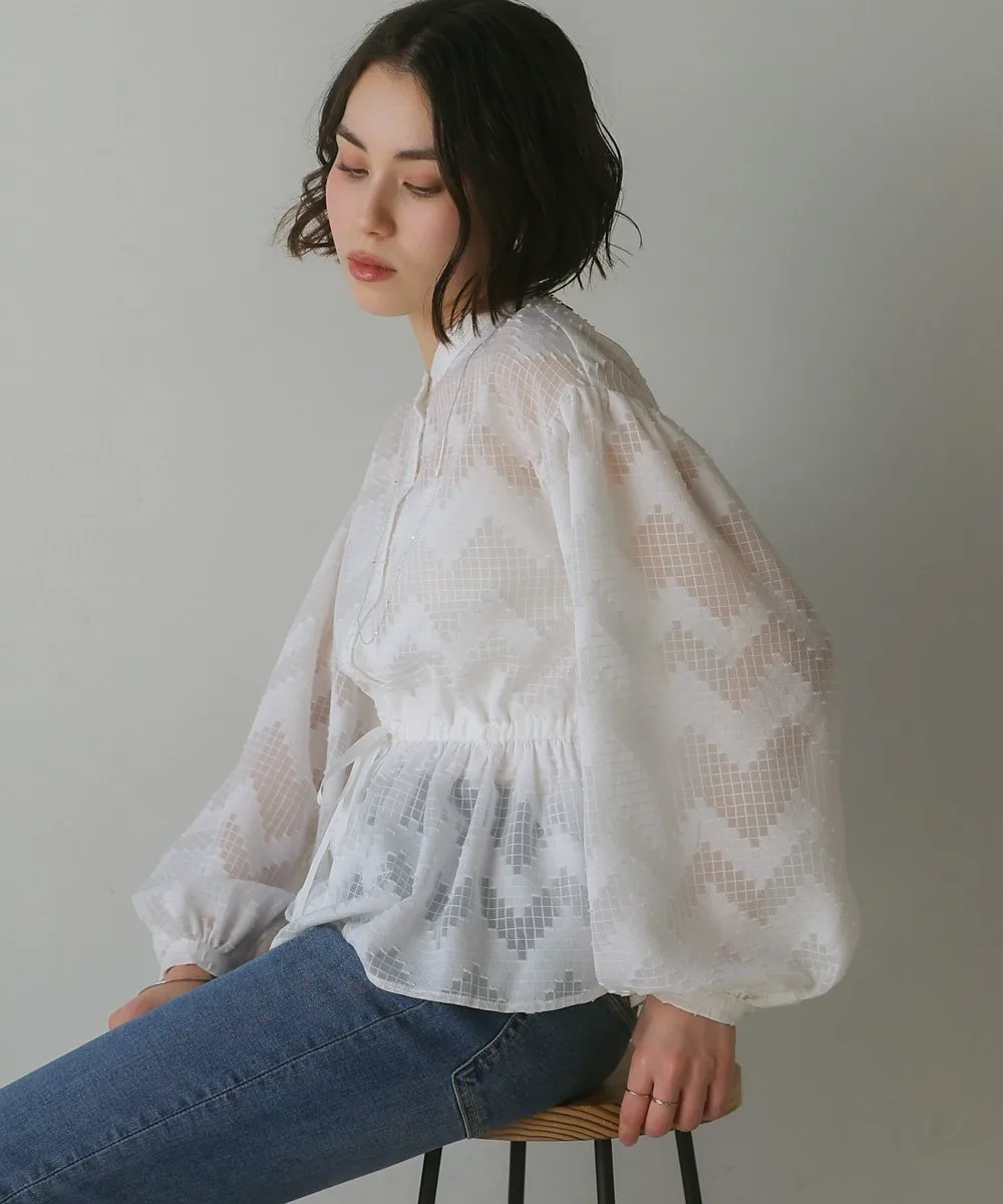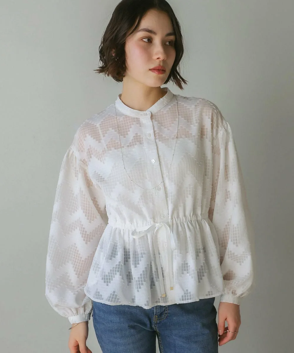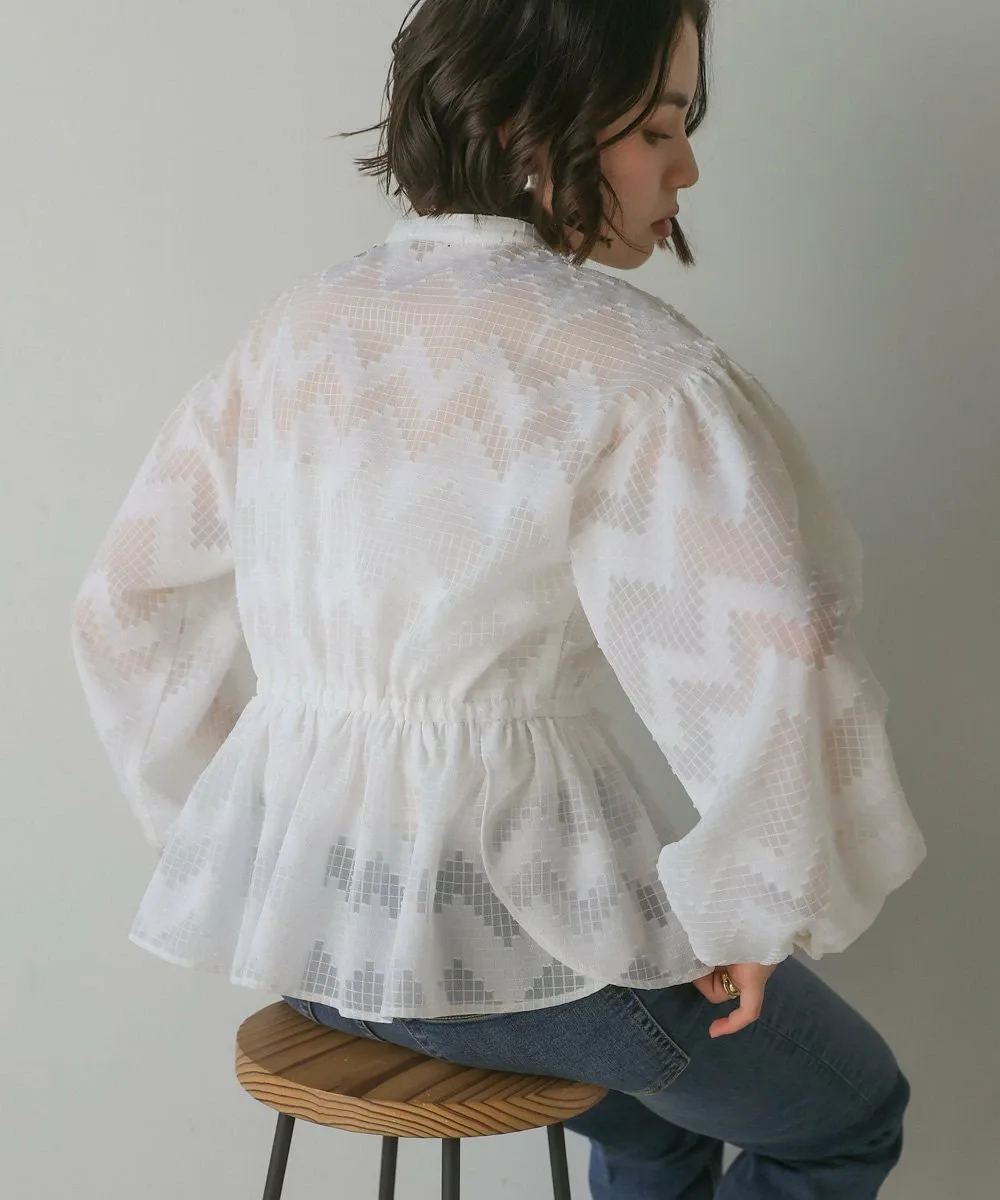 Эта модная блузка с баской выполнена преимущественно из прозрачной жаккардовой ткани с геометрическим узором. Динамичный дизайн с баской, вырезом ниже талии и множеством складок создает стильный образ. В ней использованы весенние цвета, идеально подходящие для этого года. Объем талии можно регулировать с помощью завязки. Застегивается на пуговицы спереди, поэтому ее можно носить и как жакет.