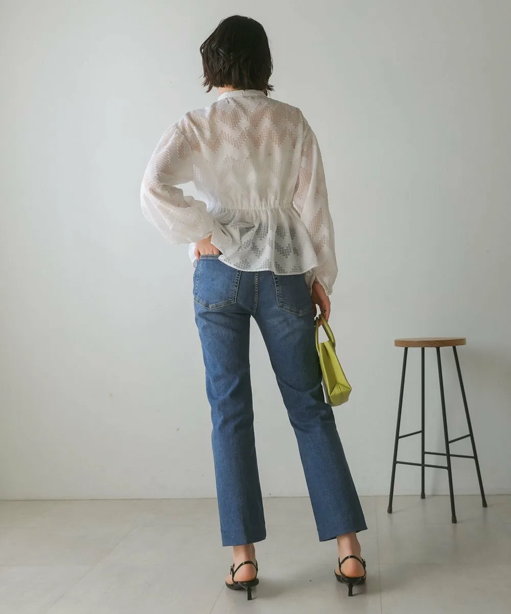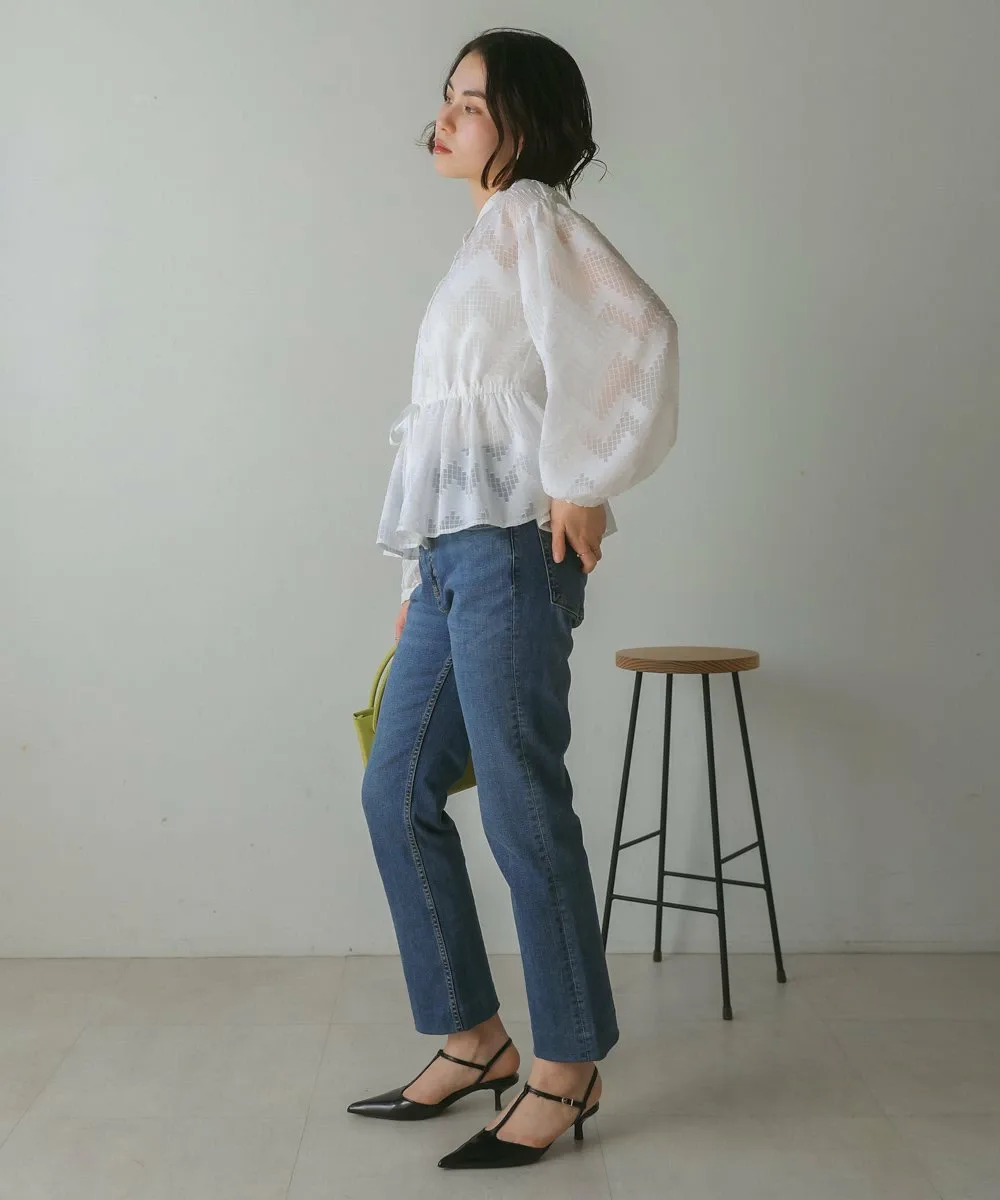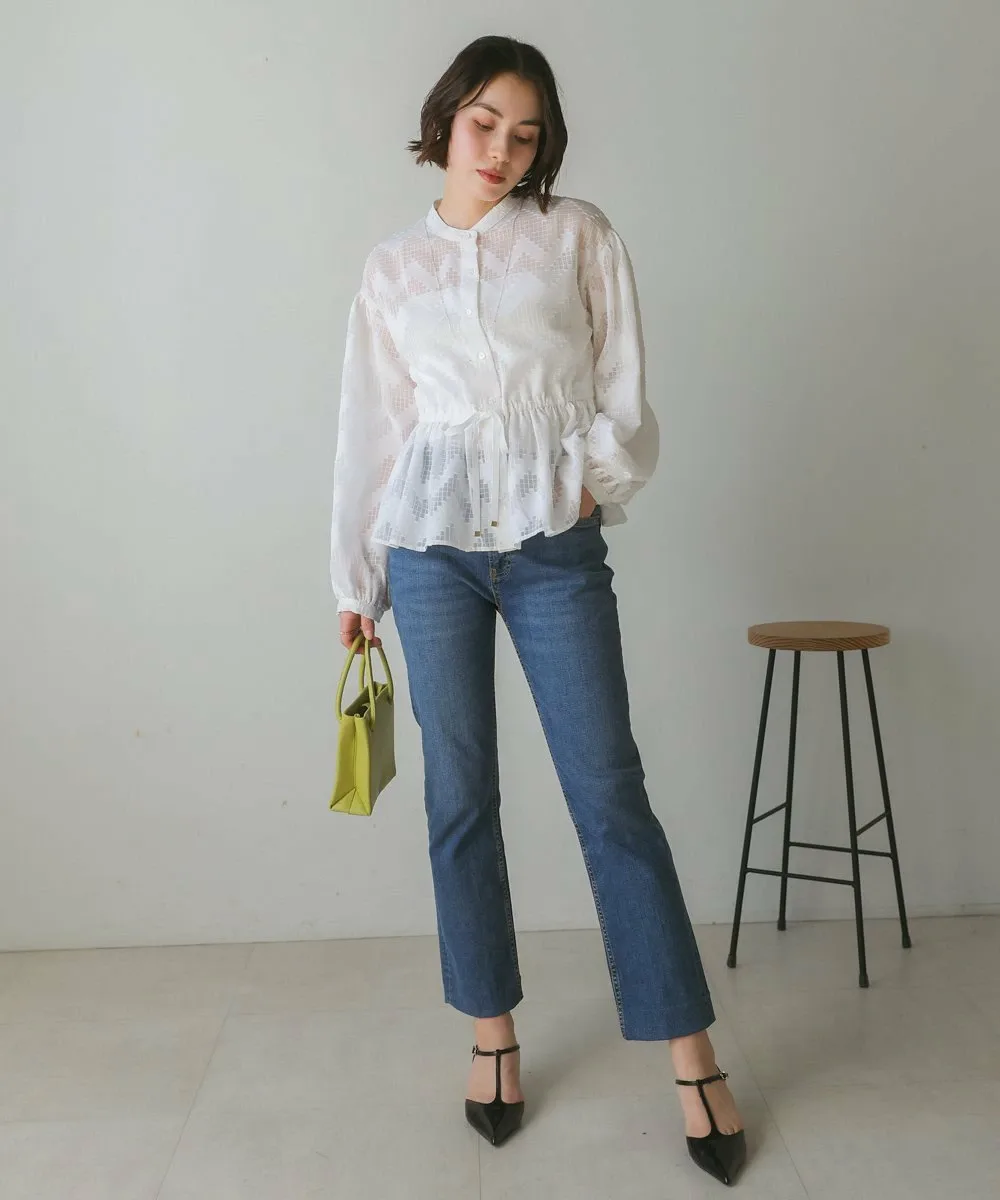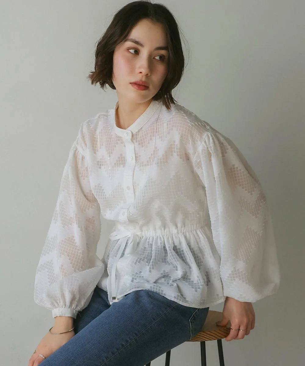 Эта модная блузка с баской выполнена преимущественно из прозрачной жаккардовой ткани с геометрическим узором. Динамичный дизайн с баской, вырезом ниже талии и множеством складок создает стильный образ. В ней использованы весенние цвета, идеально подходящие для этого года. Объем талии можно регулировать с помощью завязки. Застегивается на пуговицы спереди, поэтому ее можно носить и как жакет.