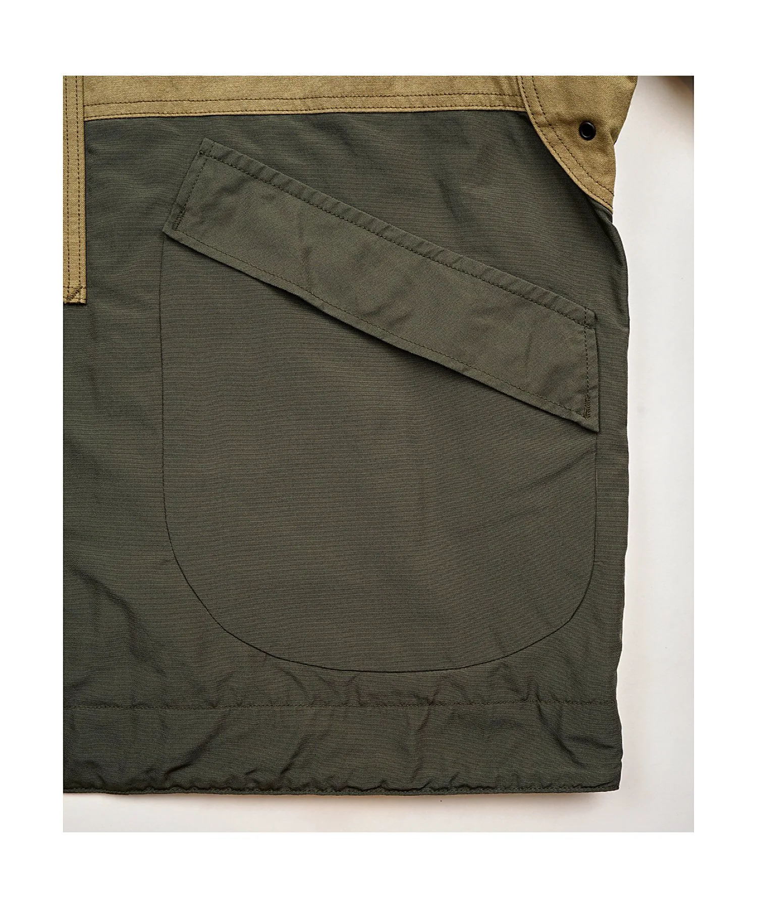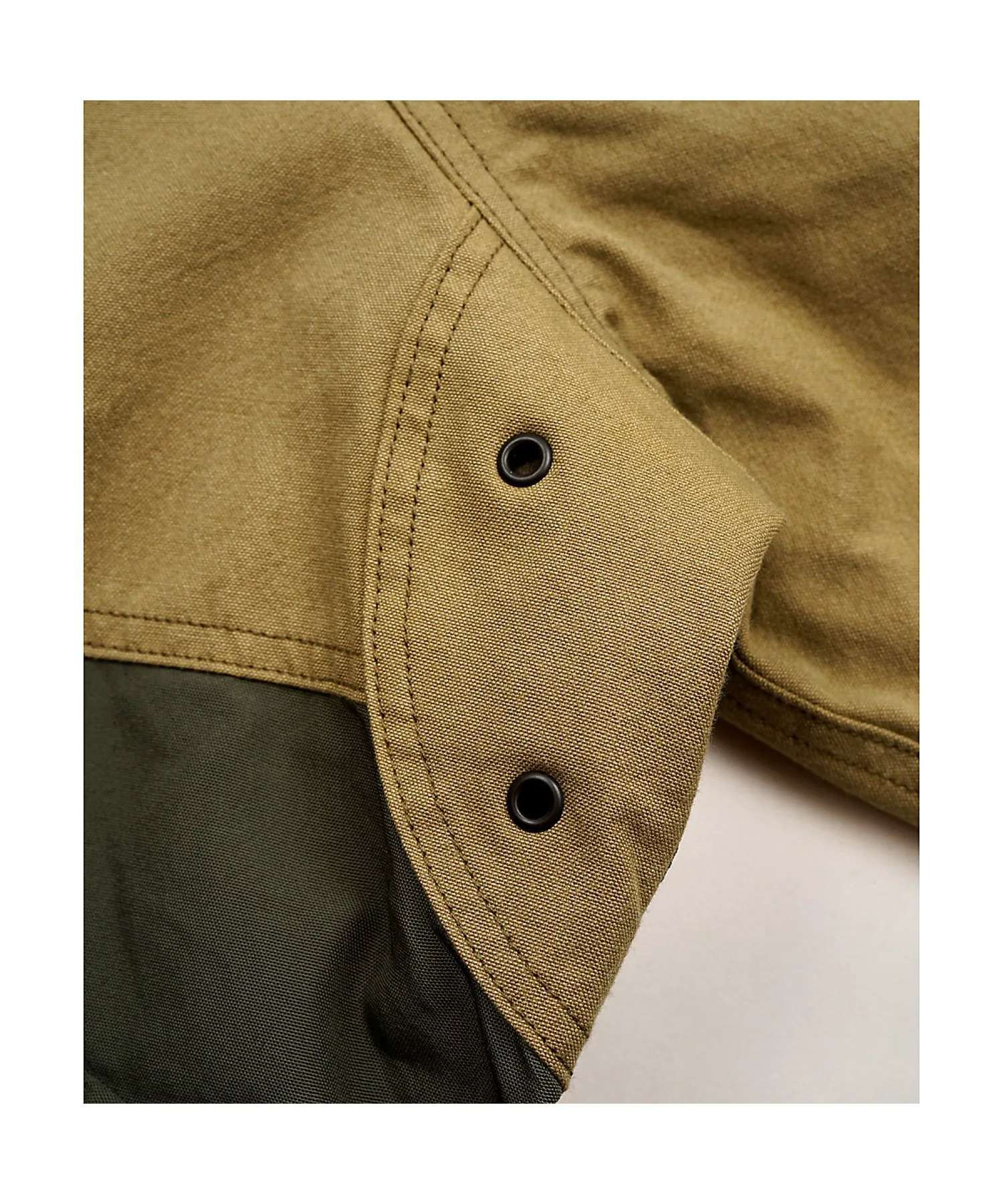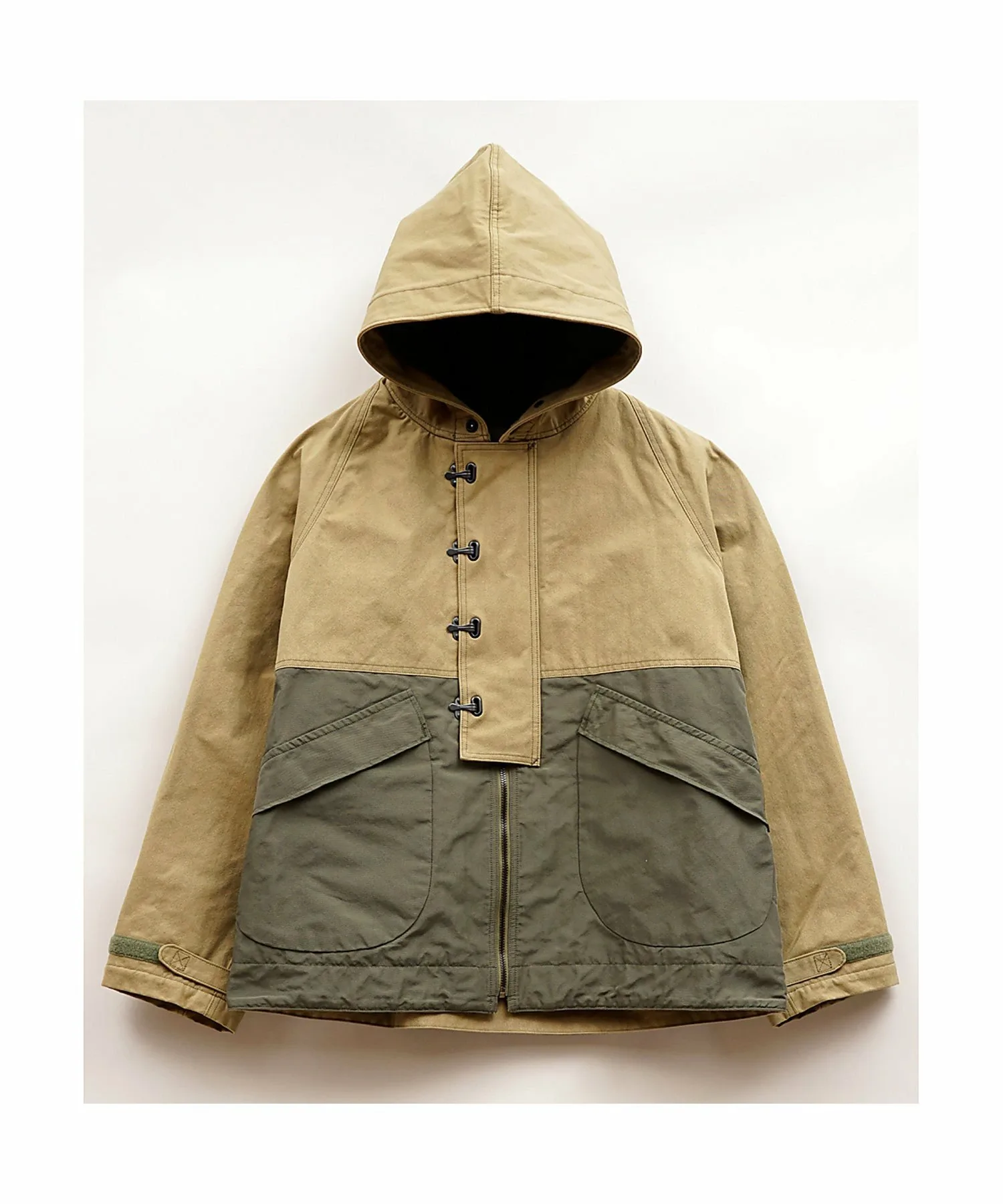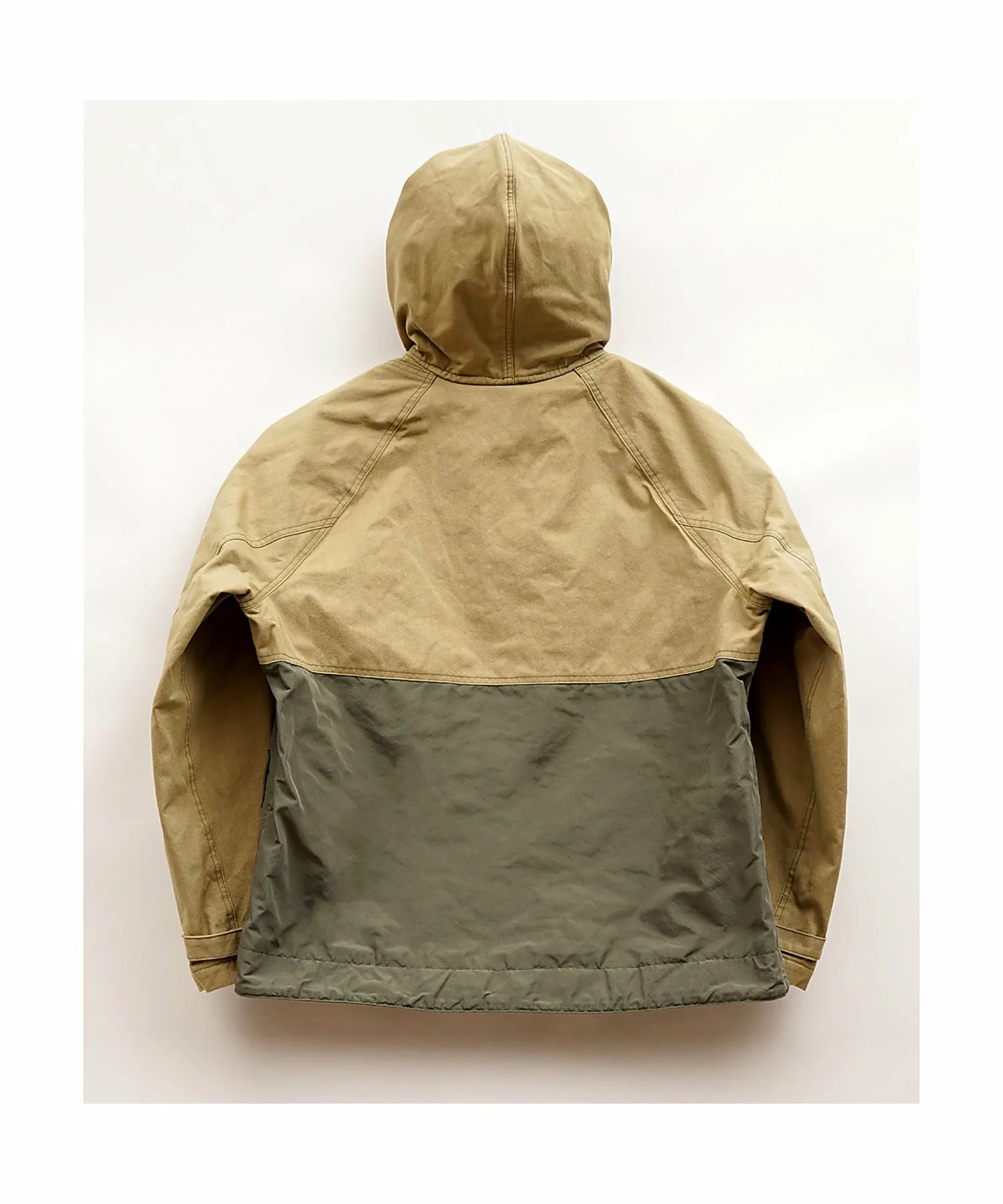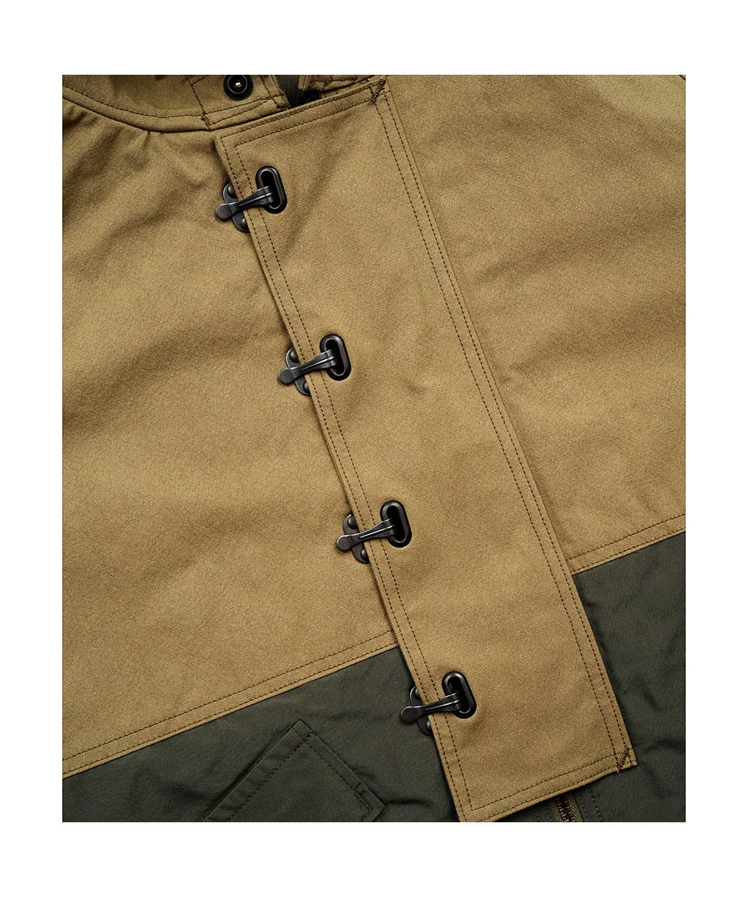 Эта модель, созданная на основе винтажной палубной куртки, искусно сочетает в себе различные элементы. Верхняя часть выполнена из ткани Halftex с её уникальной текстурой, а нижняя — из специального полиэстера, отлично сохраняющего форму. Отличительная текстура и функциональность материалов поражают, в результате чего получается одежда, которая добавляет современный штрих к классическому военному дизайну. Кроме того, шнурки на капюшоне и подоле позволяют регулировать силуэт и обеспечивают улучшенную ветрозащиту. Оригинальная ткань Найджела Кабурна, «HALFTEX», — это высокоэффективный материал, разработанный в соответствии с концепцией «100% нейлон, максимально приближенный к хлопку». Нейлоновые нити, обычно представляющие собой длинные волокна, намеренно разрезаются на короткие волокна. Полая структура, создающая сердцевину, обеспечивает характерную пышность, ощущение сухости и текстуру, напоминающую натуральные материалы. Обладая естественной текстурой, неотличимой от нейлона на первый взгляд, она сохраняет преимущество нейлона в легкости. Как указано на этикетке, она примерно вдвое легче хлопка.